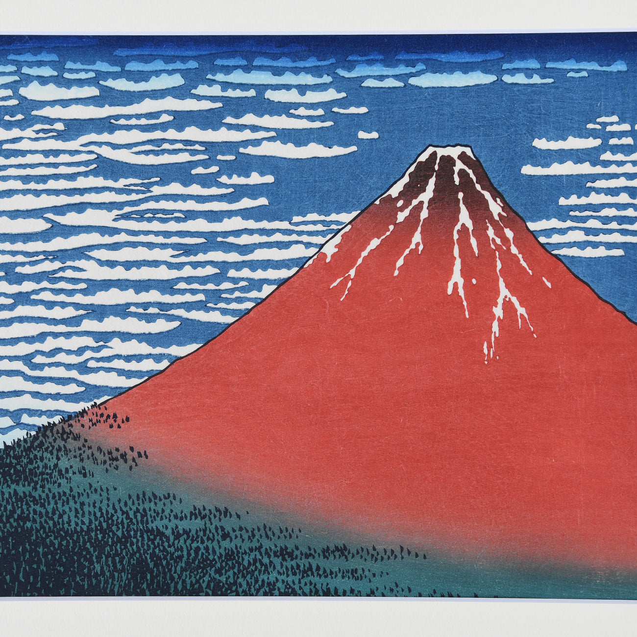 He also studied techniques from both Chinese and Western painting, incorporating shading and perspective into his landscapes. These innovations culminated in his masterpiece series Thirty-six Views of Mount Fuji, which includes the renowned "South Wind, Clear Sky"—also known as the "Red Fuji."