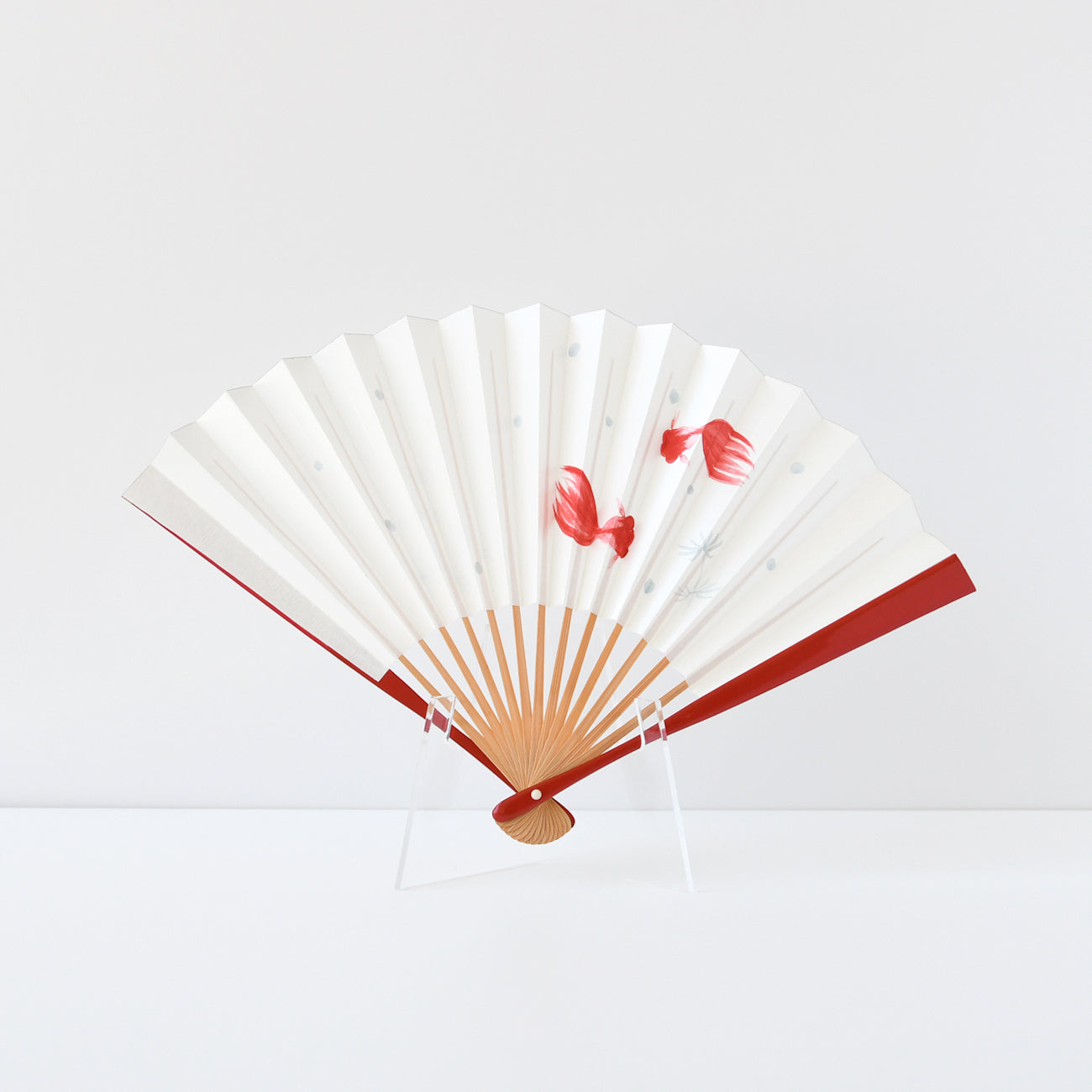 This is a Kyoto folding fan with two goldfish happily jumping on the white fan surface.