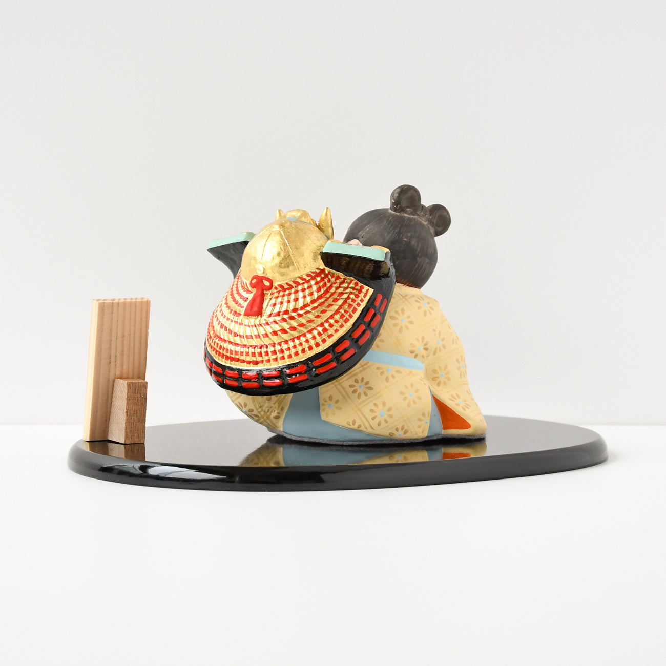 Kyoto pottery dolls for Tango no Sekku. It is a May doll in which a smiling boy holds up a helmet decorated with gold leaf. The helmet has the meaning of a talisman to drive away disasters such as illness and accidents and to grow strong.