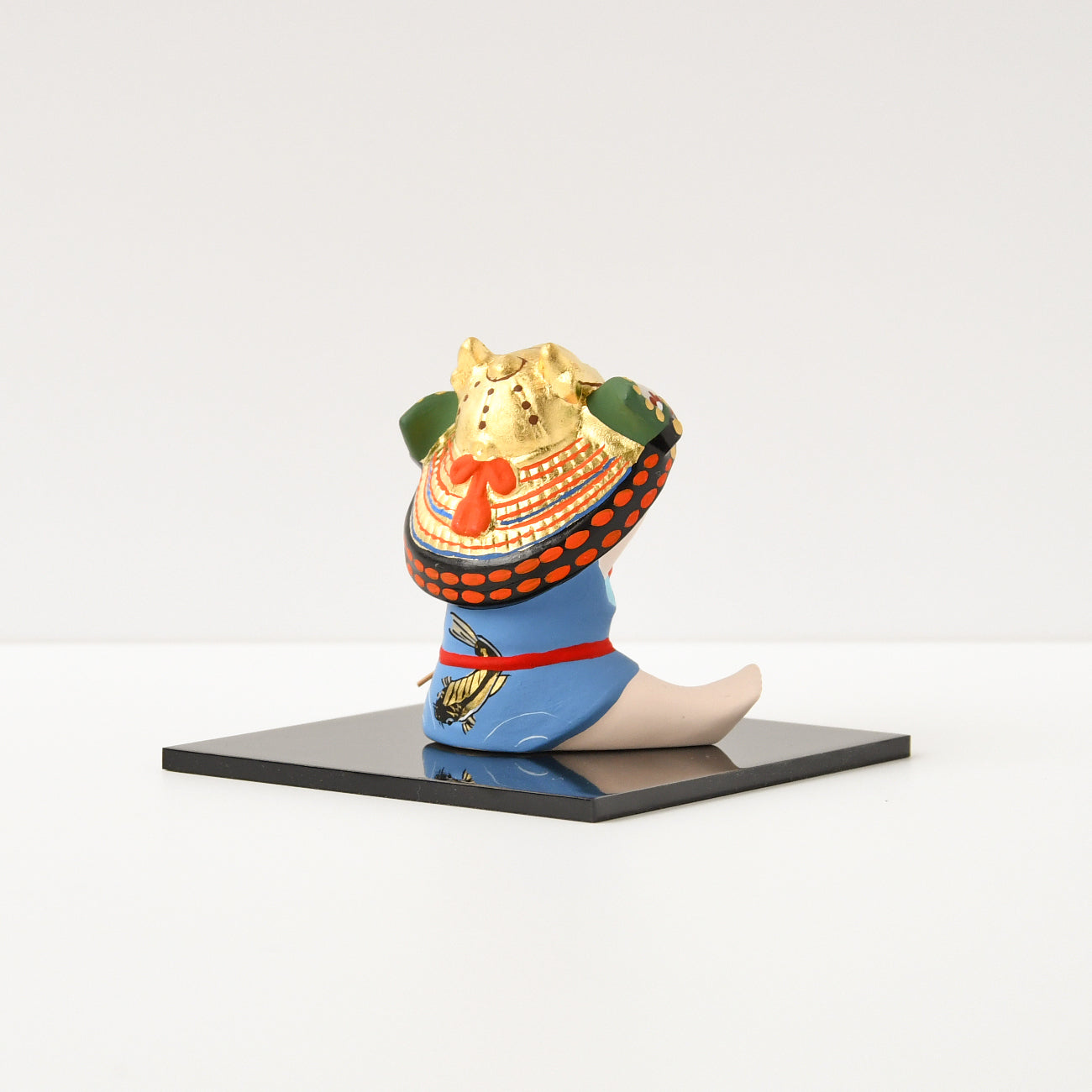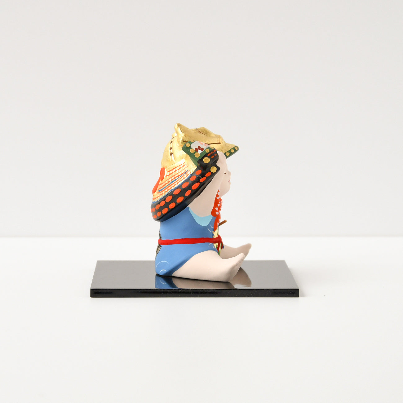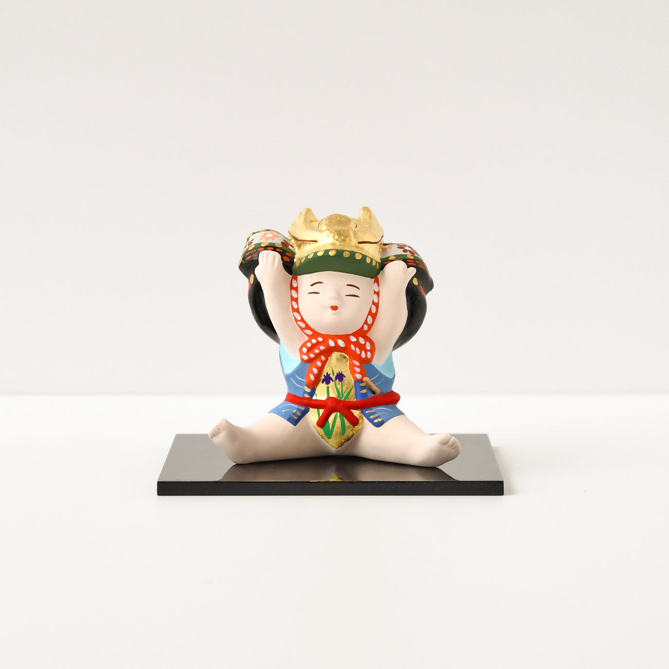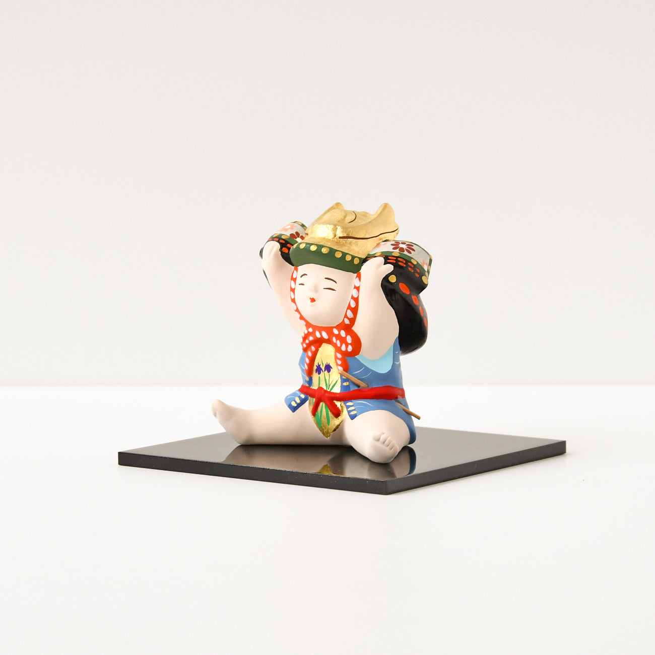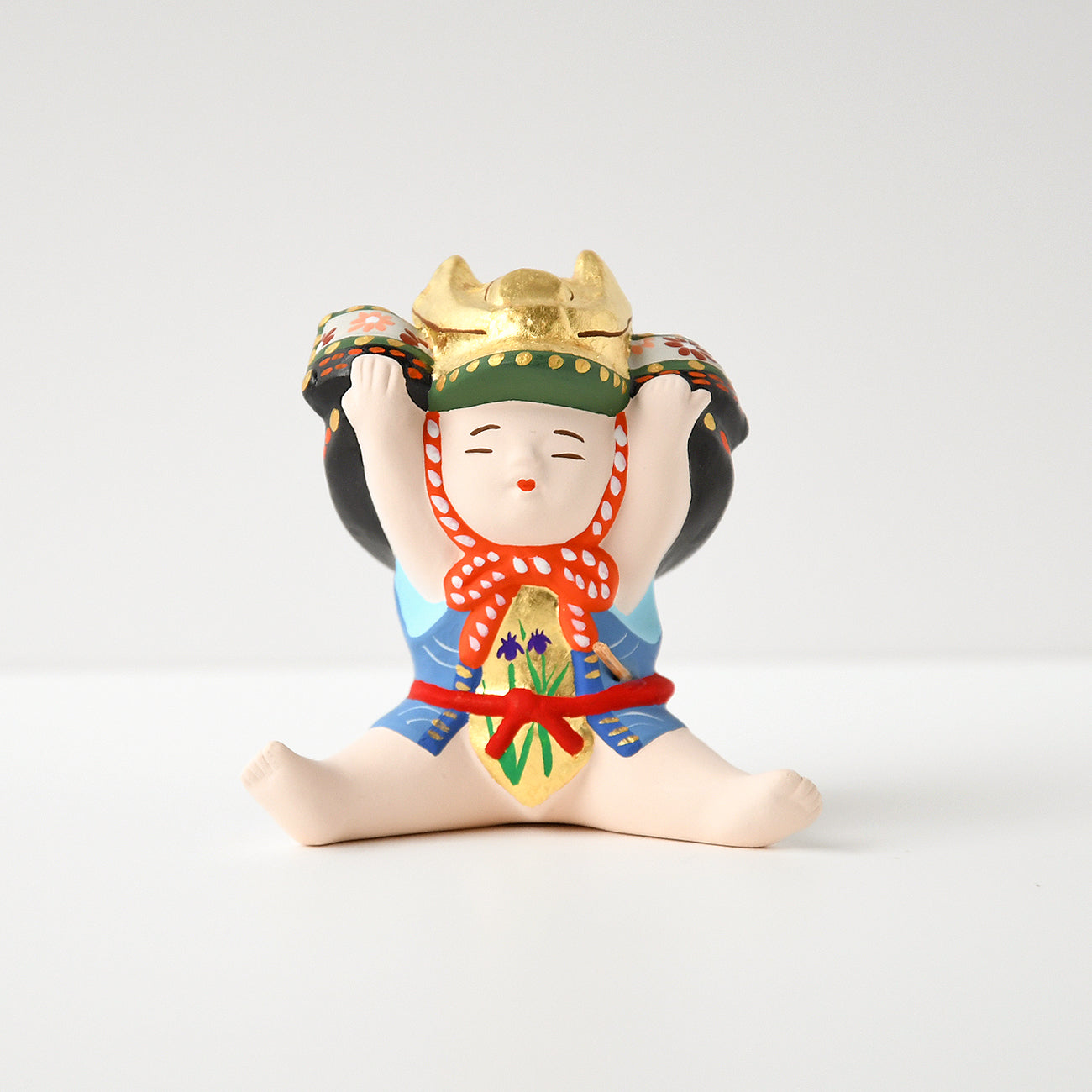 A smiling May doll wearing a helmet decorated with gold leaf.