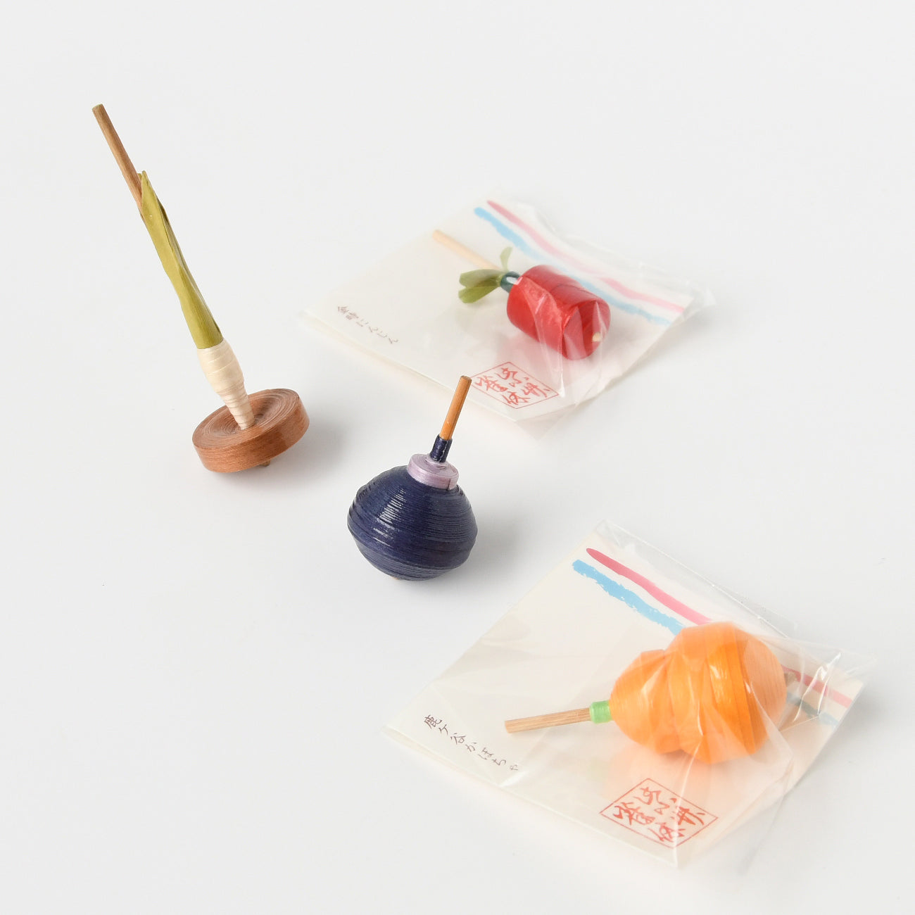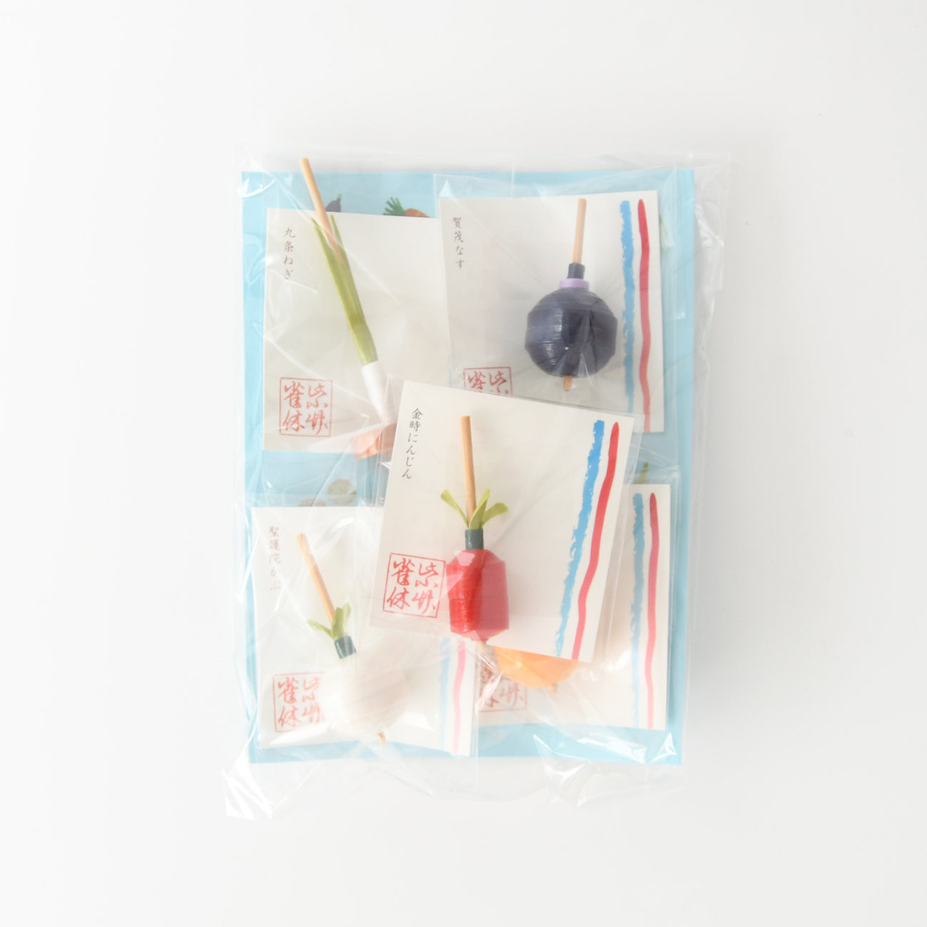 We have created a playful set of tops shaped like Kyoto vegetables (Kamo eggplant, Kujo leek, Shogoin turnip, Kintoki carrot, Shishigatani pumpkin). Not only are they fun to spin, but just looking at them is soothing.