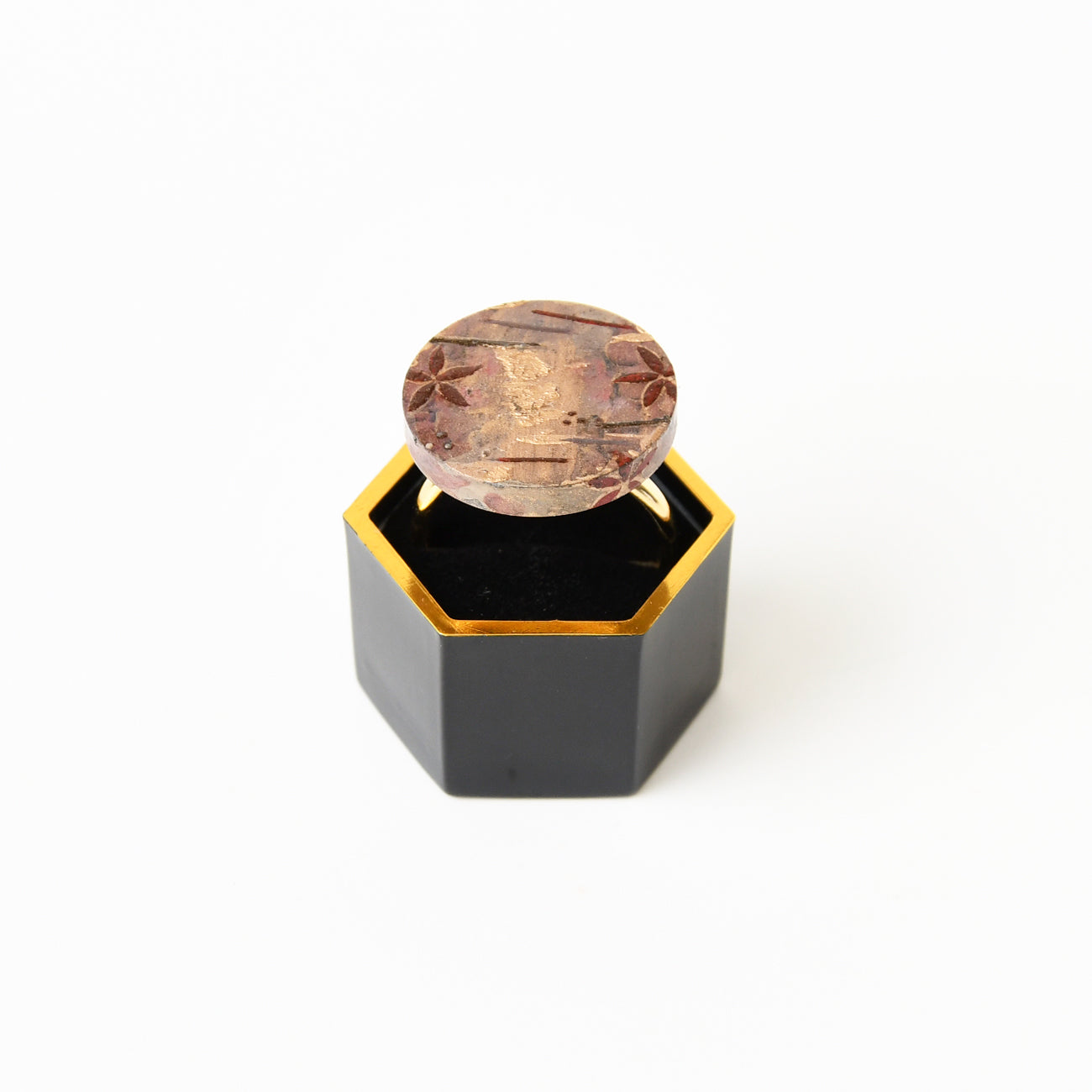漆蒔絵リング「流散花」…薄桃色の丸面に弁柄漆で小ぶりな花を蒔絵技法を用いて描いた漆蒔絵リングです。春を思わす柔らかな風に流されて小振りな花が散る様子を表現しました。