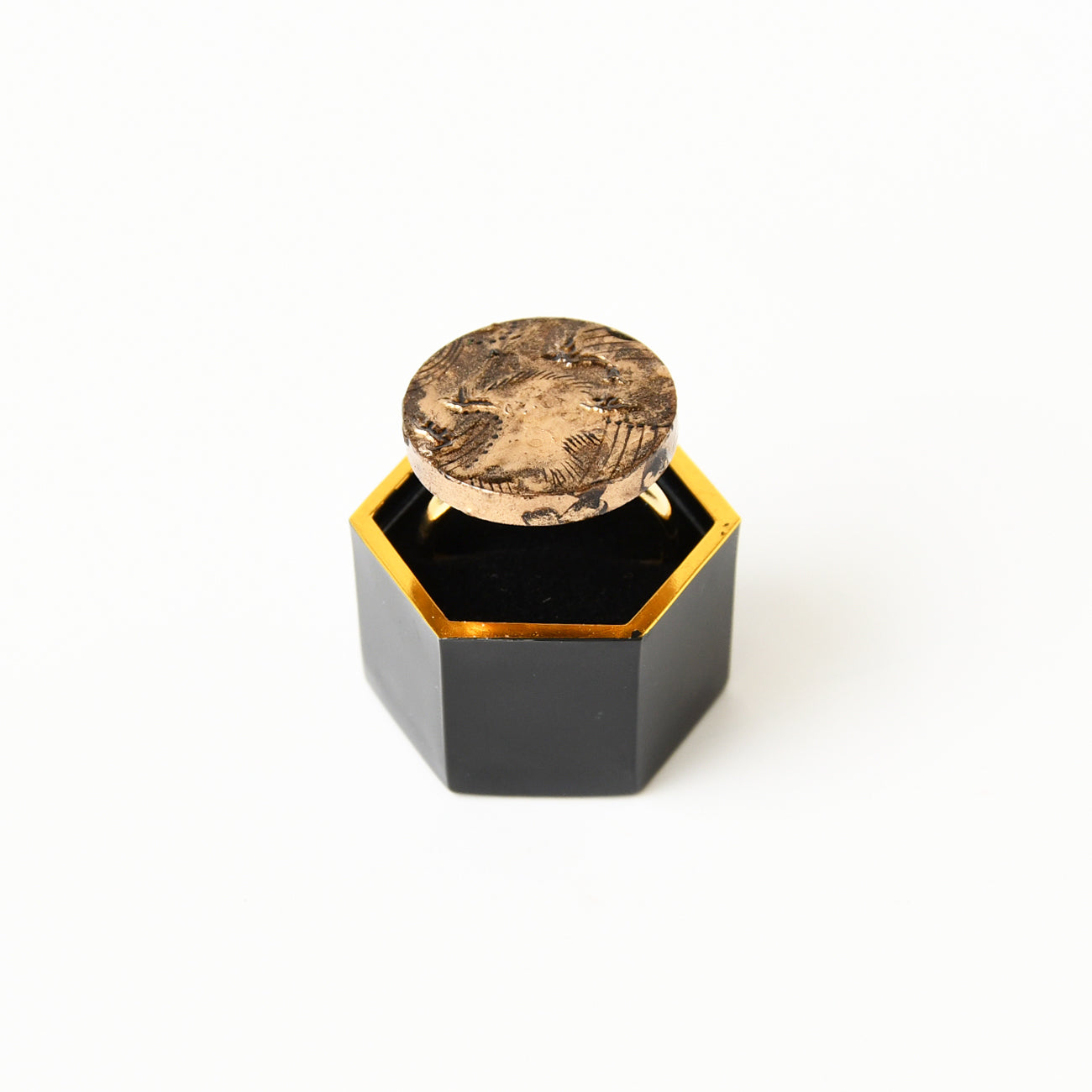 …漆でギラギラと金属のような質感に仕上げた上に黒漆でクレーターなどを表現した漆蒔絵リングです。黒漆の上に真鍮を蒔いており、日常的に使用すればするほど表面が擦れて下の黒漆が現れるようになる、経年の変化を楽しめるものとなっています。技法の特性上絵柄のパターンが一つ一つ異なる仕上がりになります。