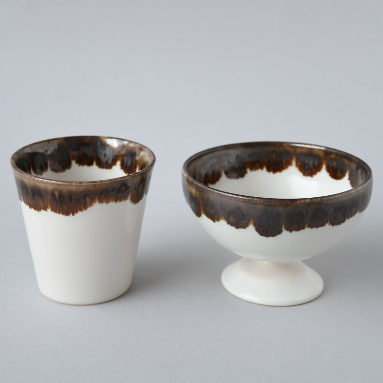 This free cup features an antique brown glaze with an impressive flowing copper glaze. The iron-containing glaze gives it depth and luster.
