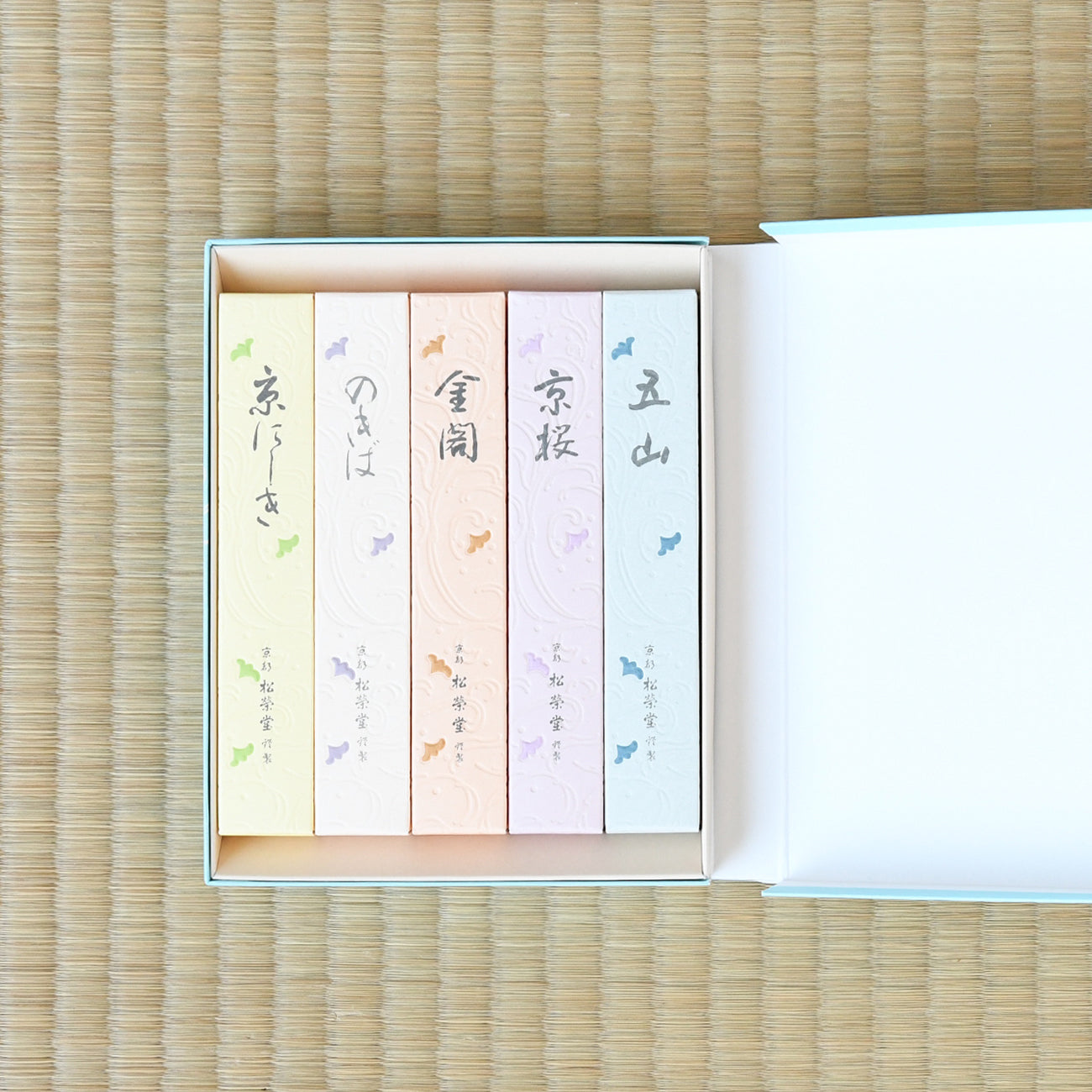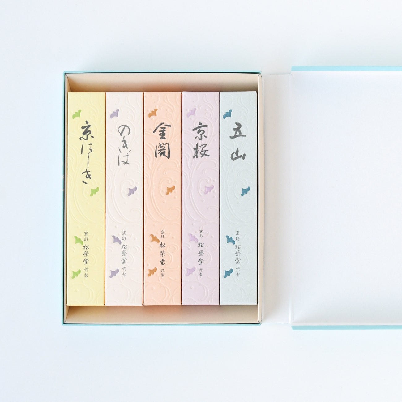 A set of five scents from the "Kyoto Incense" series by the long-established incense maker Shoyeido, which uses plenty of the finest natural fragrances based on sandalwood.