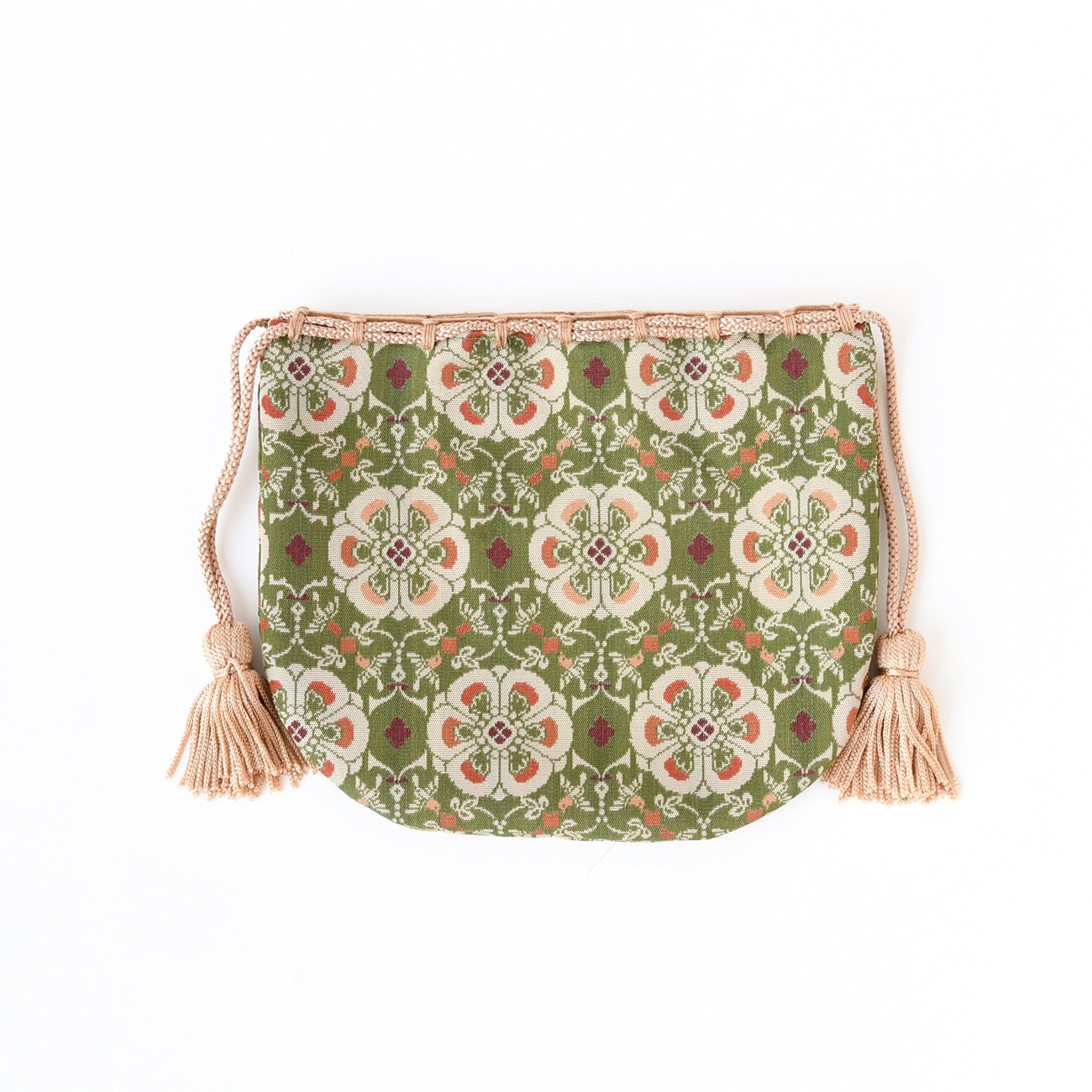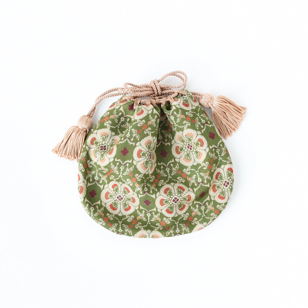 This is a small drawstring bag made from Tatsumura Art Textiles' fabric "meibutsu-gire".