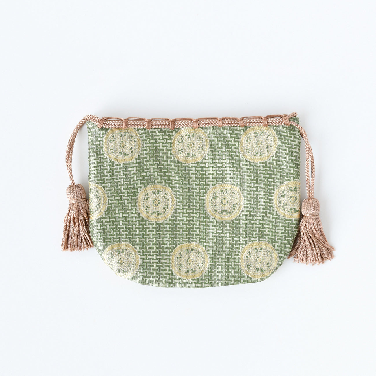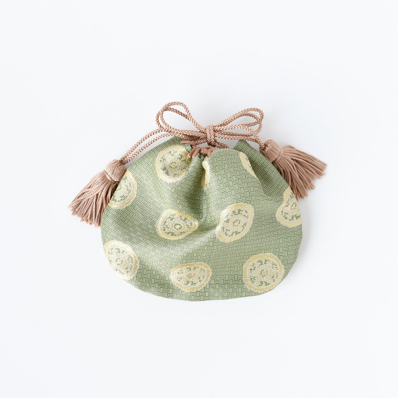 This is a small drawstring bag made from Tatsumura Art Textiles' fabric "meibutsu-gire".