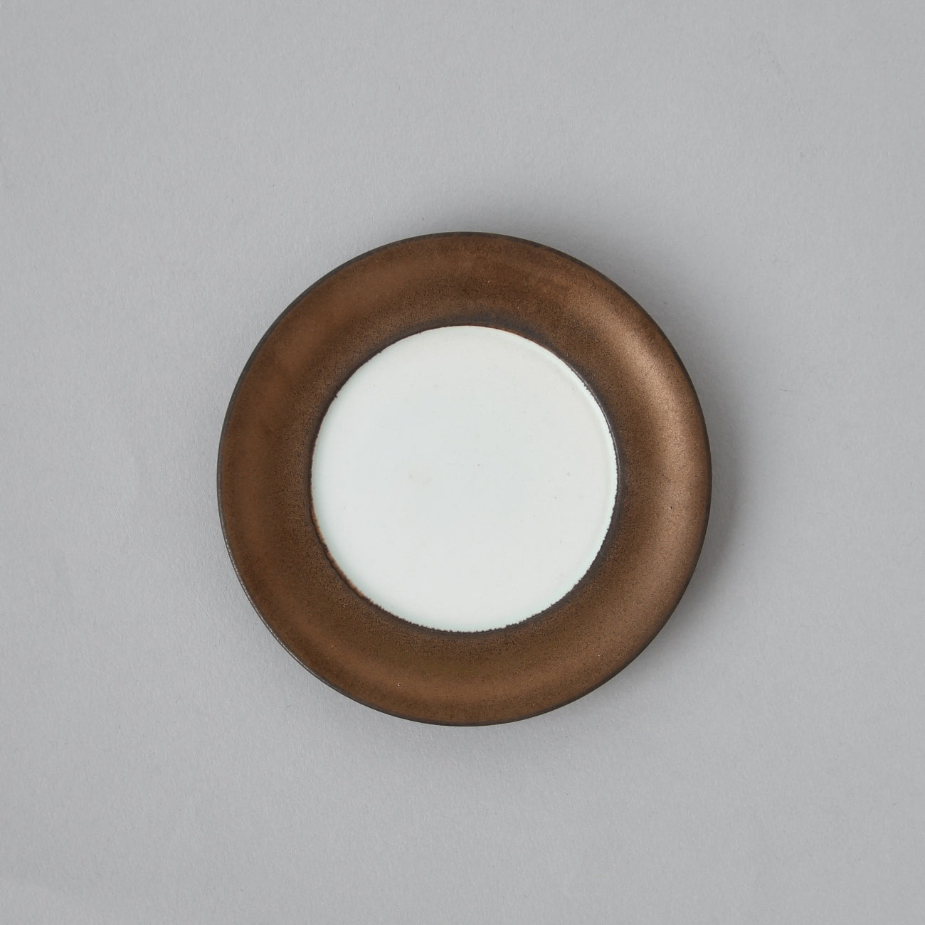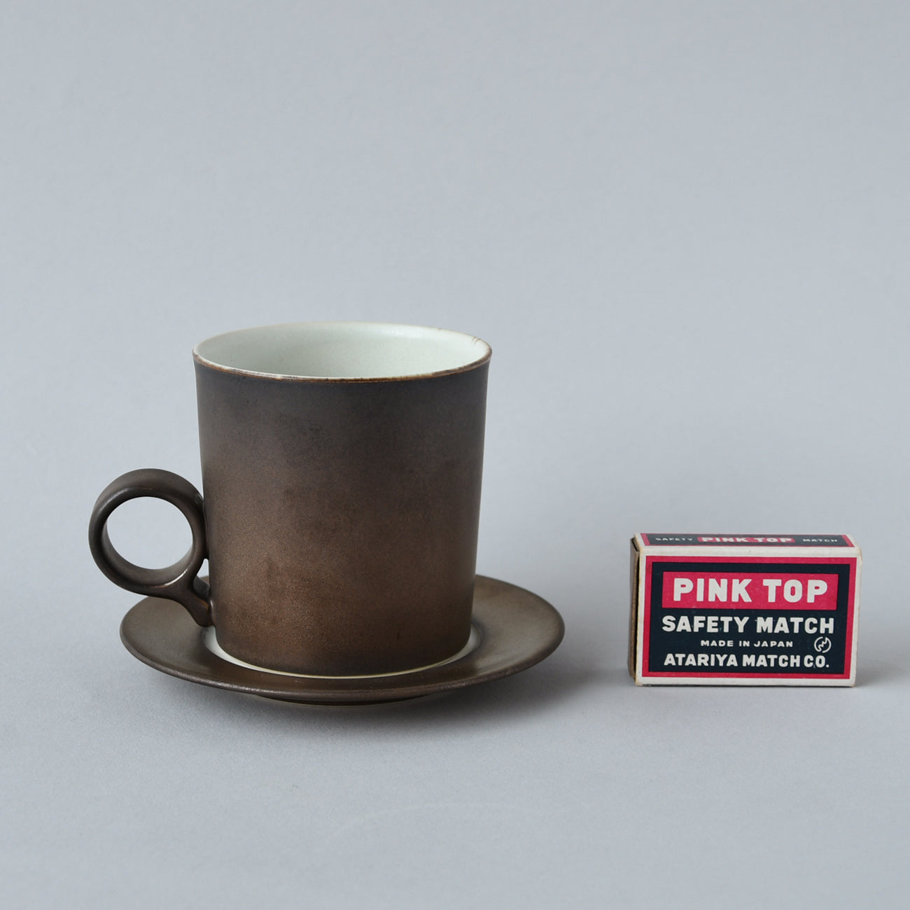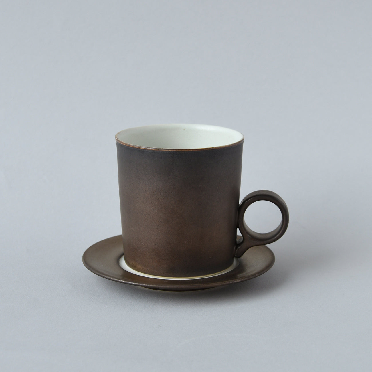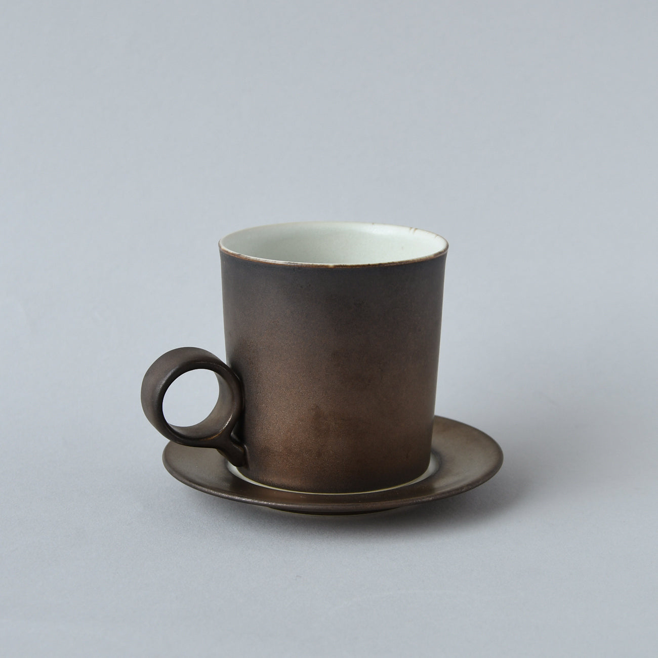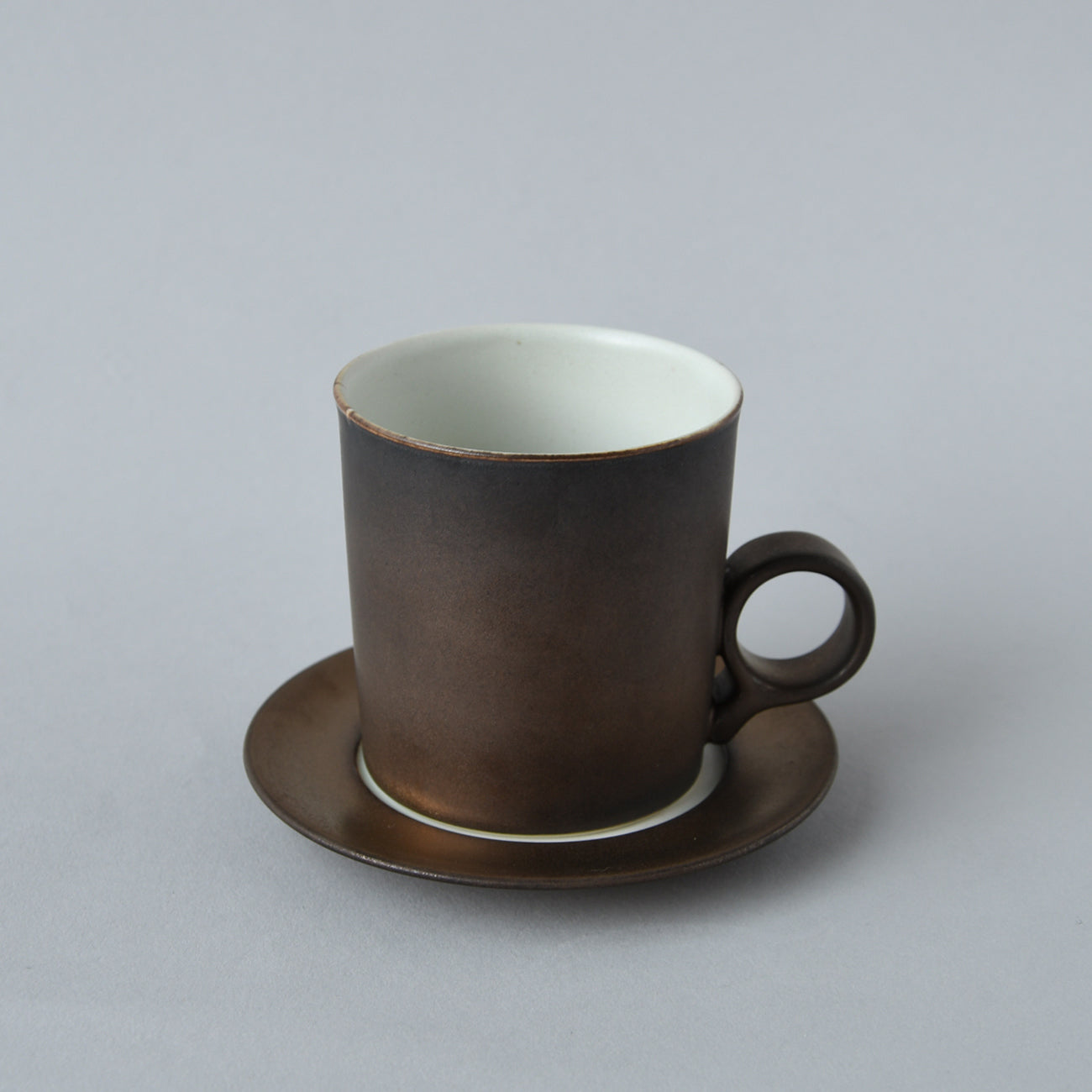 This coffee cup features an impressive combination of copper and white glazes. The color is the result of reduction of the glaze. The deep brown color is It also appears to be a deep gold color .
