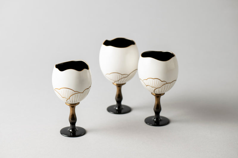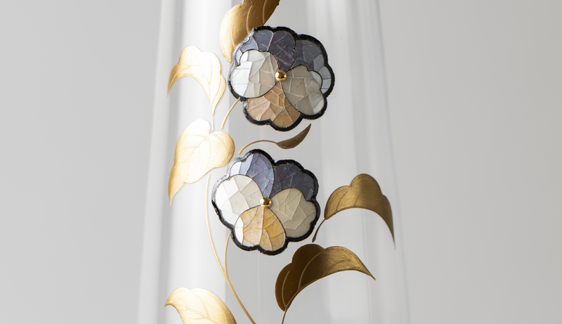 Her Maki-e and Raden Glass applies techniques usually reserved for black lacquer to transparent glass. Using an extremely fine brush, she paints patterns in lacquer, sprinkles gold powder to set them, and inlays delicate shell fragments along the curved surface. The shimmering interplay of gold and iridescent shell under the light represents a completely new expression of lacquerware, long admired as a symbol of the aesthetics of shadow in Jun’ichirō Tanizaki’s In Praise of Shadows (*).