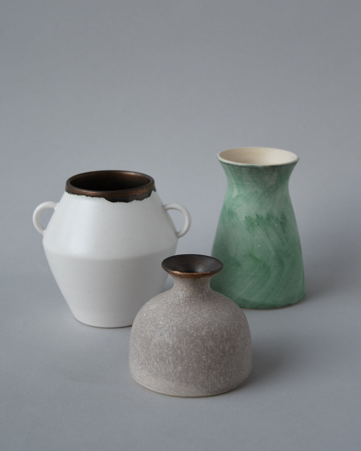 A flower vase with an impressive white and copper glaze. A smooth, matte white finish.
