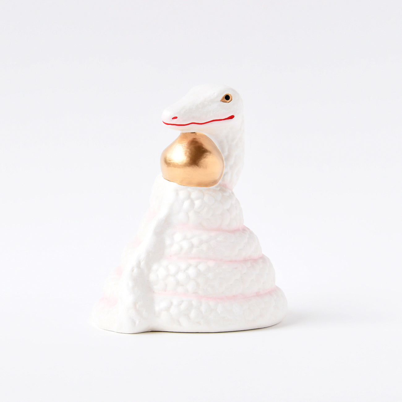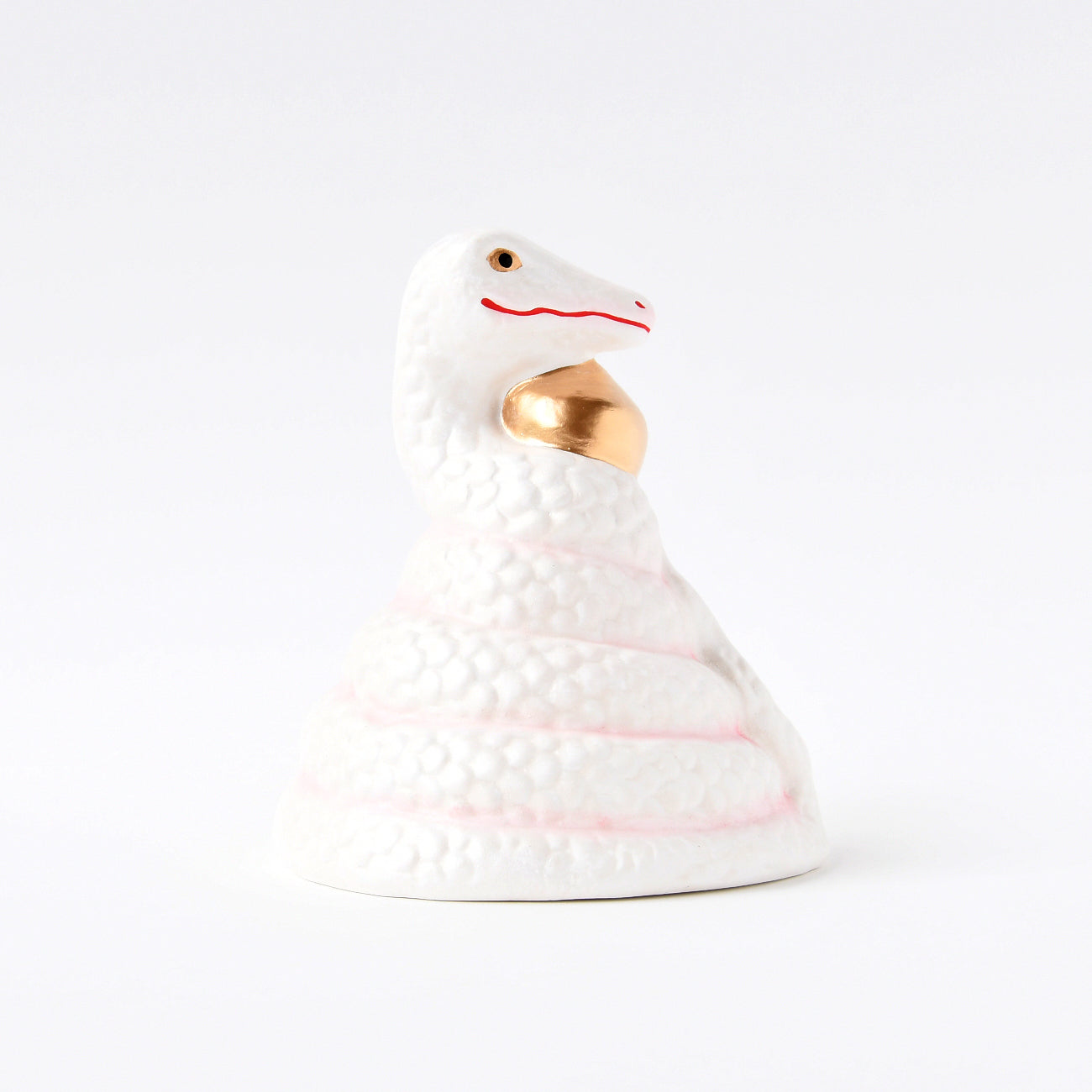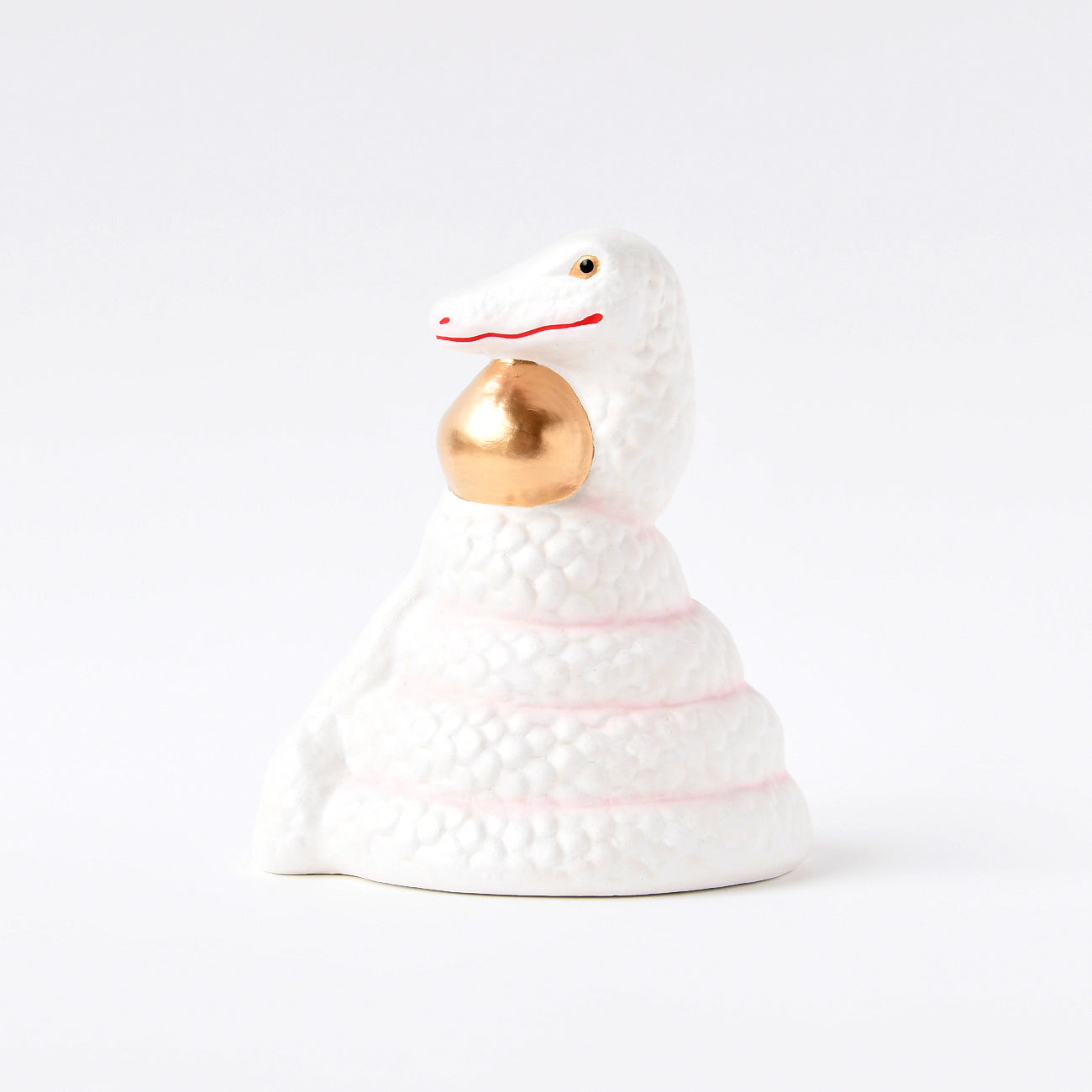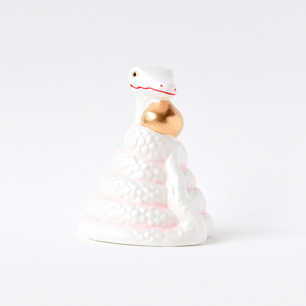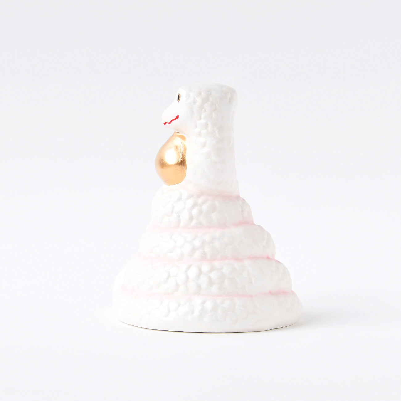 卵でしょうか。まるで宝玉を抱いているようです。ヘビは脱皮しながら成長するため、「生命」や「再生」の象徴とされています。現在でも全国各地でヘビを崇める風習が残っており、ヘビは金運にも恵まれるという言い伝えがあります。