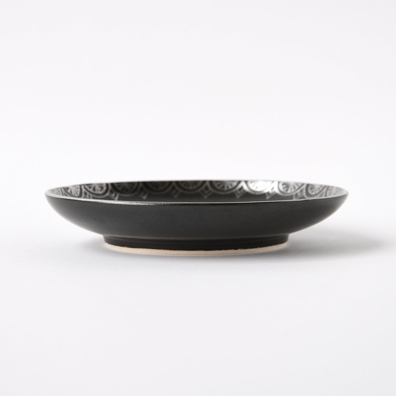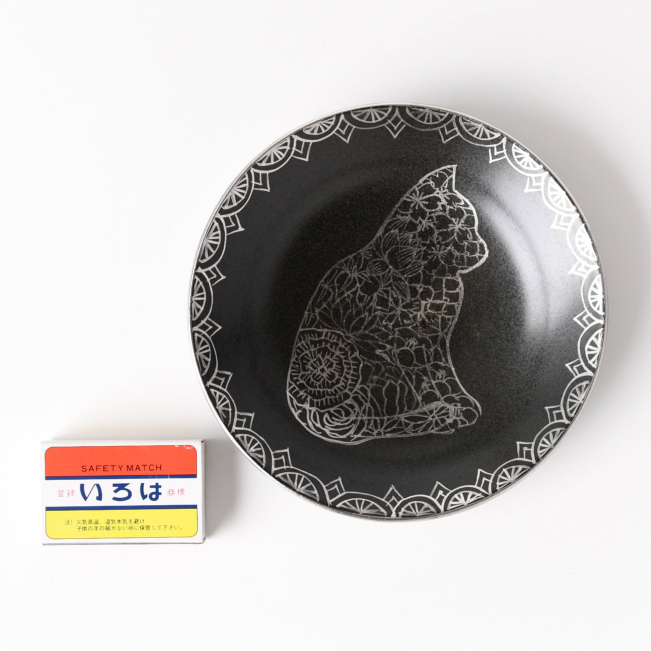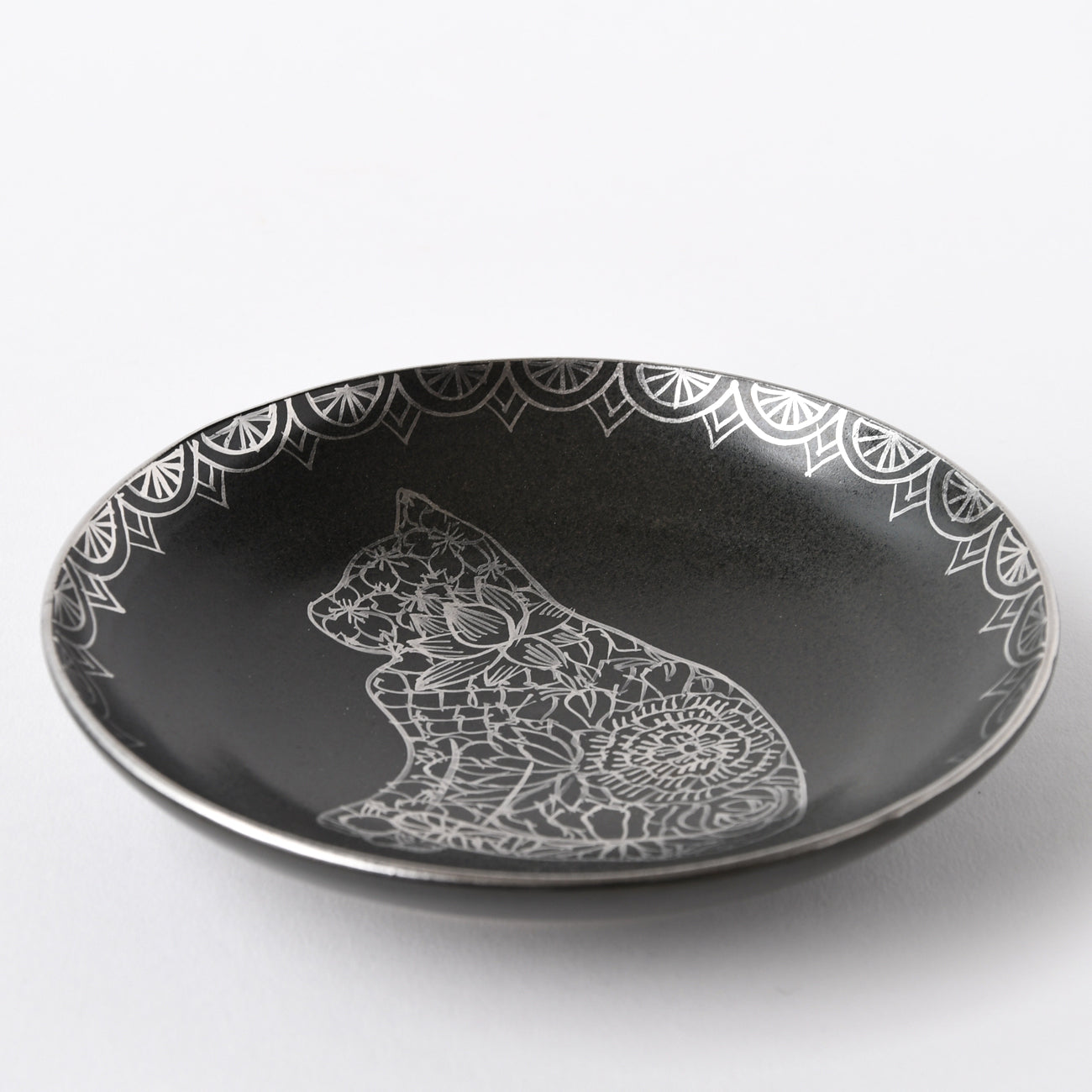 Flowers and Cats A plate with a black matte glaze and platinum-colored flowers in the shape of a cat.