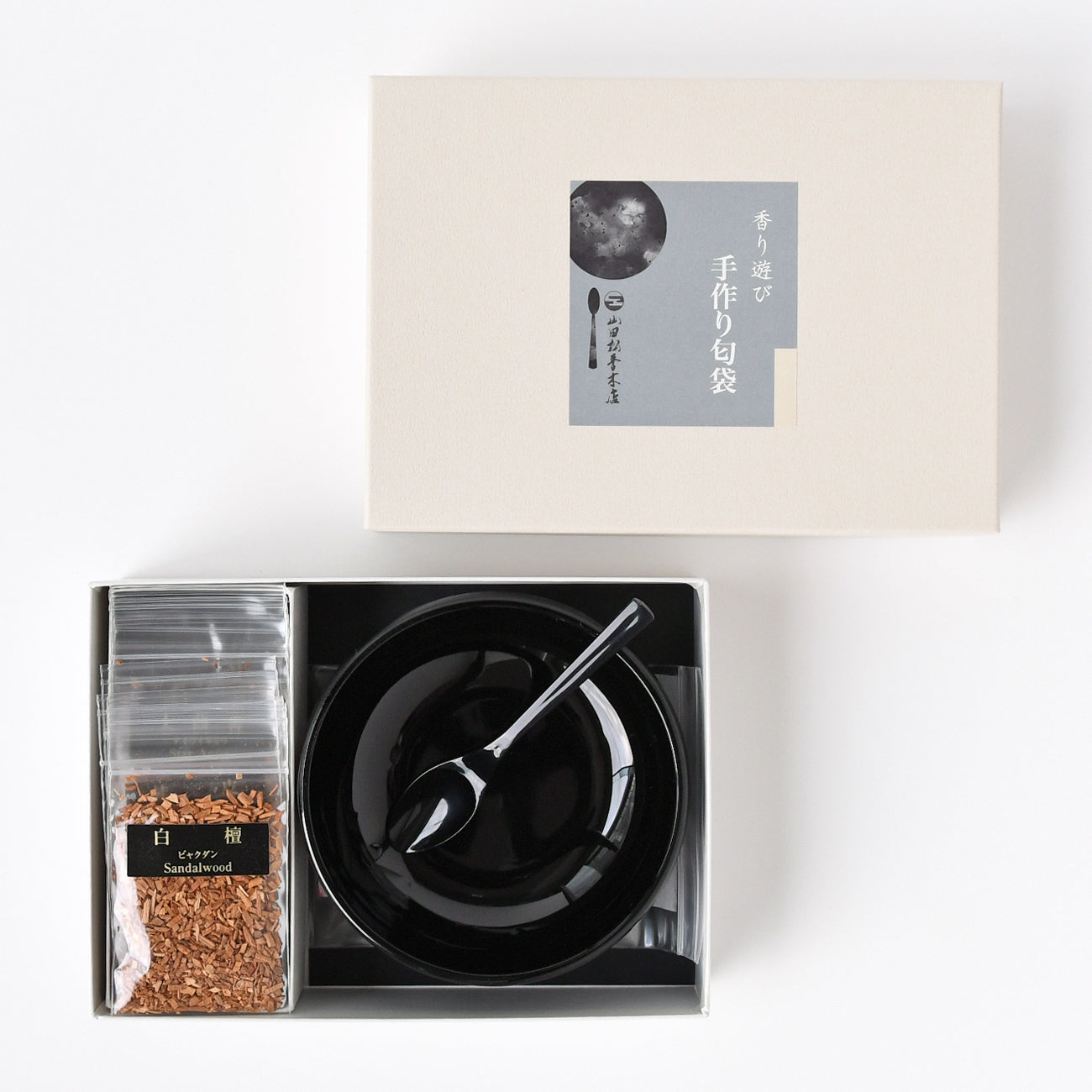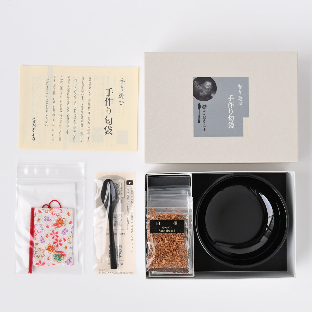 香原料9種類(白檀・丁字・龍脳・桂皮・大茴香・山奈・カッ香・甘松・栂) 匂香・調合用椀・計量用匙・縮緬袋1枚・紙袋1枚等 *縮緬袋の色・柄のご指定はいただけません。