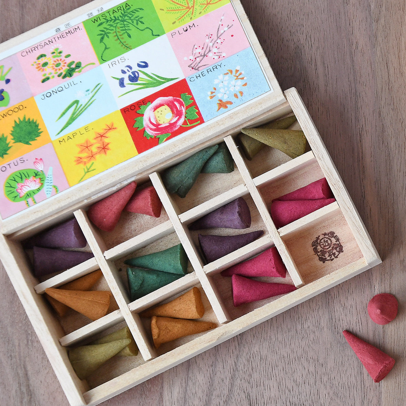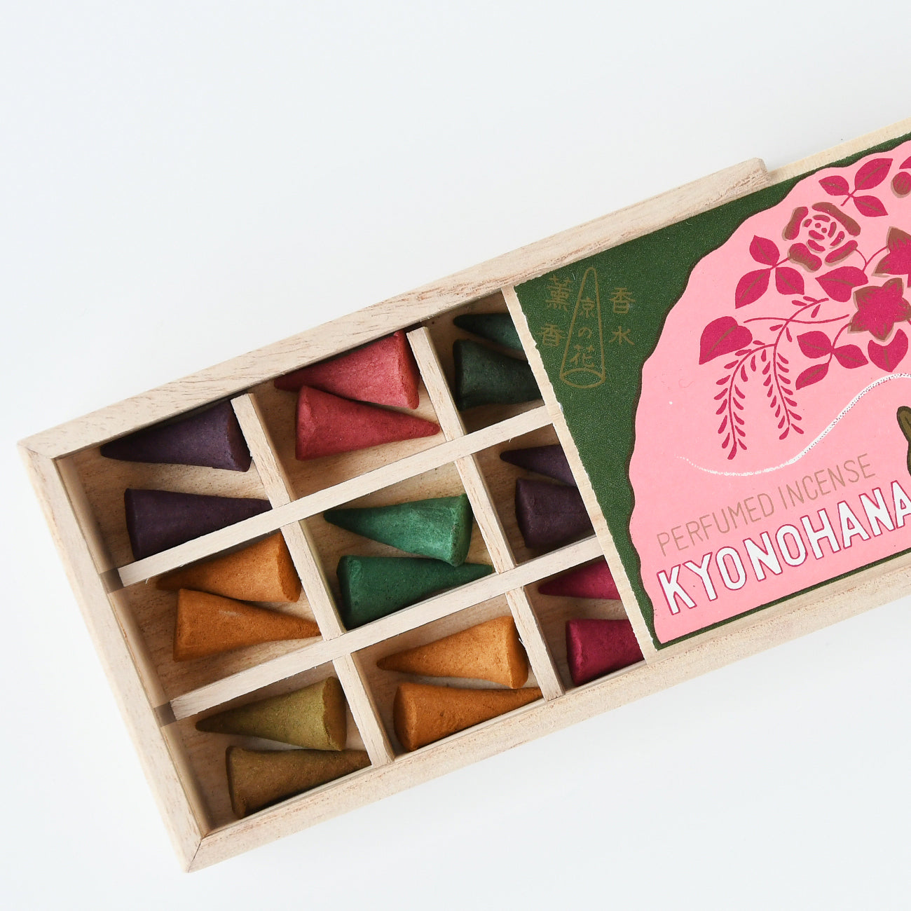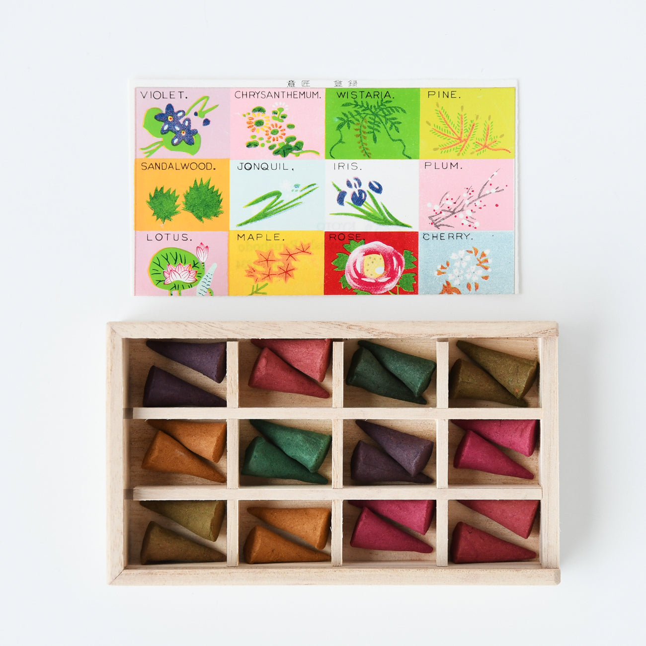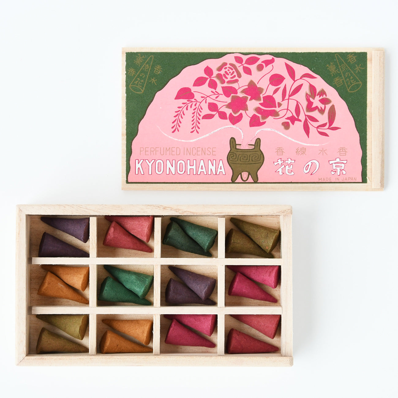 This is a simple cone-shaped "Kyo-no-Hana" (Kyoto flower) Ozashiki incense, filled with a total of 12 different fragrances.