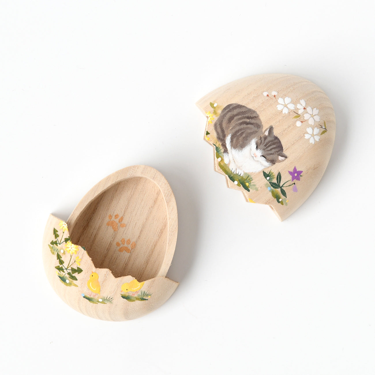 たまご箱の可愛らしいフォルムが特徴の桐箱です。開閉はスライド式。開け口がギザギザなのも人気のひとつ。開けると表の絵に因んだ絵柄が顔を覗かせます。