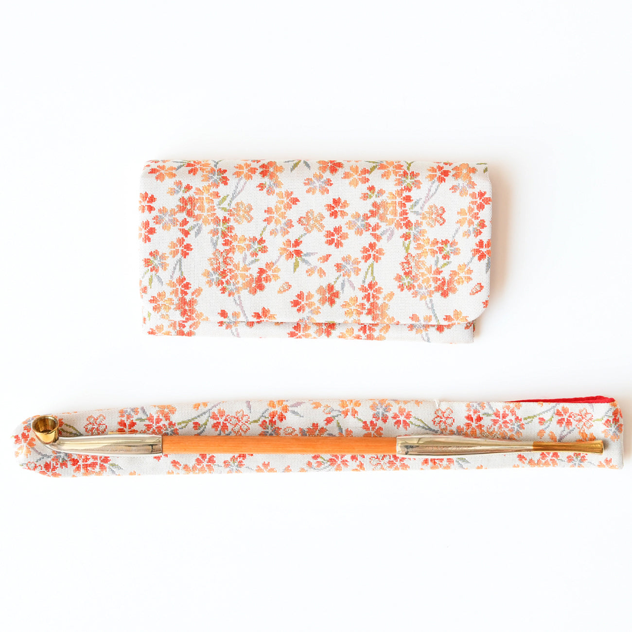 煙管(きせる)真鍮二次洋銀上宮と、煙管入れと煙草入れのセット。西陣織の可憐な可憐な桜柄です。