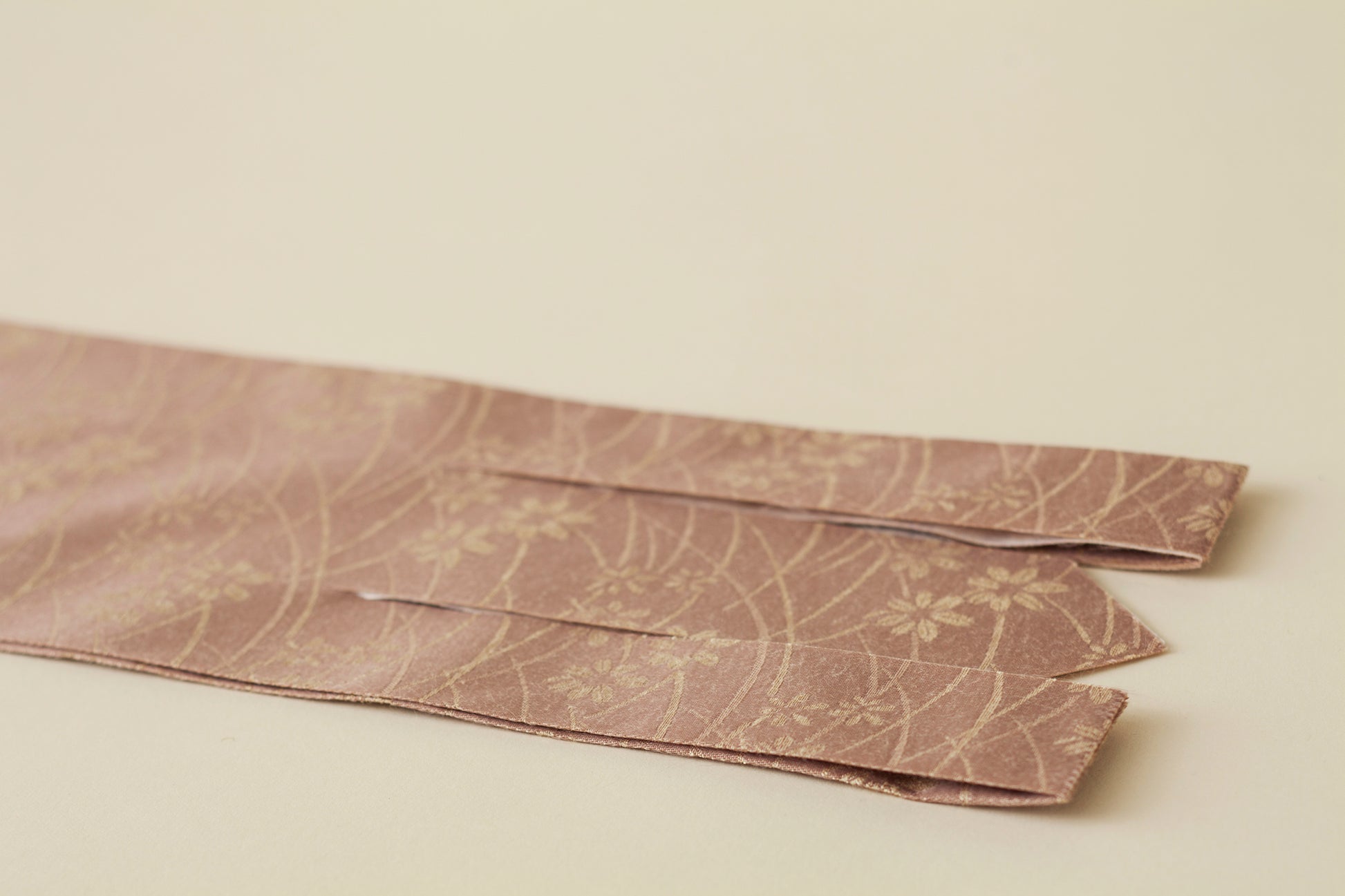 Fold the center of the tip of the sword into a mountain fold and tie it to a ribbon to complete the style.