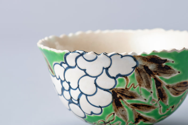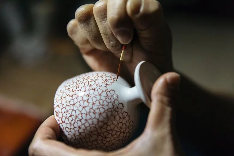得意とする技法のひとつが「描詰(かきづめ)」。同じ文様を、同じ大きさ、同じ濃さの色で描き連ねていくのですが、特に桜の美しさは格別……! 周囲に咲き広がるように描いていく花弁には、ふわりと匂い立つような色気が漂います。根気も時間も要する作業ですが、一本一本の線には、絵付けをこよなく愛する丹影さんの思いや喜びがにじみ出ているよう。