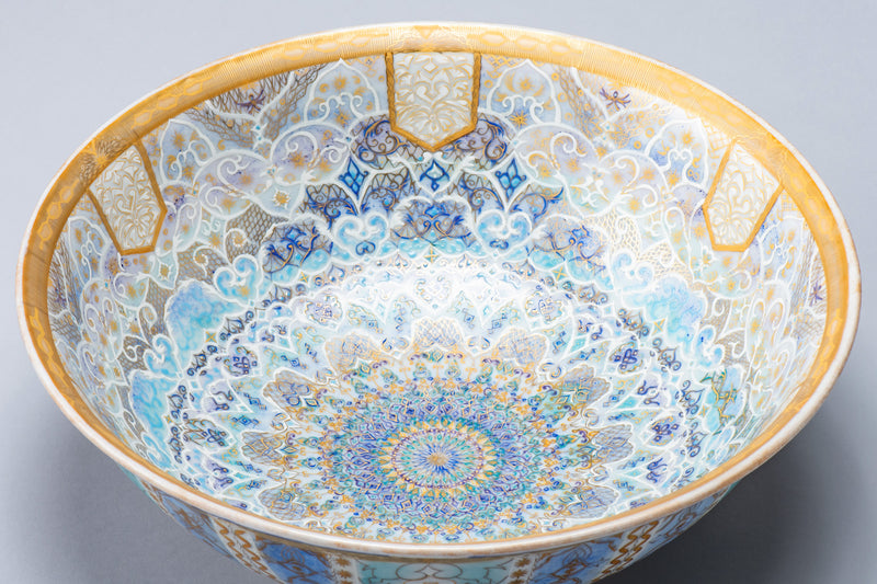 丹影さんは、京都伝統産業ミュージアムが主催する「京都クラフトアンドデザインコンペティション(TRADITION for TOMORROW 2024-2025)」で社長賞を受賞しました。新たな表現に挑戦し、「Hologram(ホログラム)」と名付けた作品は、まばゆい輝きを放つ口径33cmの大鉢。まるで細密画のような緻密さで、アラベスクや西アジアを思わせる文様をびっしりと描いています。