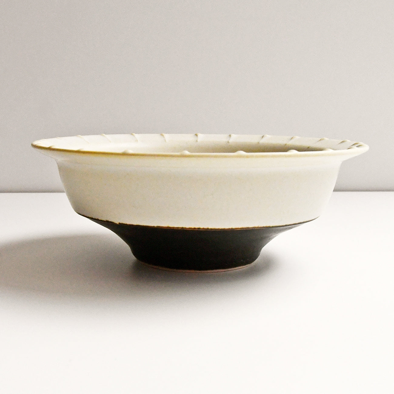やわらかな質感に、縁にはイッチンで均一にかざりつけられています。高台から底の部分には、釉薬がかけられ、あたたかみも感じられます。