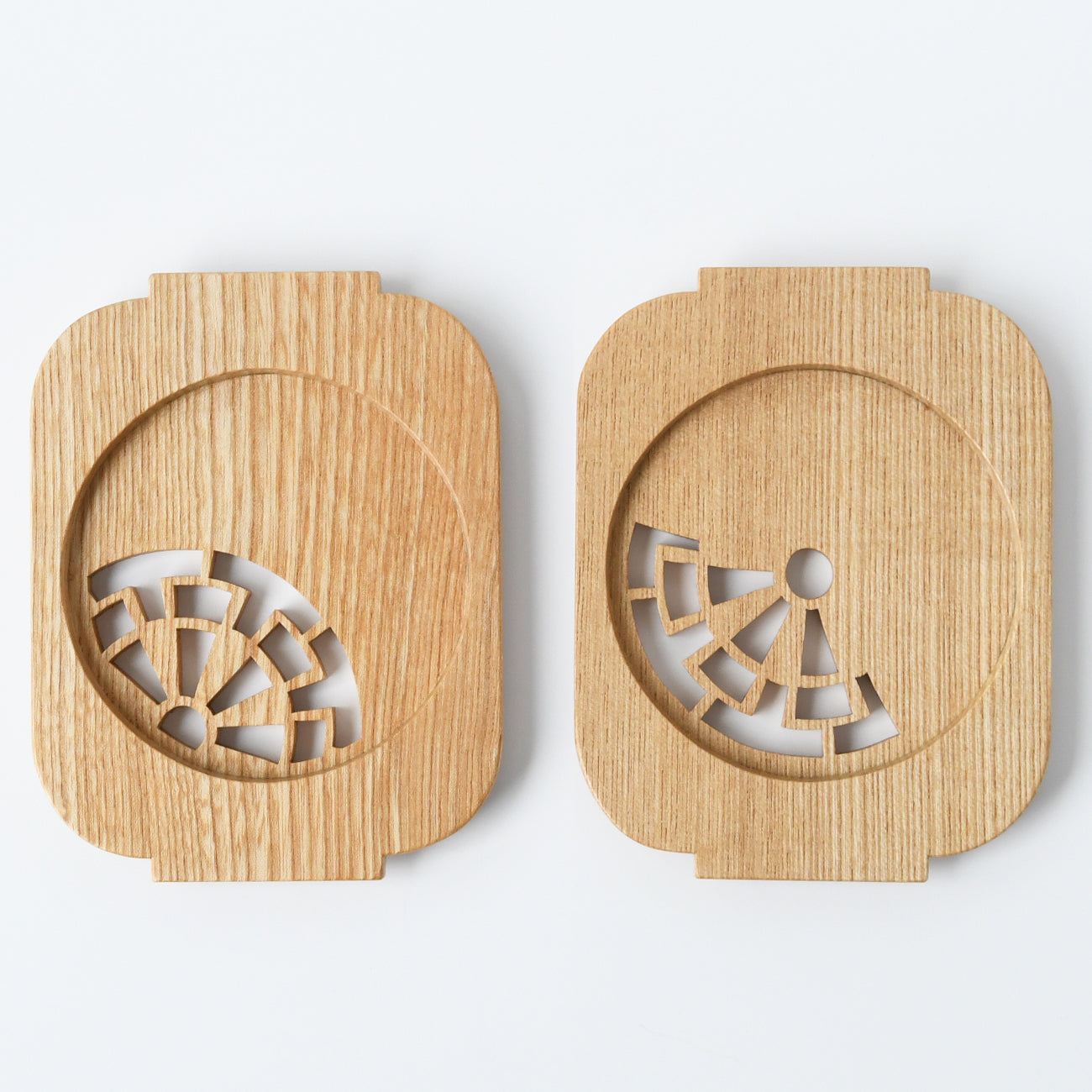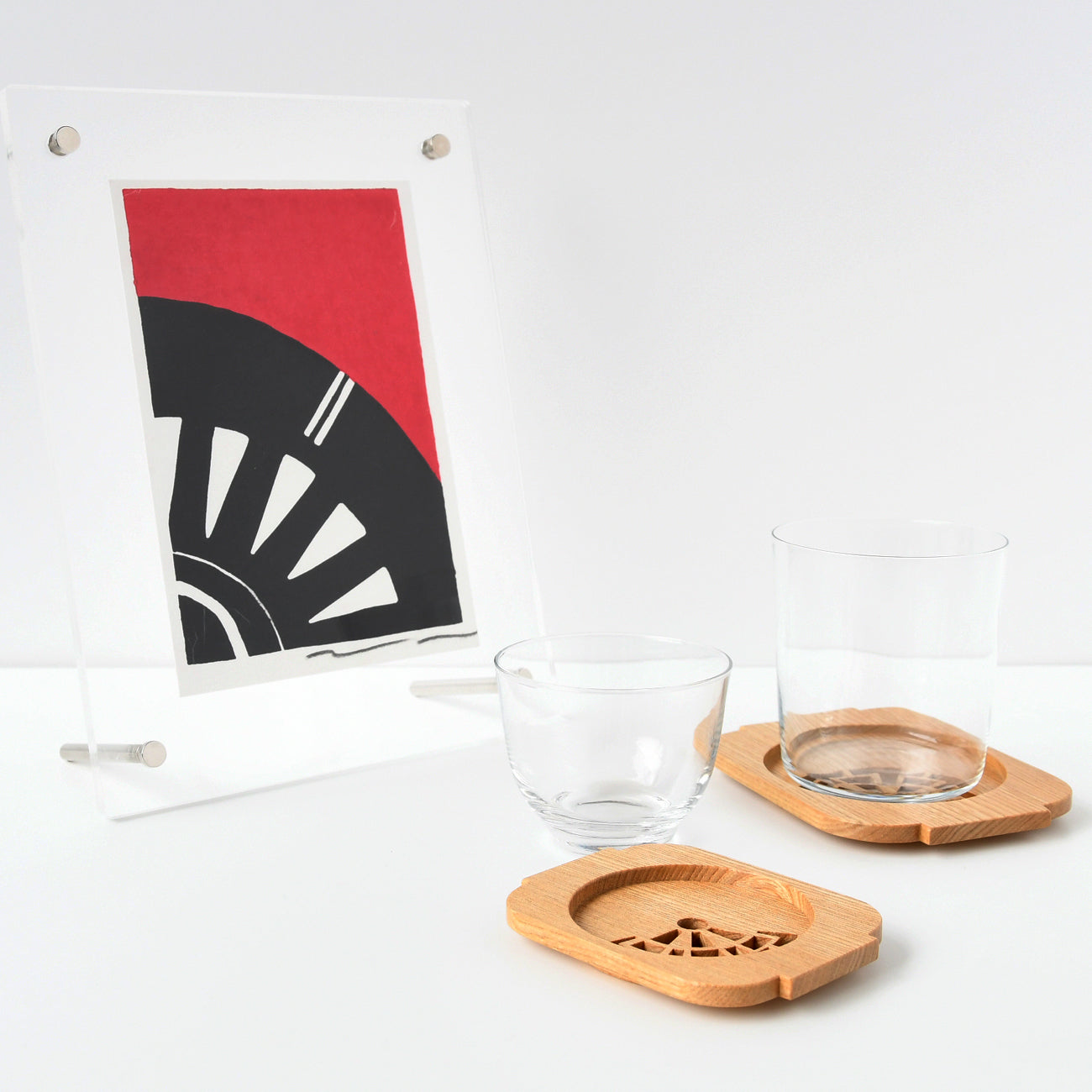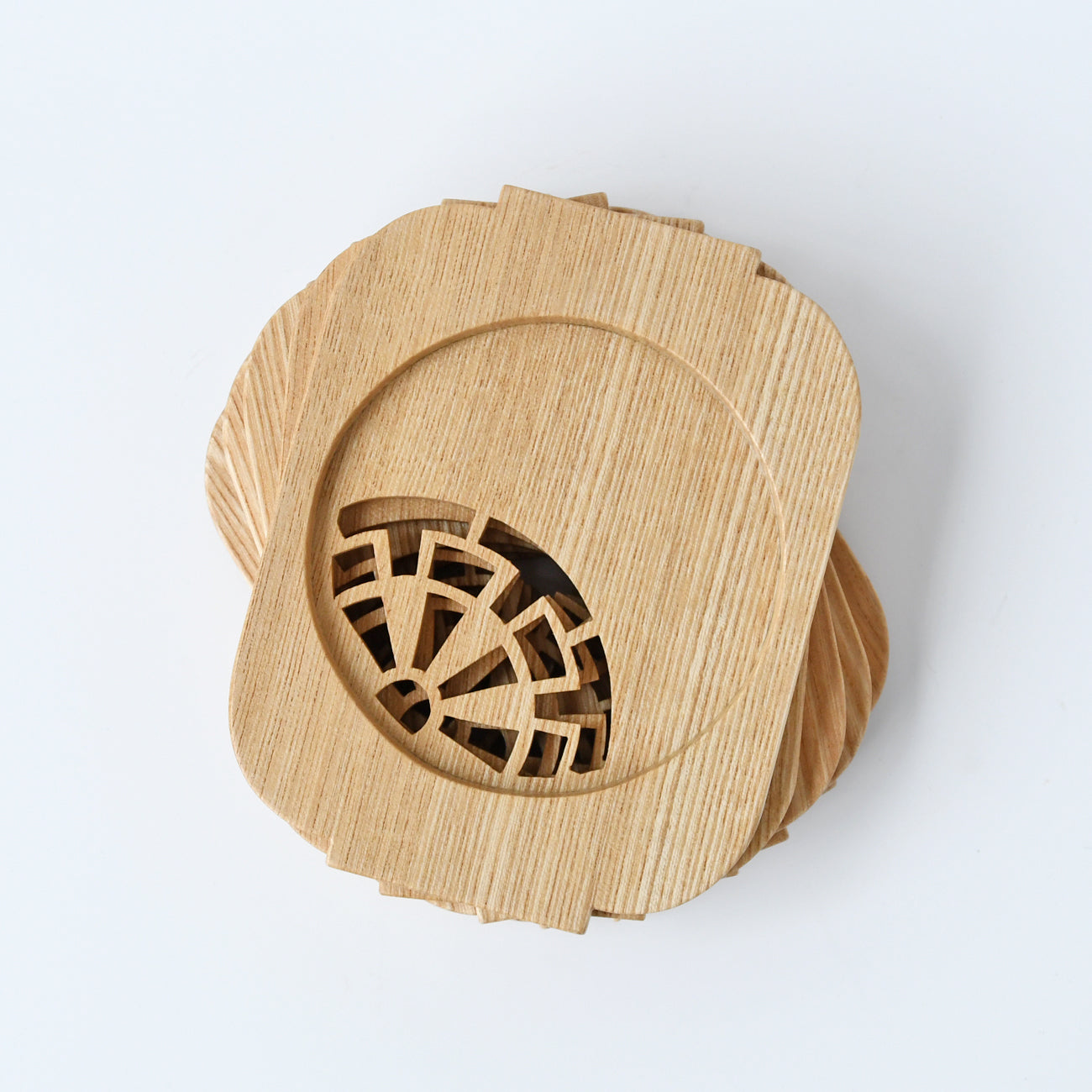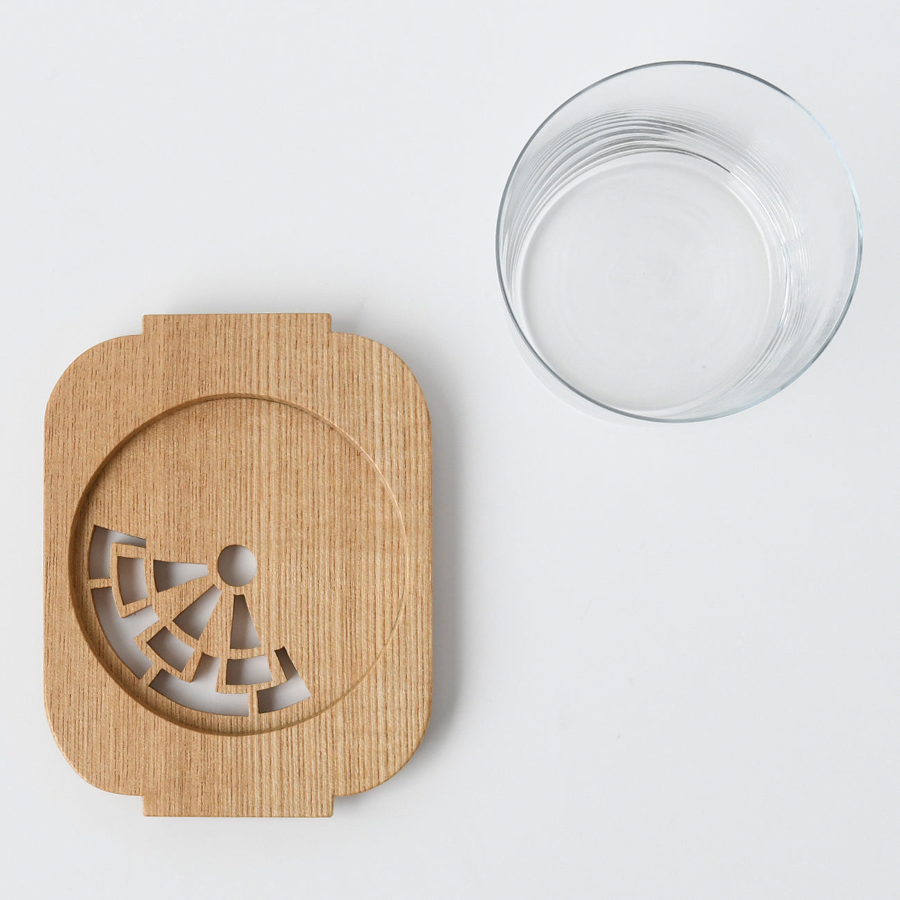 底のくり抜きはデザイン性だけでなく、マグカップやグラスの平らな底とコースターとの接着面を少なくすることで、くっつくのを防ぎます。