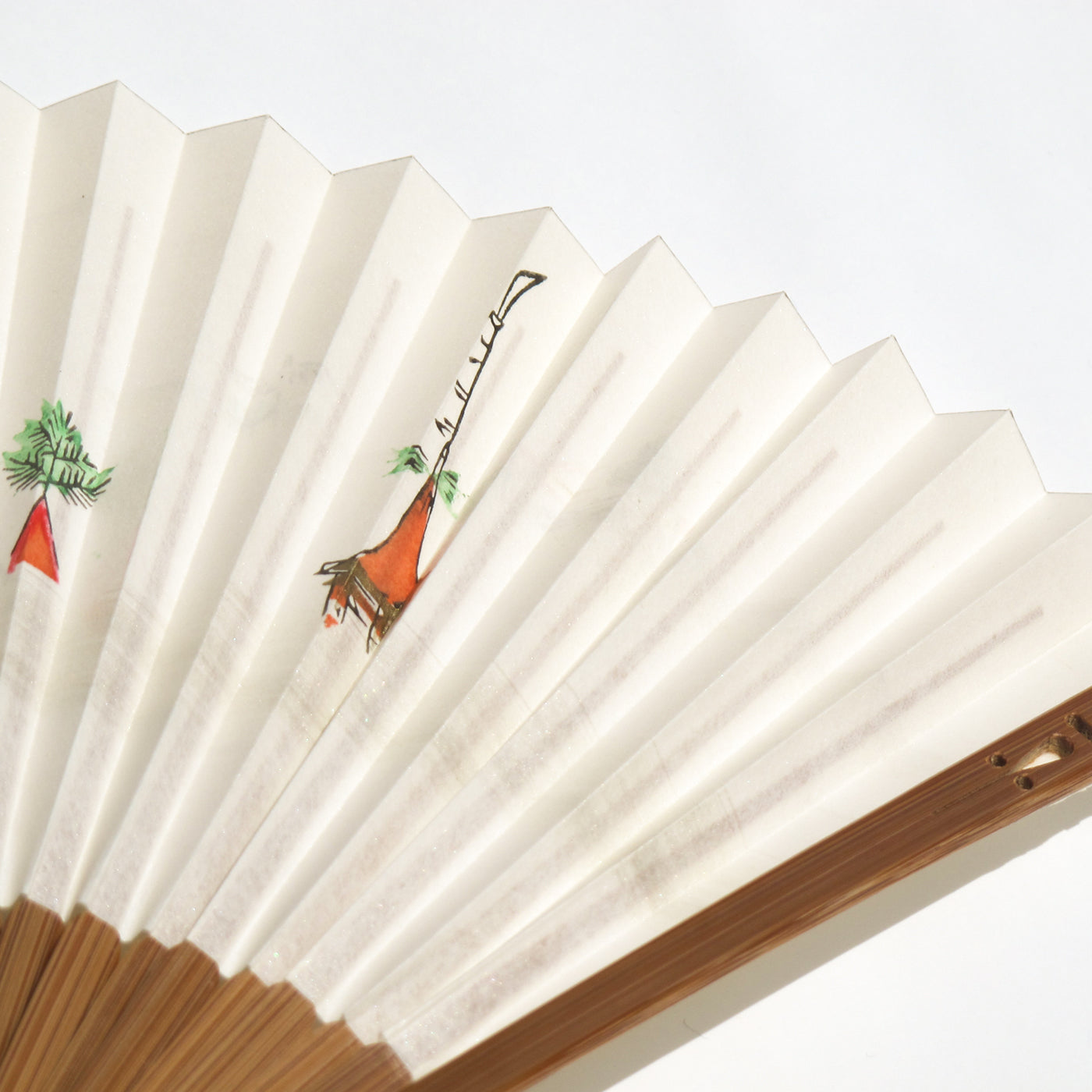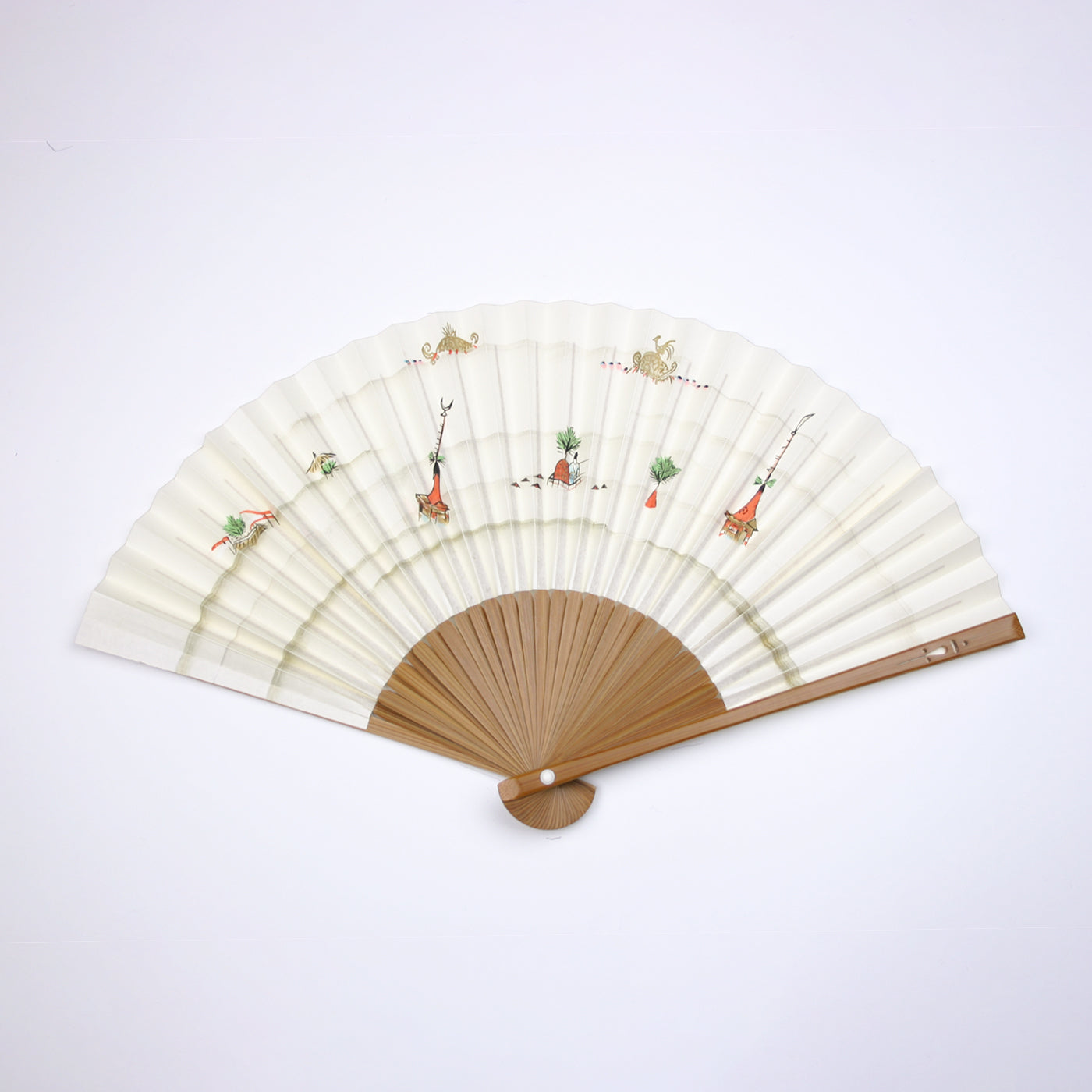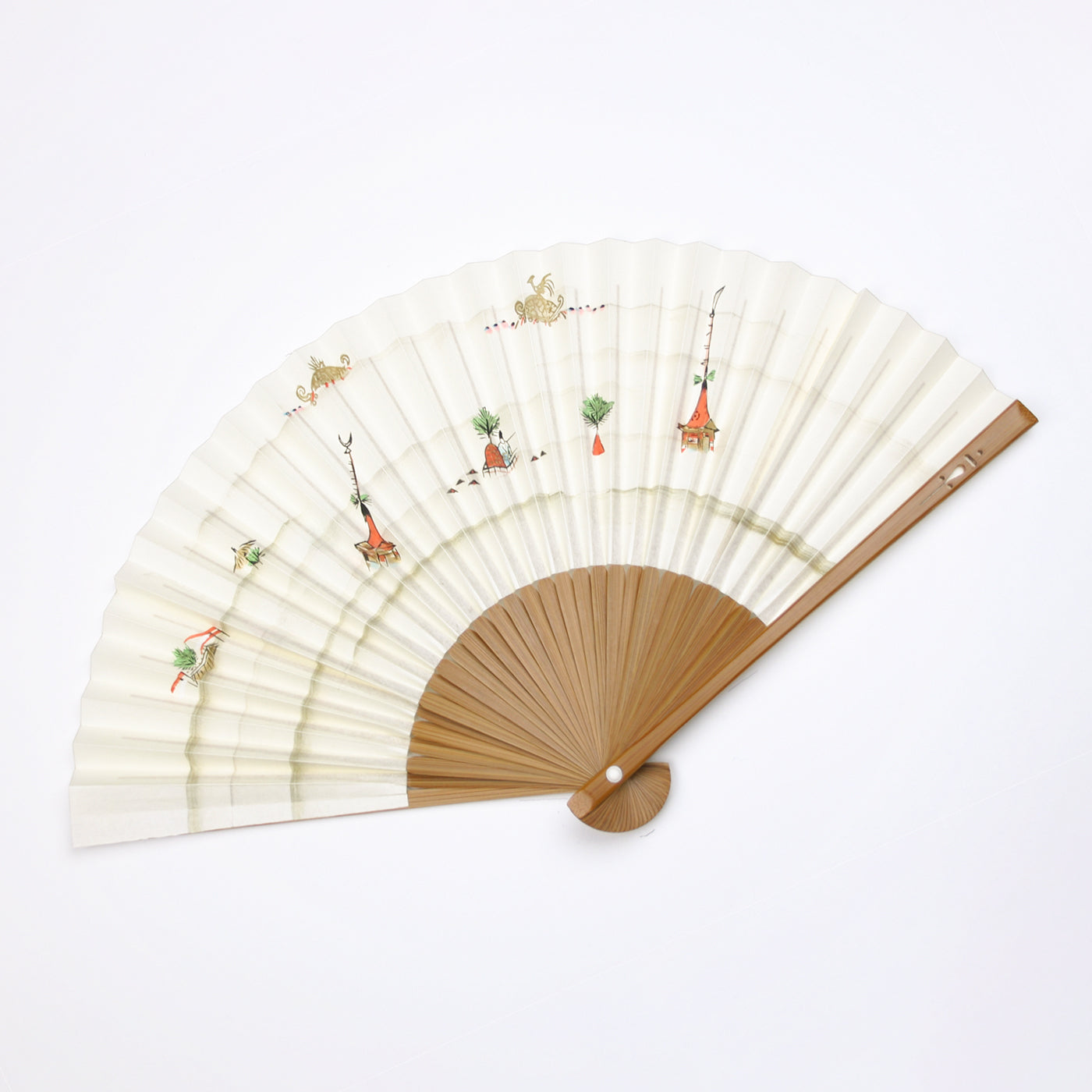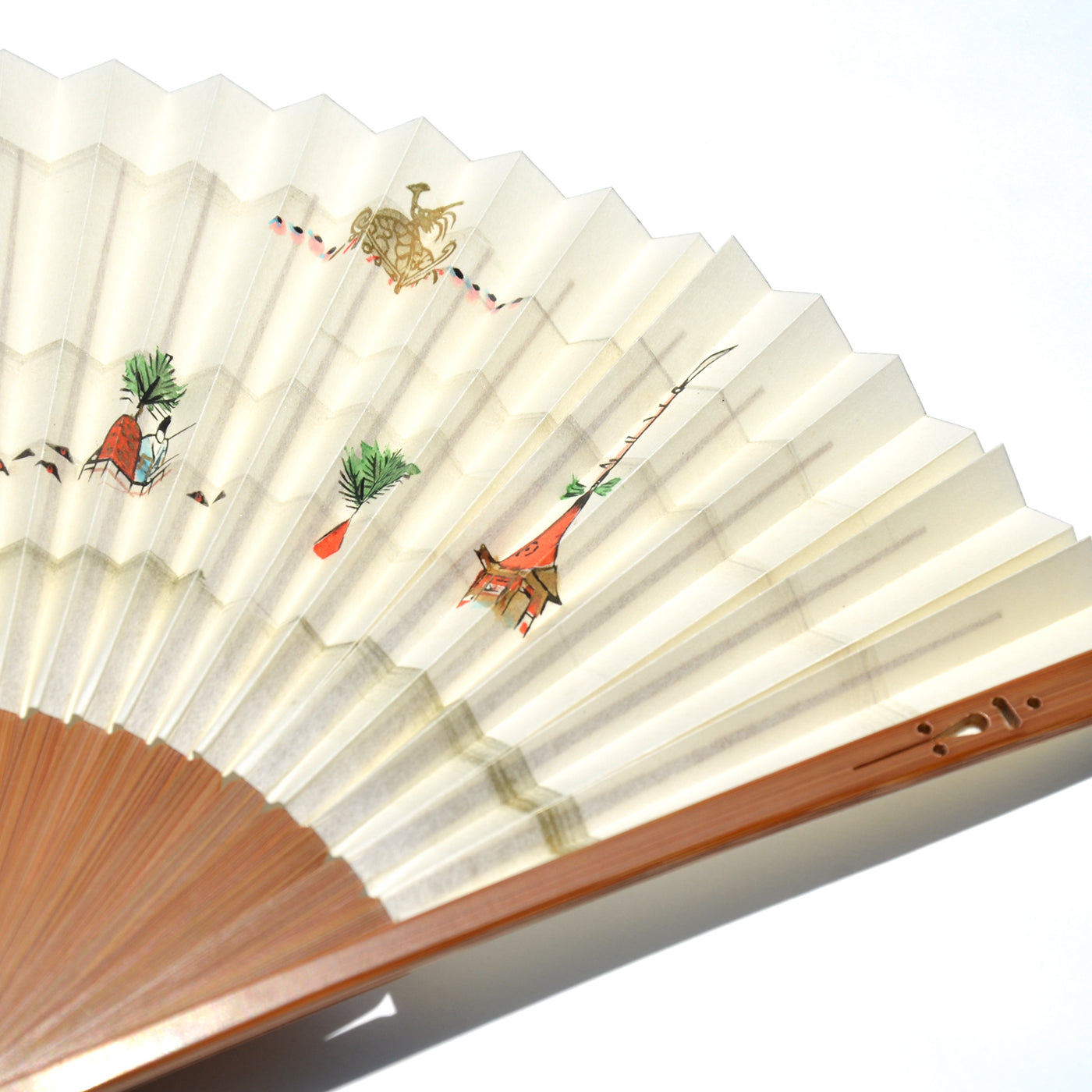 柔らかくも淡い色合いの地紙には、遊び心溢れるタッチで描かれた山鉾巡行の様子が散りばめられ、清々しくも心温まります。