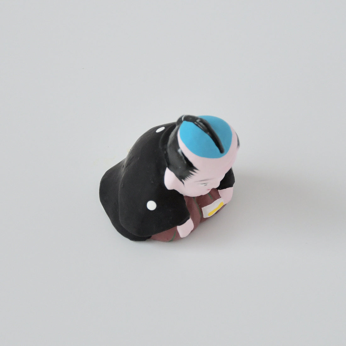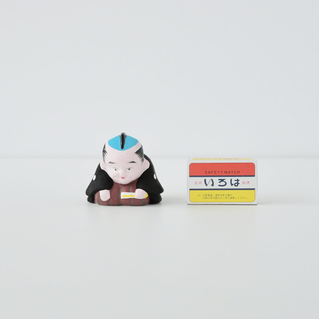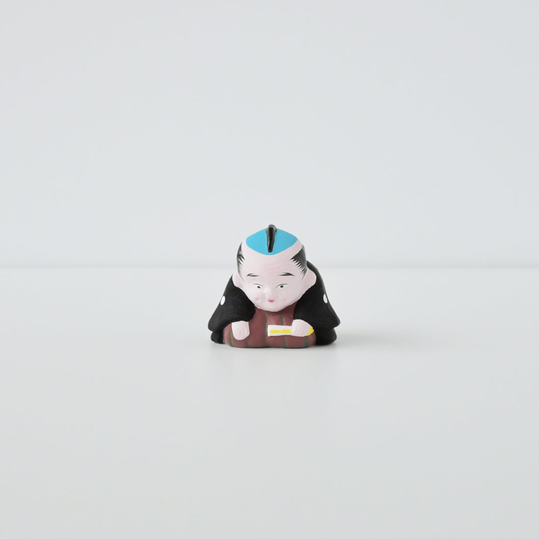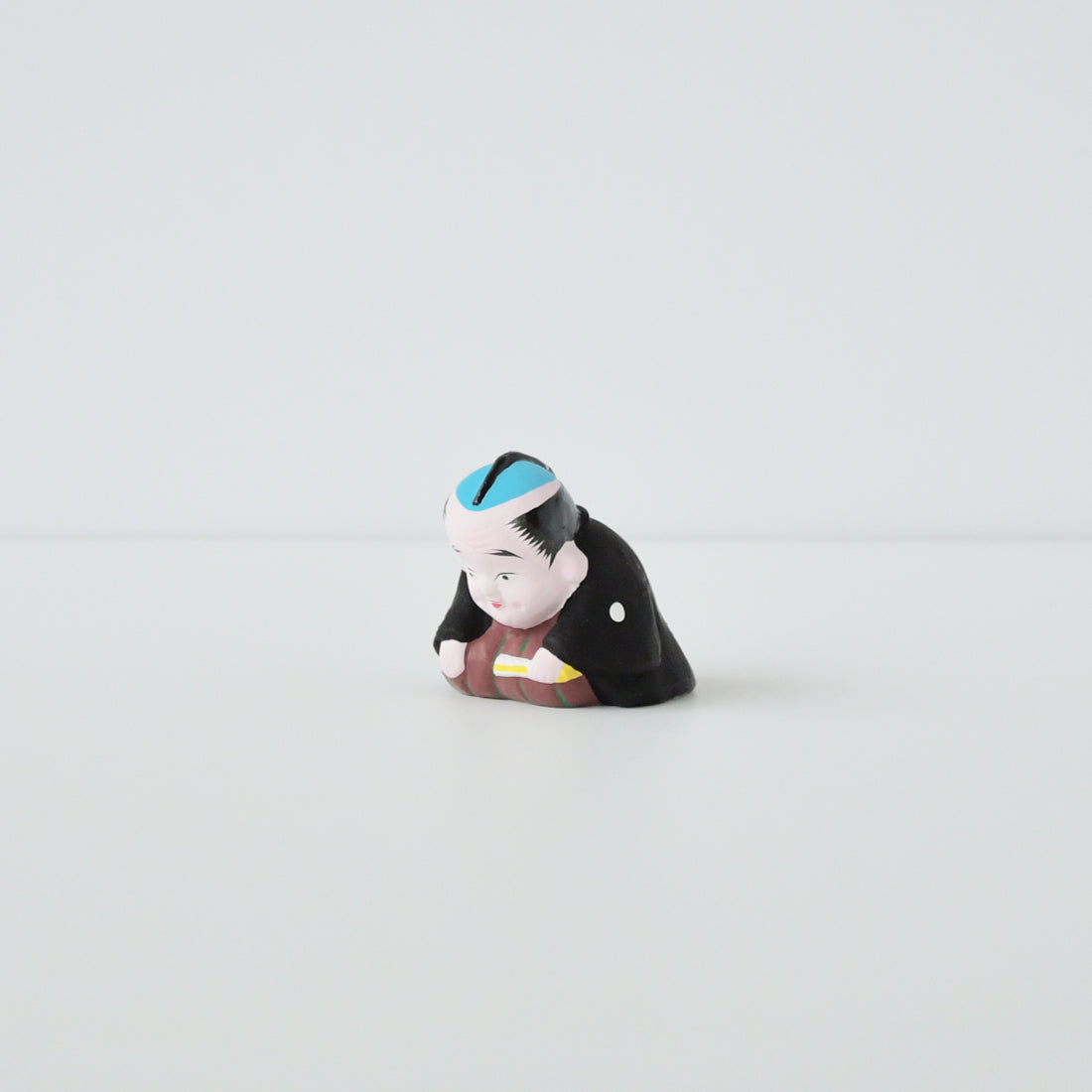 口上と名付けられた福助さん。羽織を着て深々と頭を下げ、改まって何やら話し出しそうです。