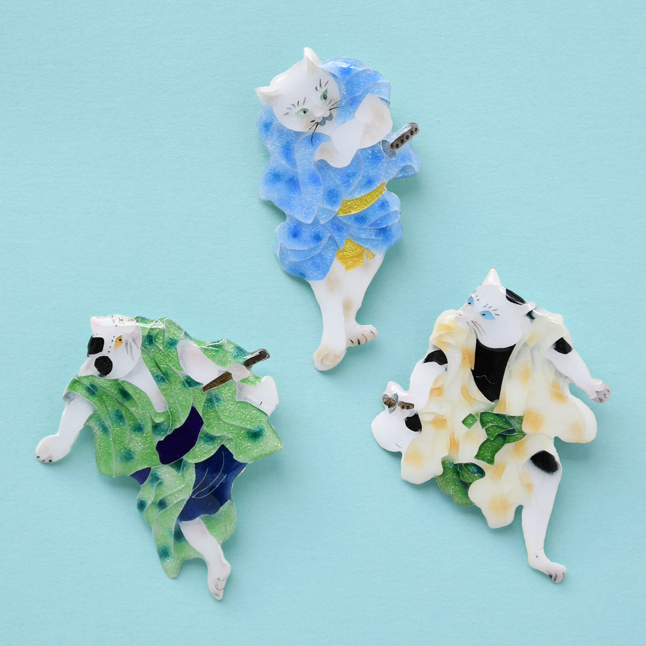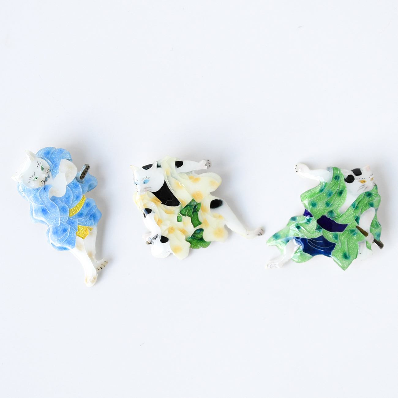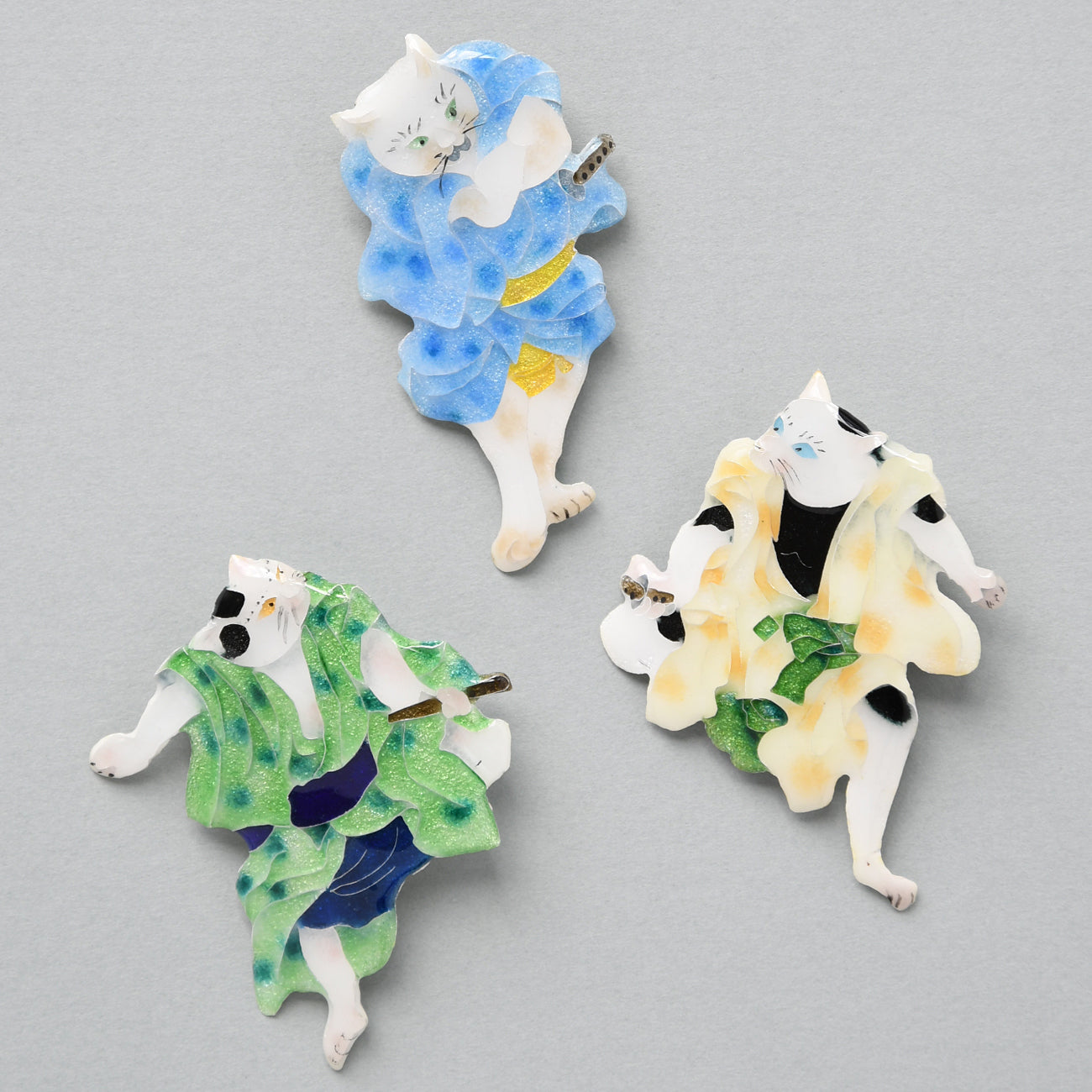 江戸時代後期、猫好き歌川国芳が 当時の人気歌舞伎狂言の登場人物を猫に見立てた「流行猫の狂言づくし」。その中から「夏祭浪花鑑(なつまつりなにわかがみ)」の第6幕。任侠じみた3人の艶姿を山本美術が七宝焼で表現。かわいいブローチになりました。