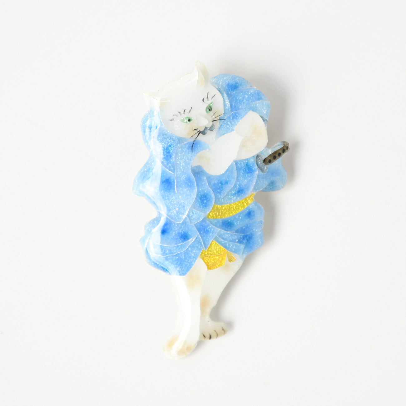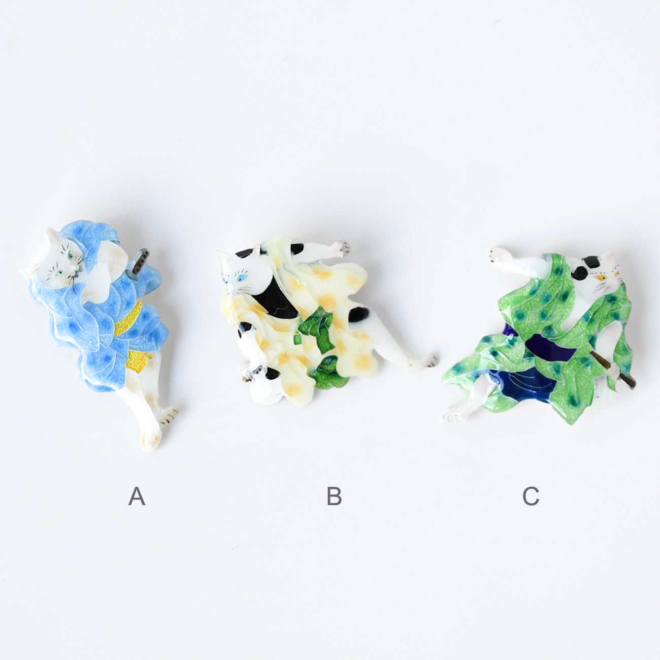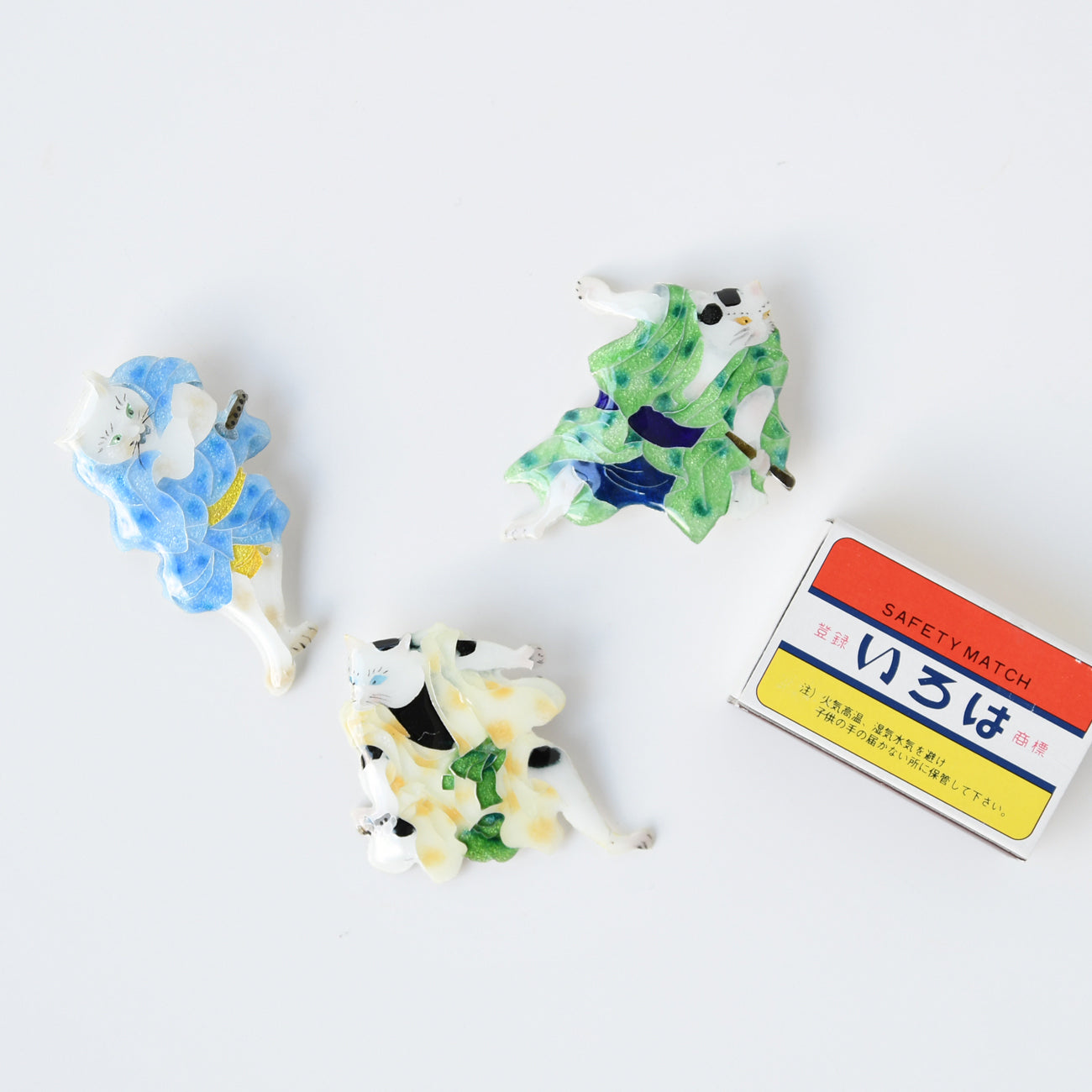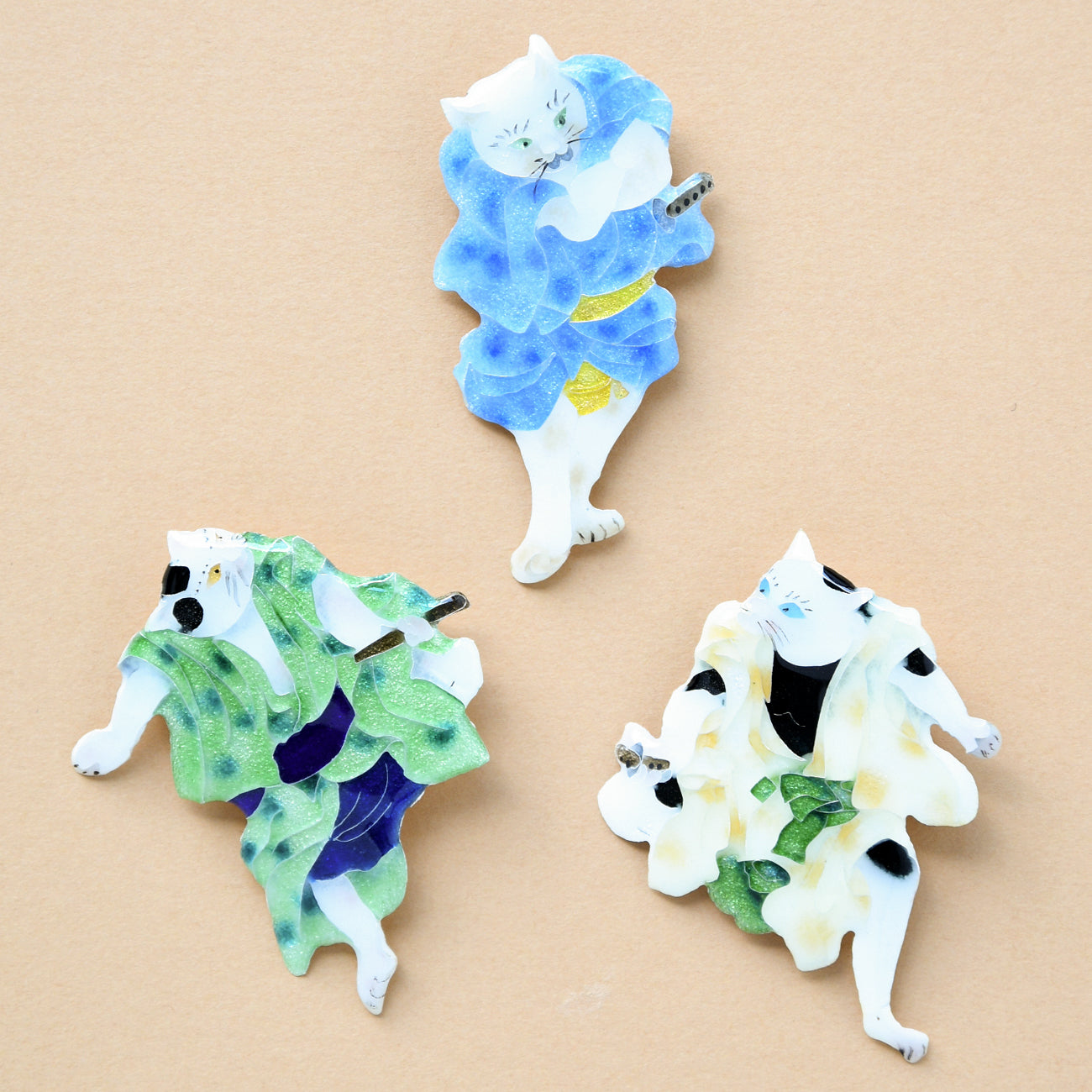 江戸時代後期、猫好き歌川国芳が 当時の人気歌舞伎狂言の登場人物を猫に見立てた「流行猫の狂言づくし」。その中から「夏祭浪花鑑(なつまつりなにわかがみ)」の第6幕。任侠じみた3人の艶姿を山本美術が七宝焼で表現。かわいいブローチになりました。