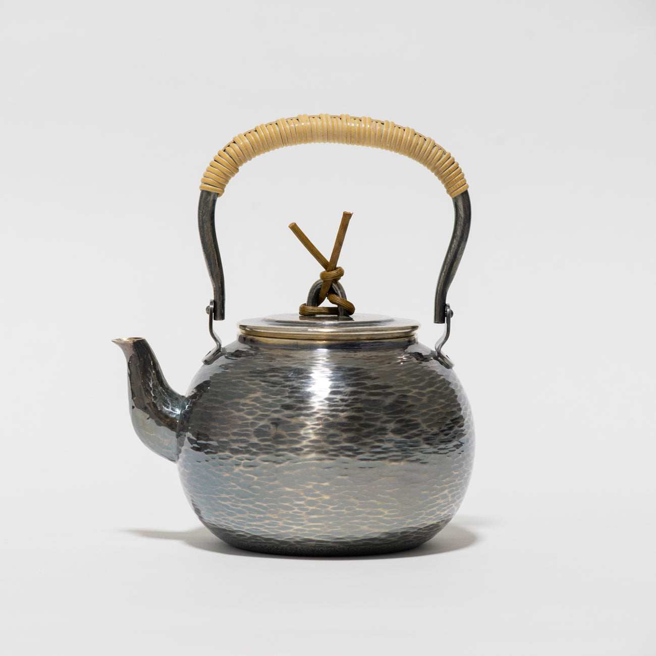 質感は、黄銅の鎚目(細長い鎚の痕)の上に銀メッキ(鍍銀)の燻し仕上げです。