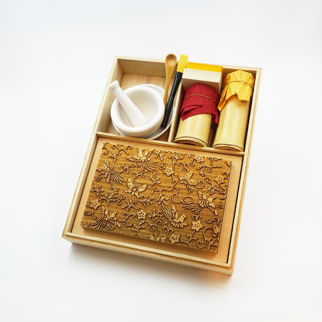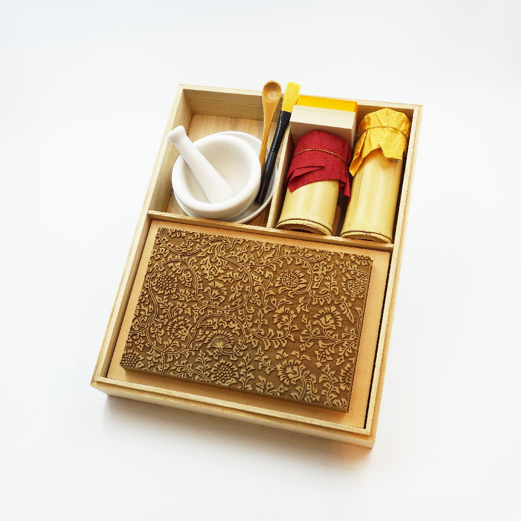版木・作業台・摺り鉢セット・受け皿・調合顔料2色(シルバー,ゴールド)・匙・刷毛・ゴムパッド・摺り見本カード・栞(「からかみや各文様の解説」「摺り工程の手順(写真付き)」が掲載)