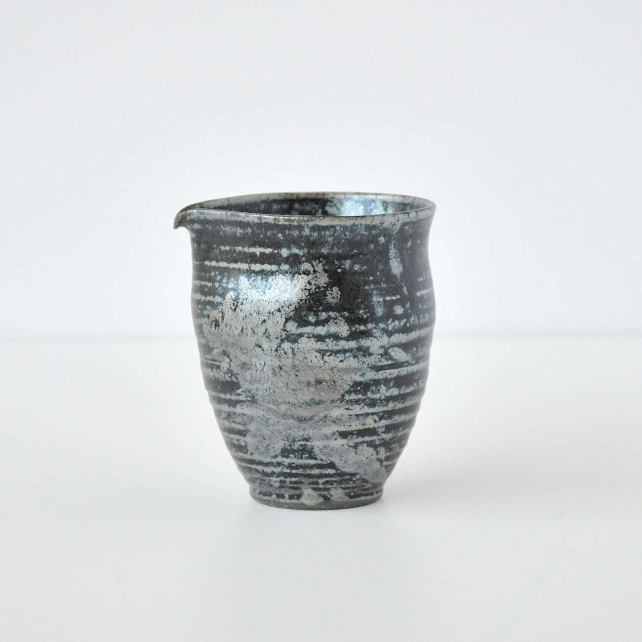 鉄を使った黒色と銀色に発色する2種類の釉薬を使用し、黒色の中にキラキラ光る景色が広がっています。