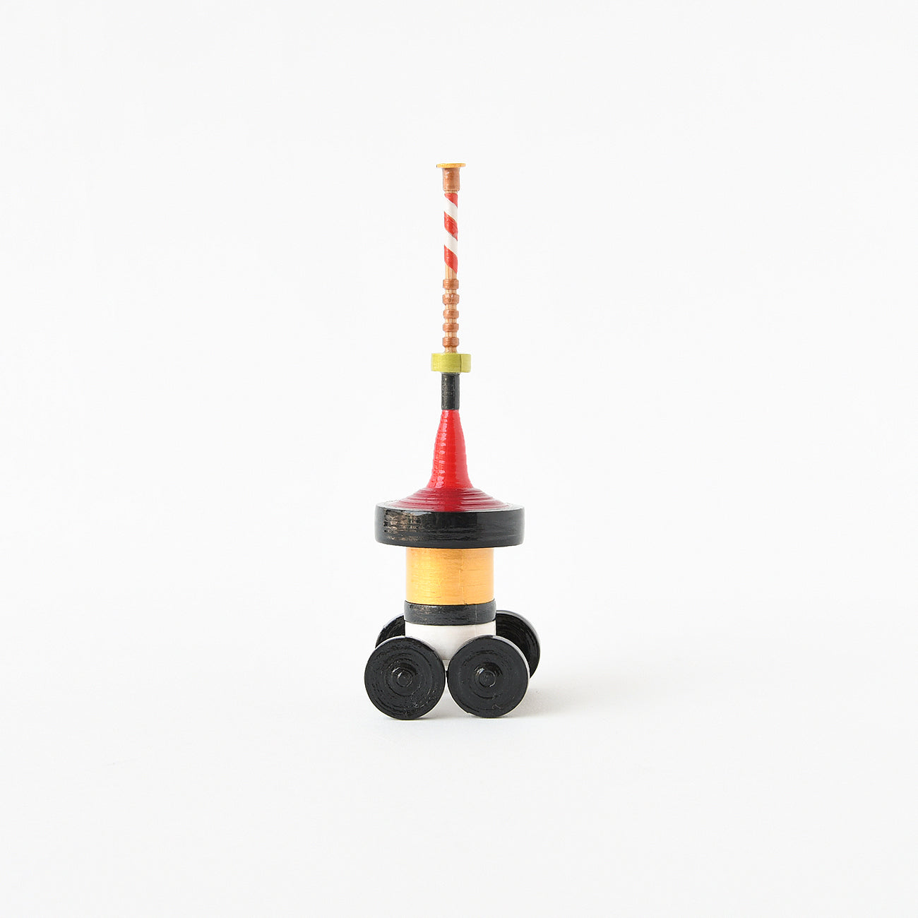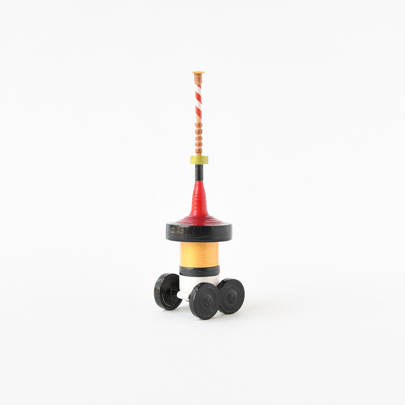 綿紐(色染めをした木綿糸の束)を巻き重ねて作った「京こま」の菊水鉾です。