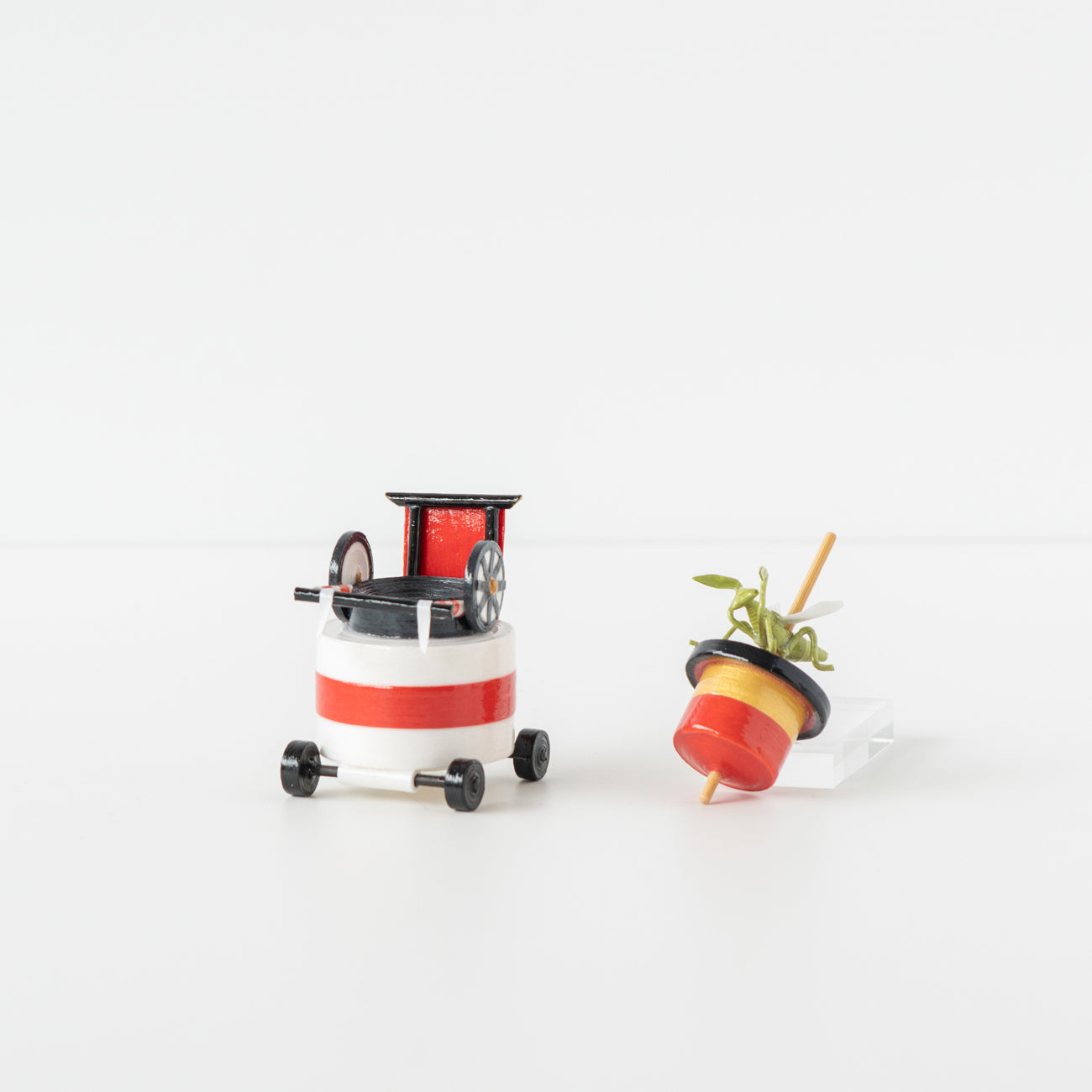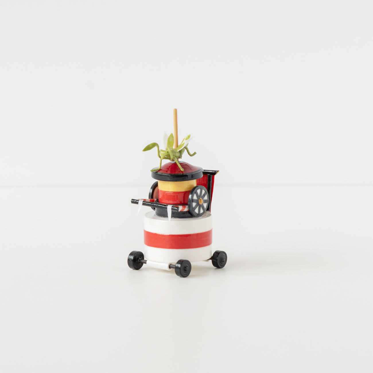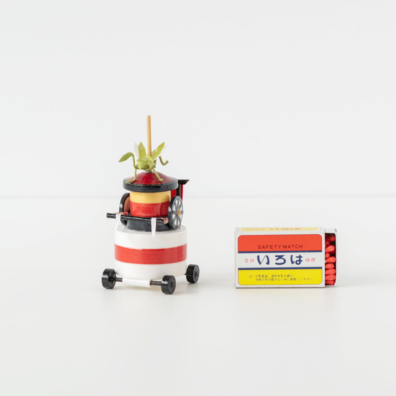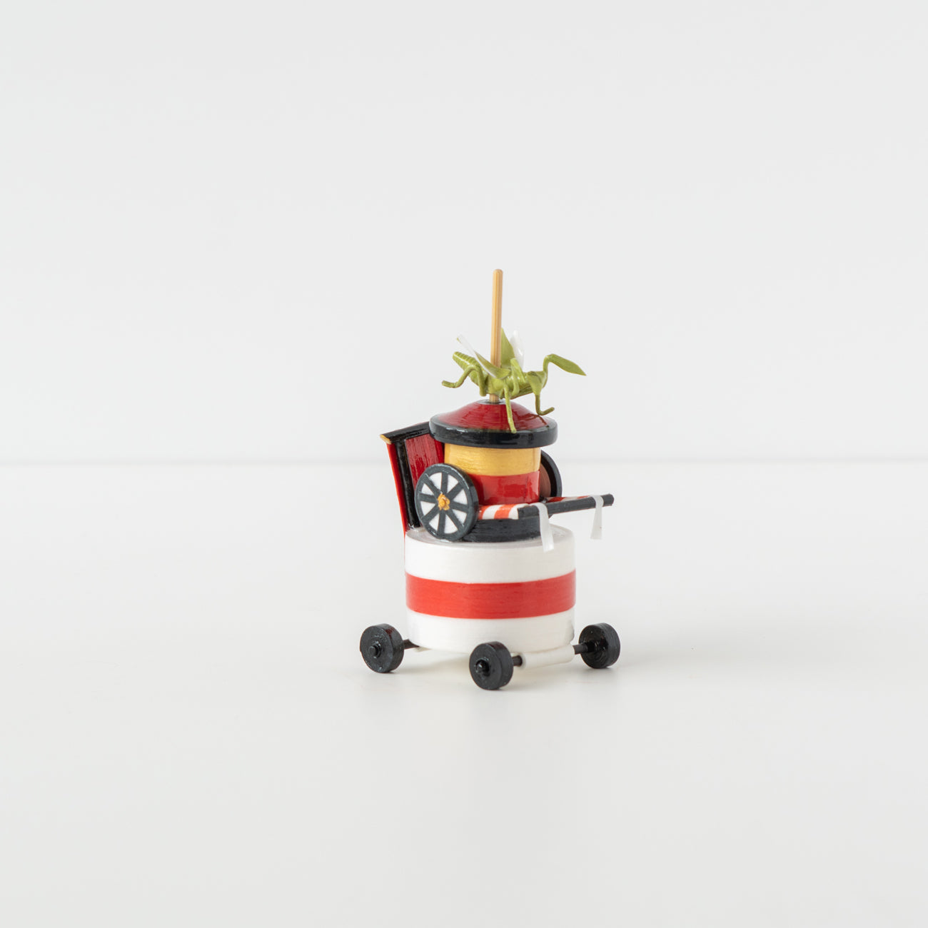綿紐(色染めをした木綿糸の束)を巻き重ねて作った「京こま」の蟷螂山(とうろやま)です。