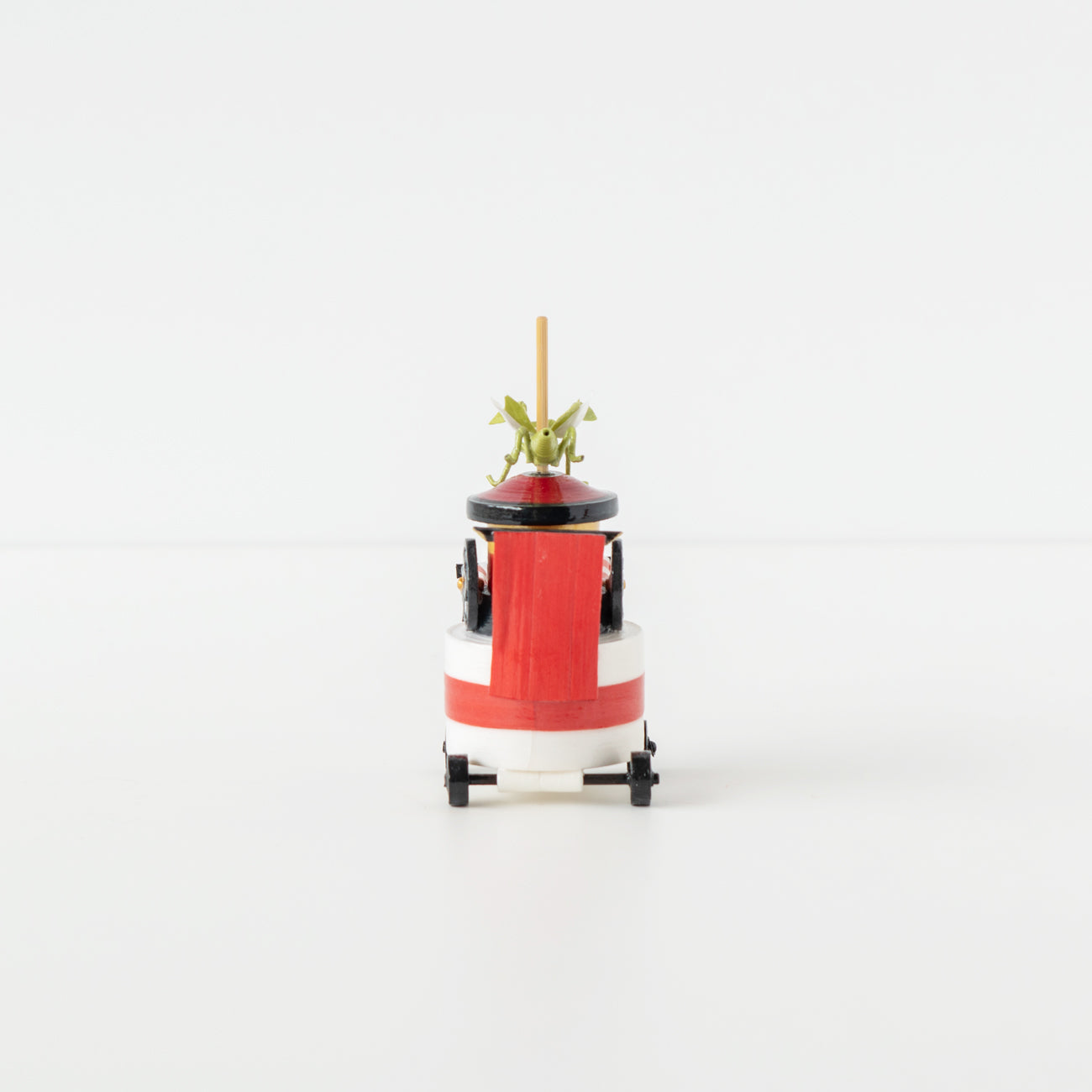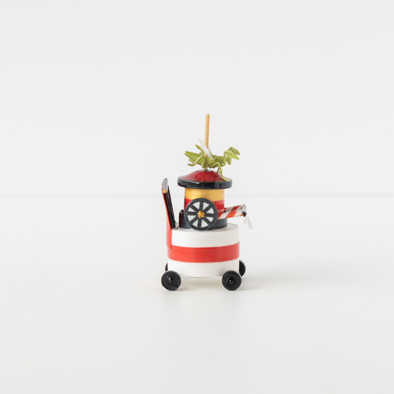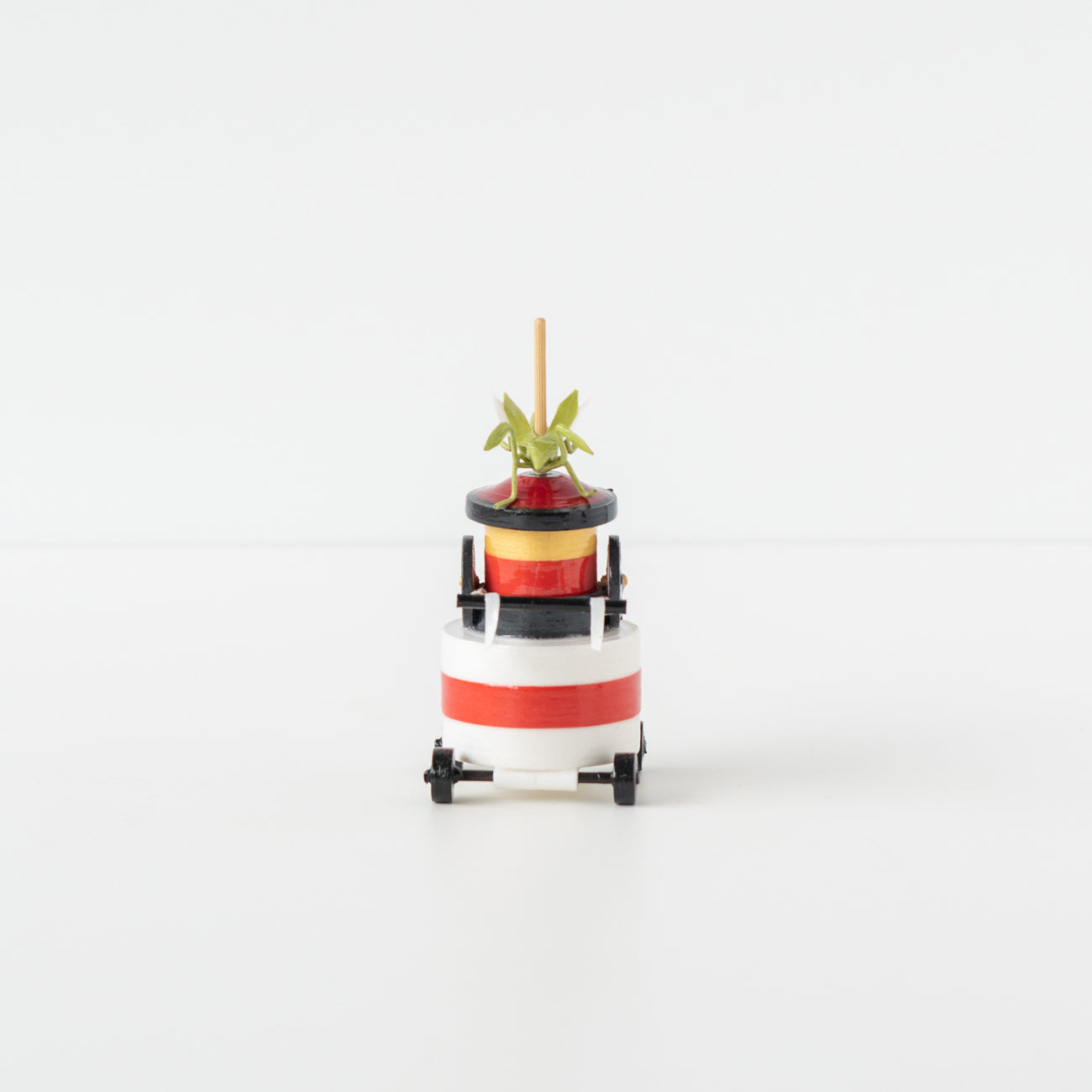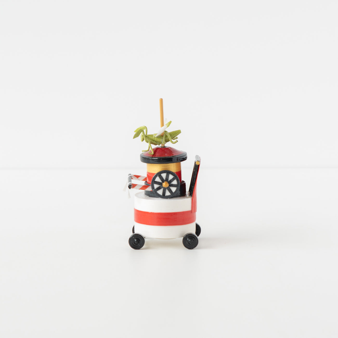 綿紐(色染めをした木綿糸の束)を巻き重ねて作った「京こま」の蟷螂山(とうろやま)です。