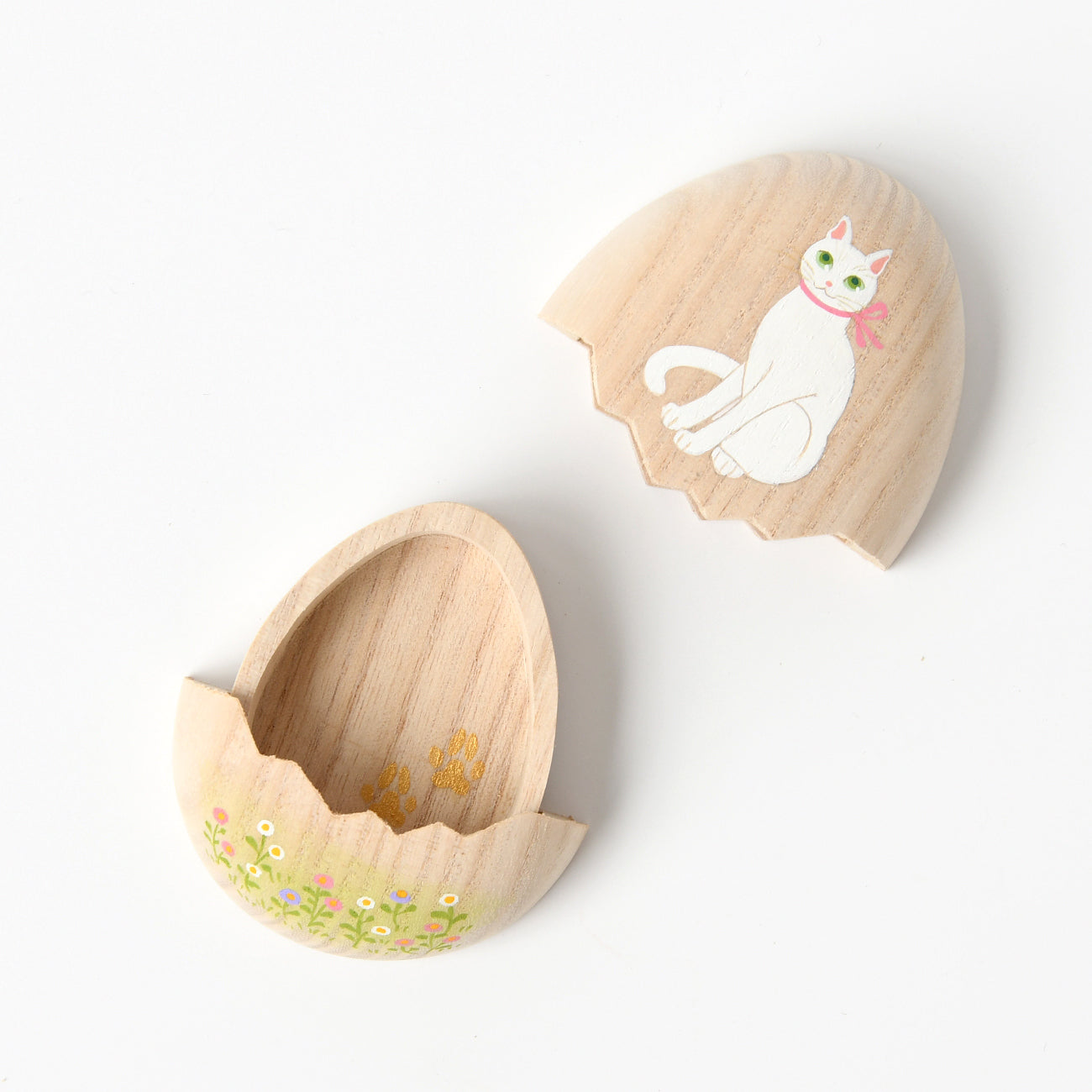 たまご箱の可愛らしいフォルムが特徴の桐箱です。開閉はスライド式。開け口がギザギザなのも人気のひとつ。開けると表の絵に因んだ絵柄が顔を覗かせます。