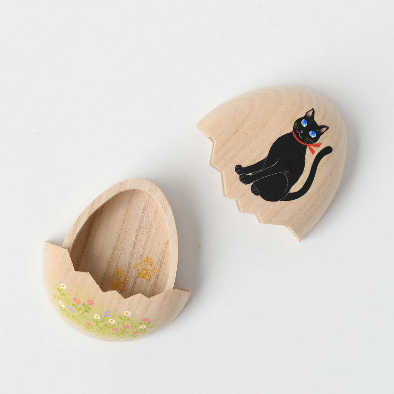 たまご箱の可愛らしいフォルムが特徴の桐箱です。開閉はスライド式。開け口がギザギザなのも人気のひとつ。開けると表の絵に因んだ絵柄が顔を覗かせます。