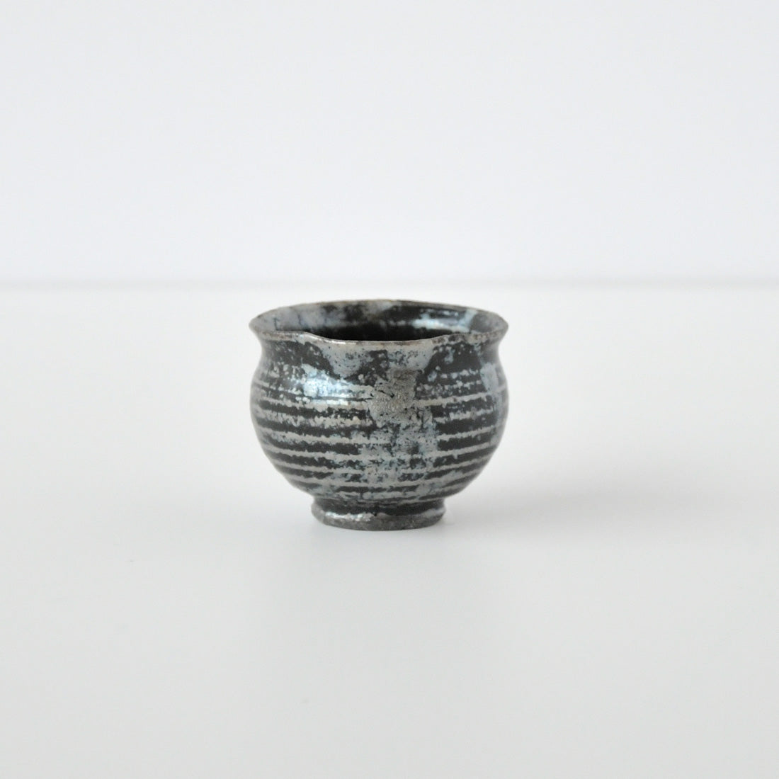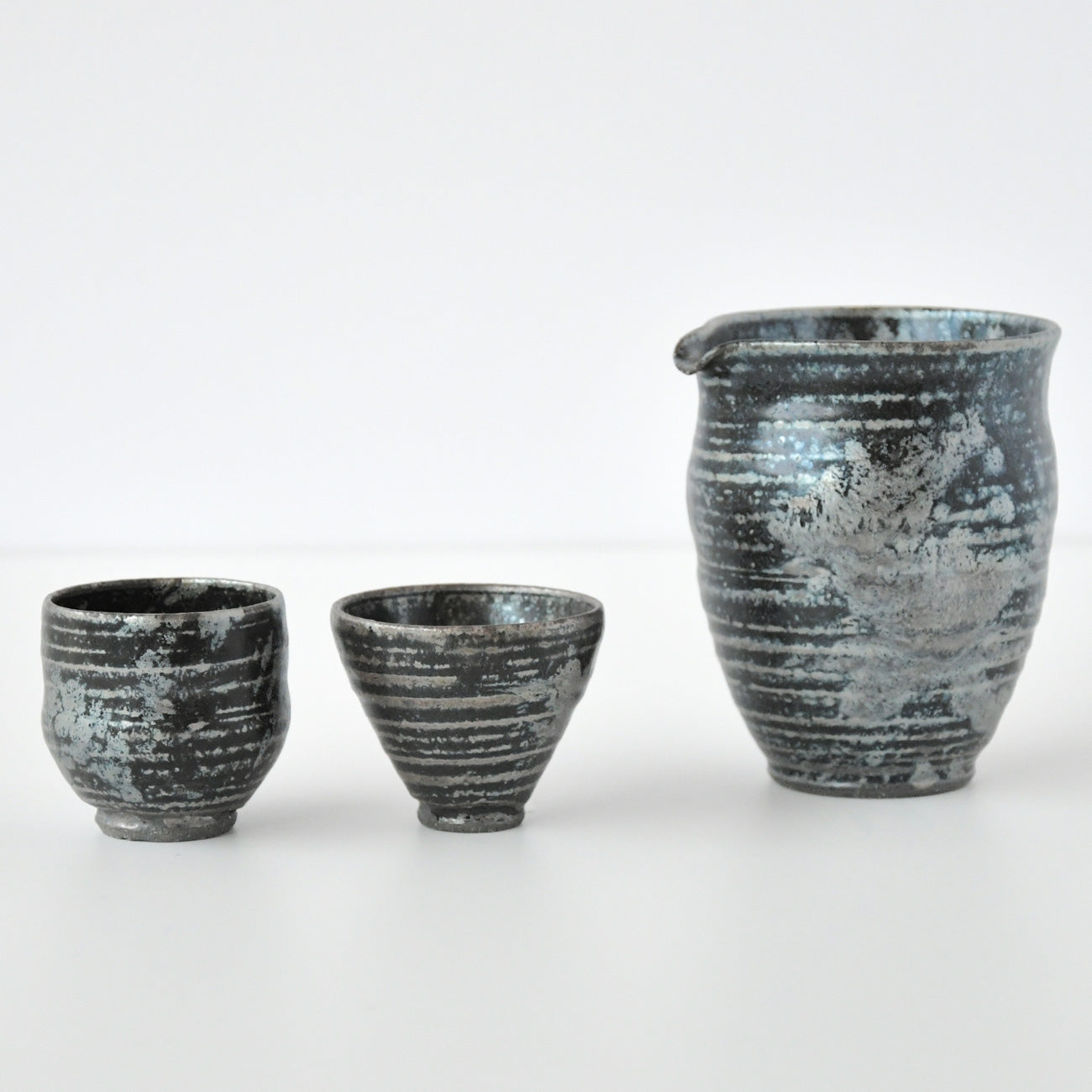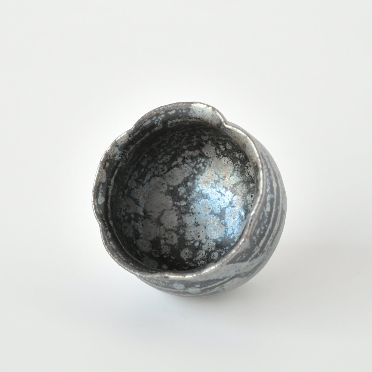 鉄を使った黒色と銀色に発色する2種類の釉薬を使用し、黒色の中にキラキラ光る景色が素敵です。