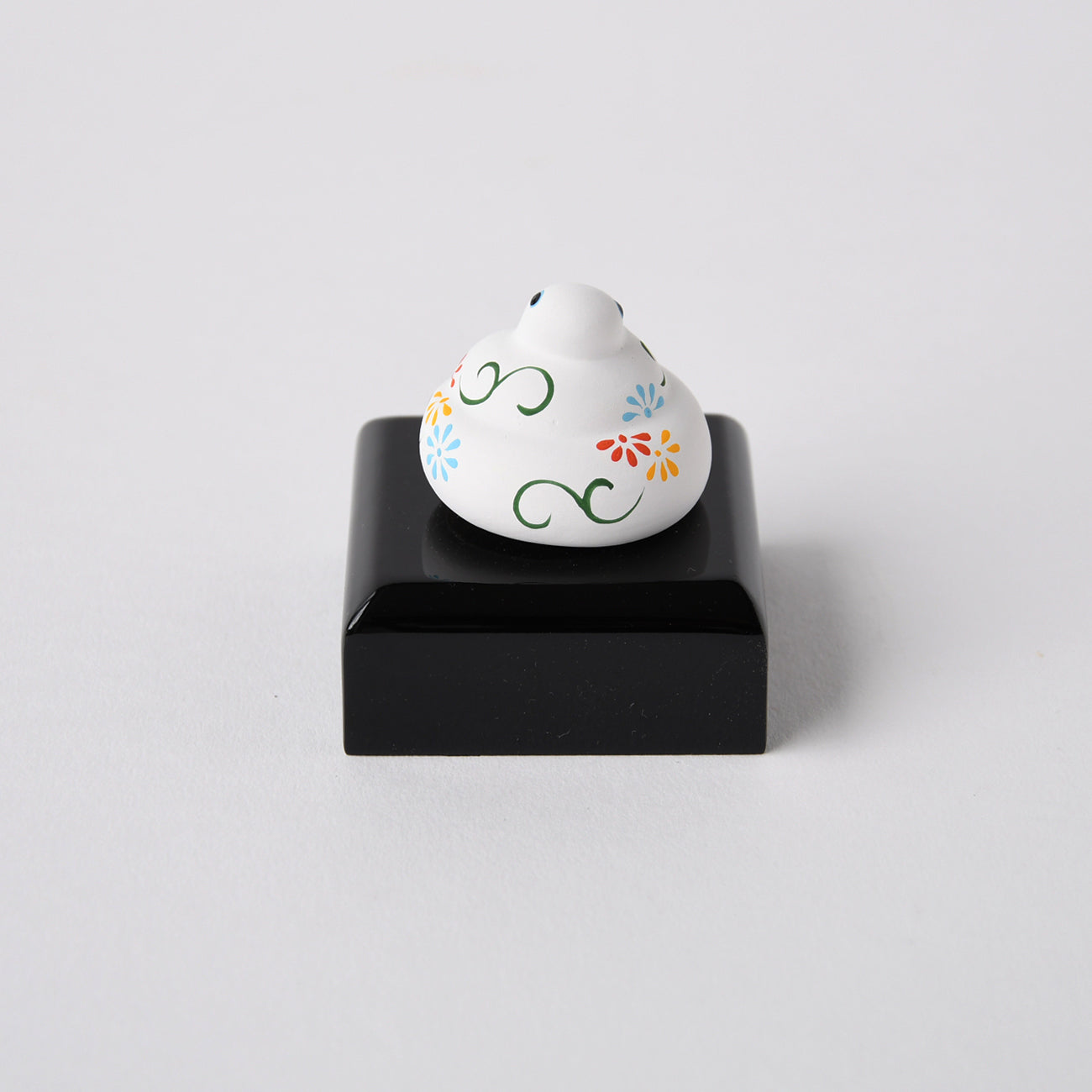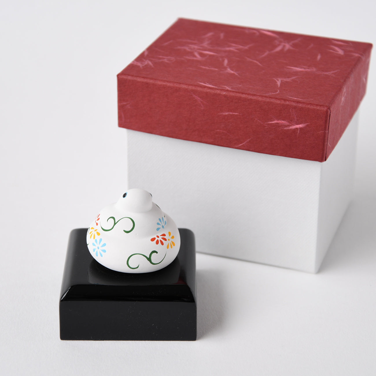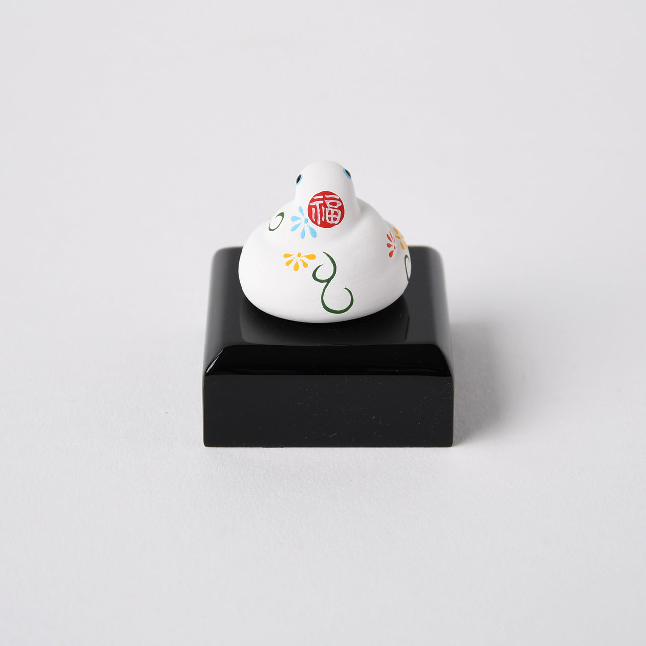 干支である巳をモチーフとした京陶人形です。可愛らしいサイズの巳に華やかな唐草模様を描かれています。また人形が転倒しないように台座に棒がセットされておりますので、場所を選ばずに飾ることが出来ます。