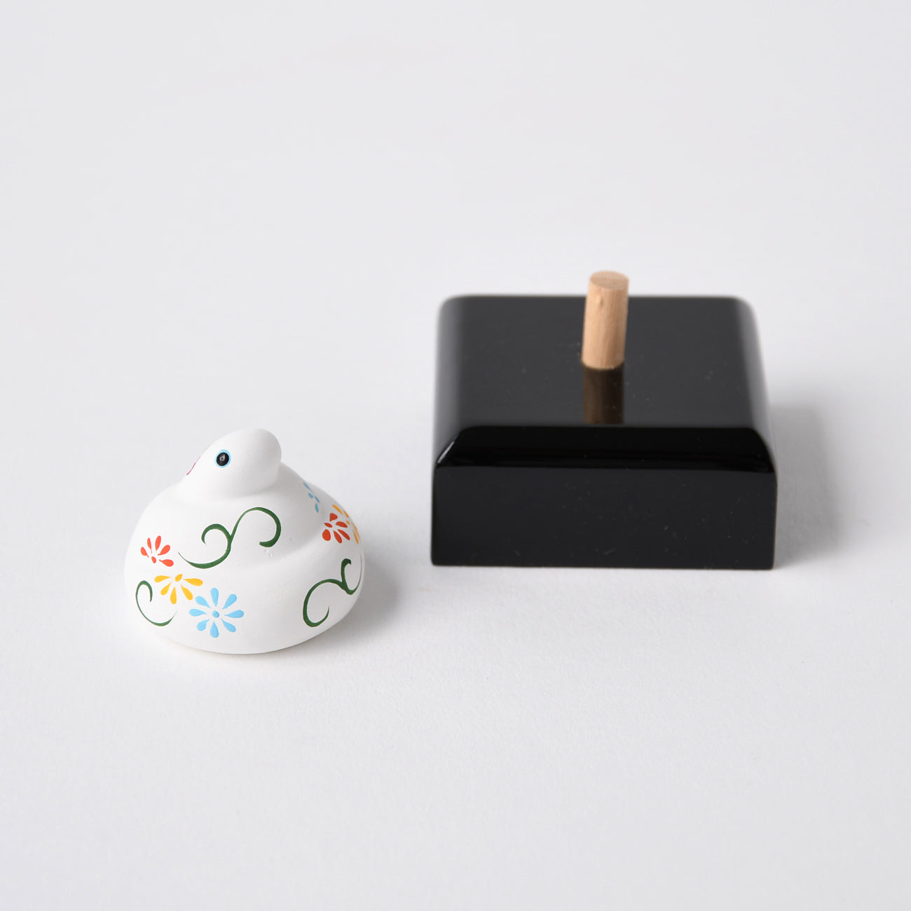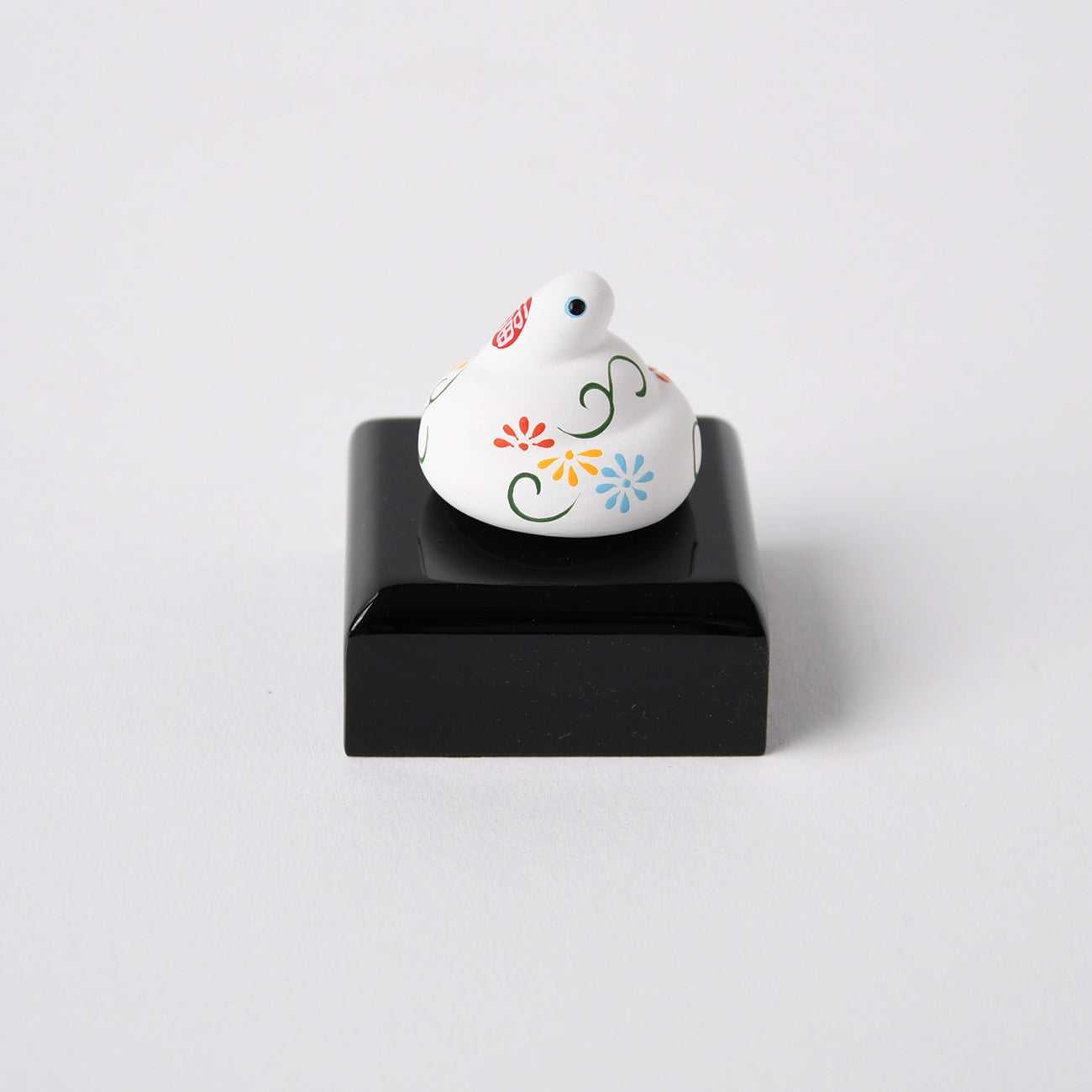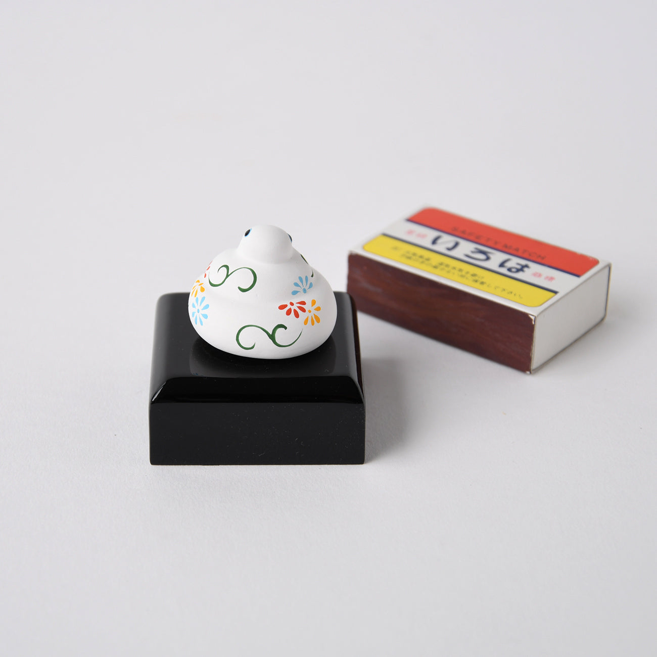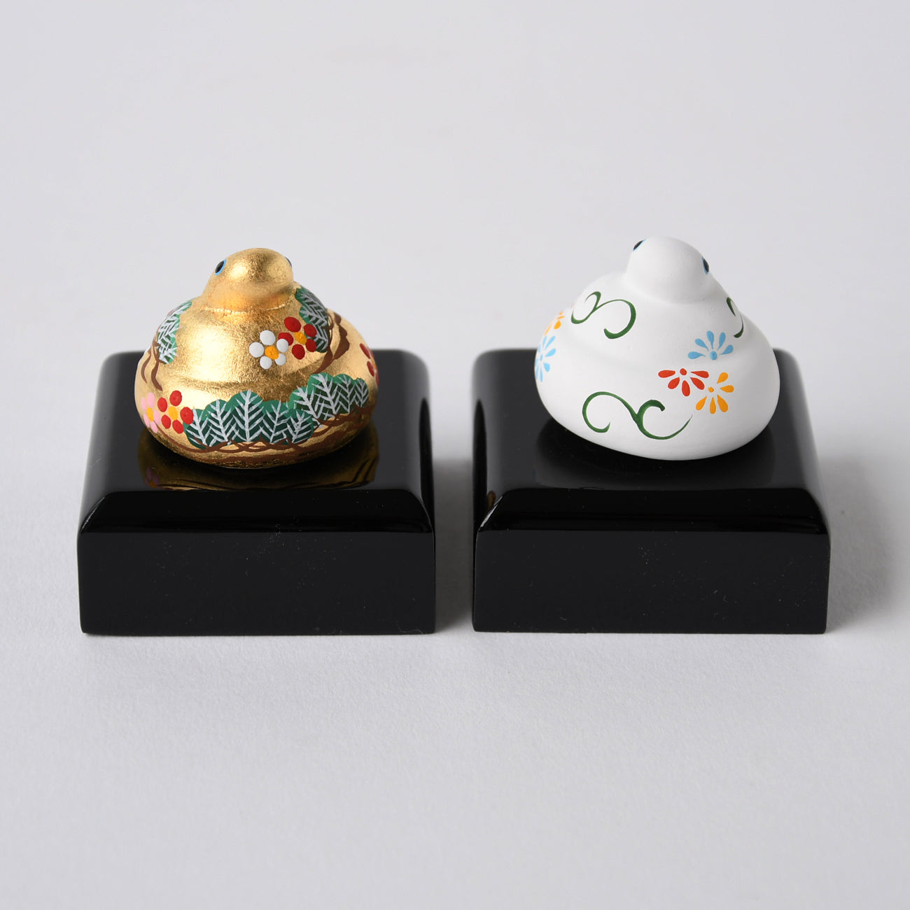 干支である巳をモチーフとした京陶人形です。可愛らしいサイズの巳に華やかな唐草模様を描かれています。また人形が転倒しないように台座に棒がセットされておりますので、場所を選ばずに飾ることが出来ます。