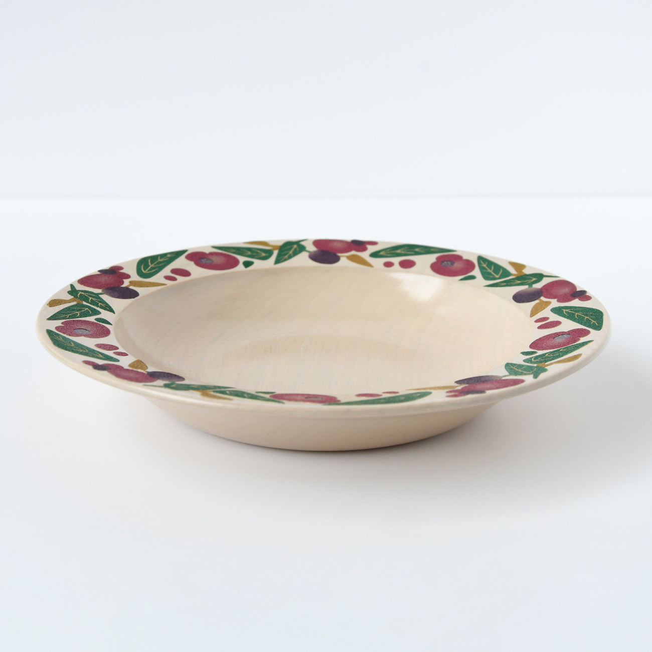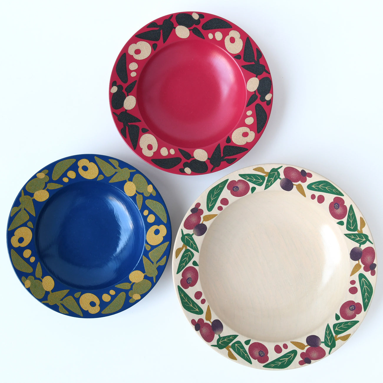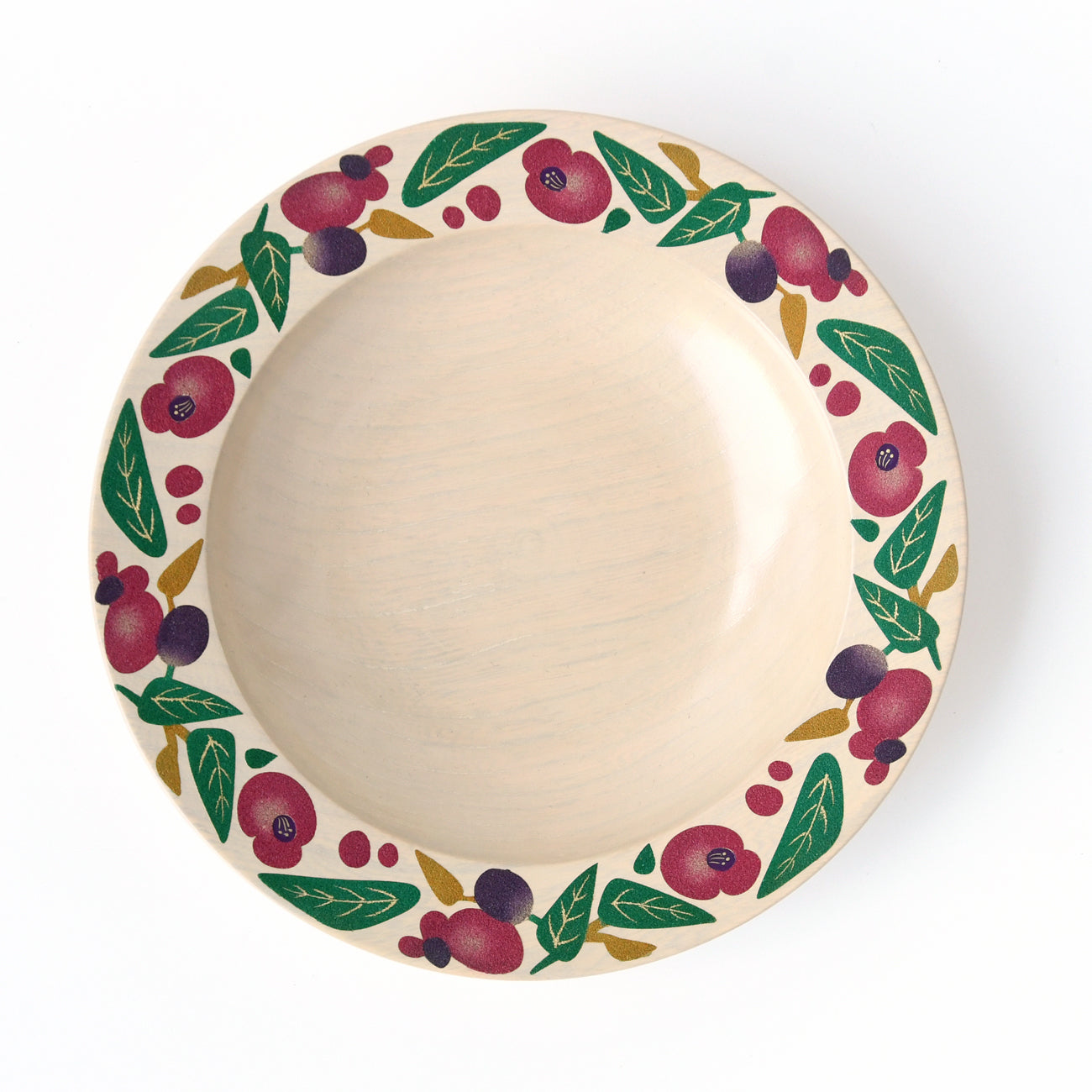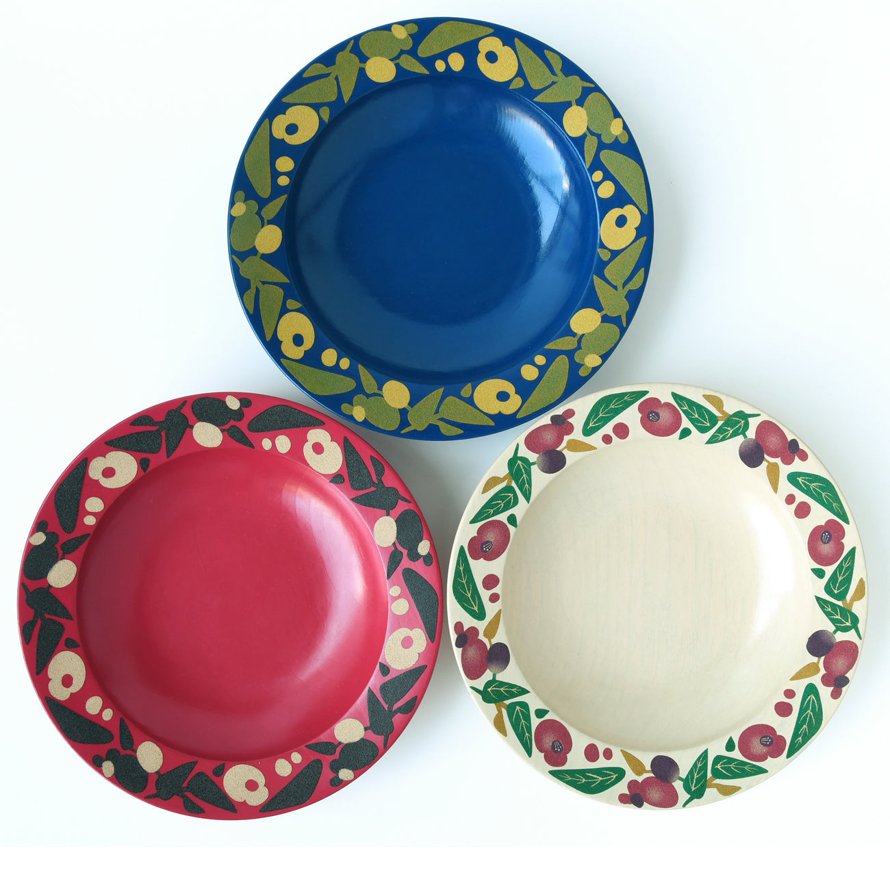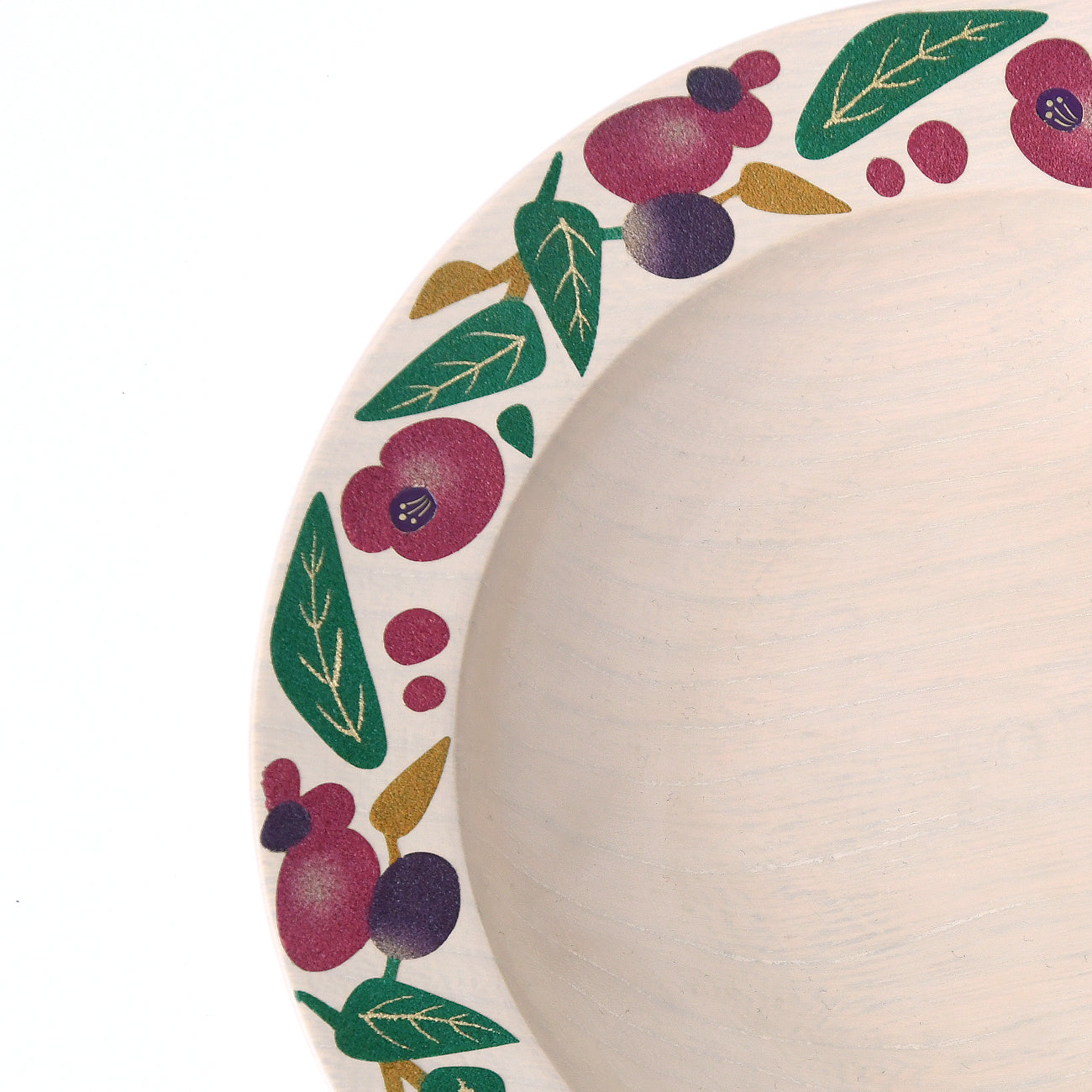 縁取りに大胆にデフォルメした草花の模様をあしらい、季節を問わず料理に彩りを添えて食卓を明るくします。形はしっかりと深さがあり、色々なお料理に幅広く使えます。
