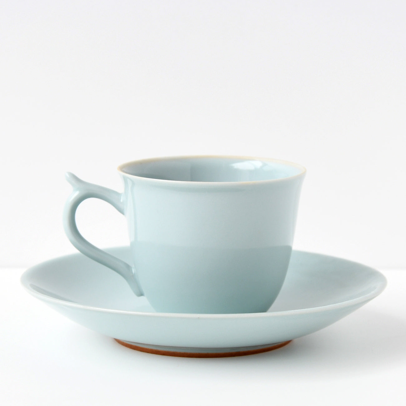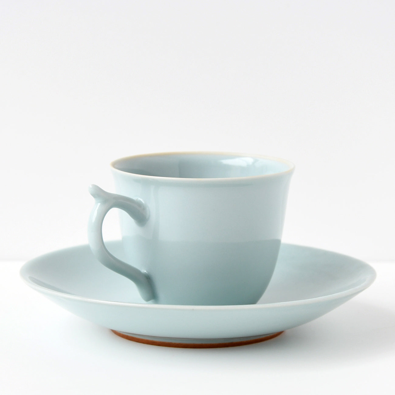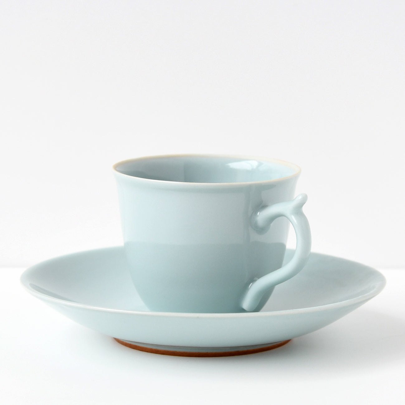 青磁コーヒー碗皿:碗;W11.5 D 9 H 7 皿;W 16 D 16 H 3 碗皿;413g