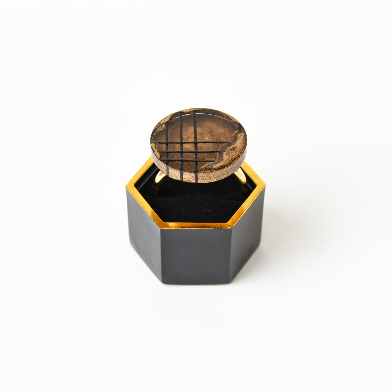 漆蒔絵リング「朧格子」...格子越しに夜景を眺めるようなイメージでデザインした、アクリルの透明度を生かした変わり蒔絵リングです。裏面や表の一部に真鍮粉を混ぜ合わせた漆を塗り、表に格子と朧雲を描いています。