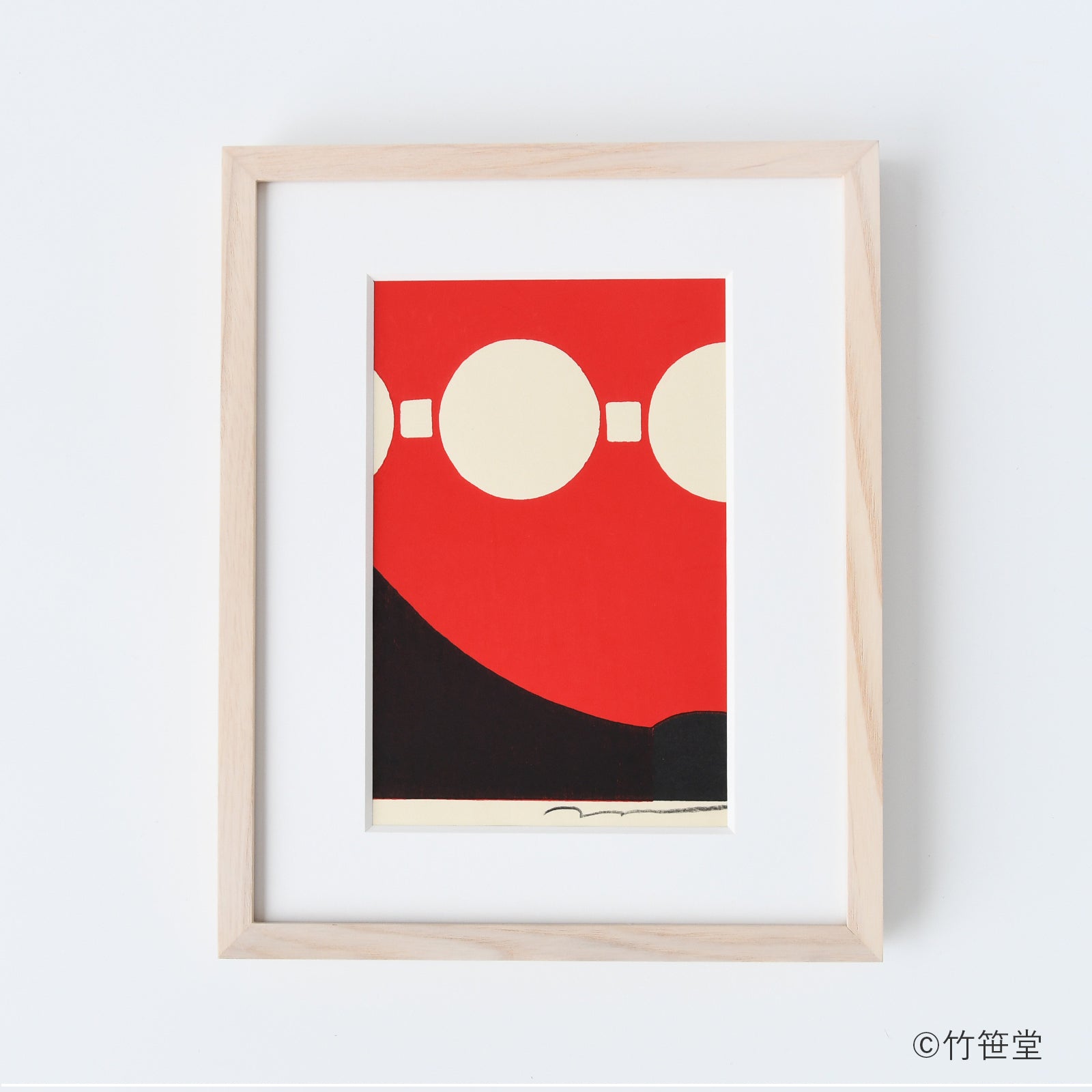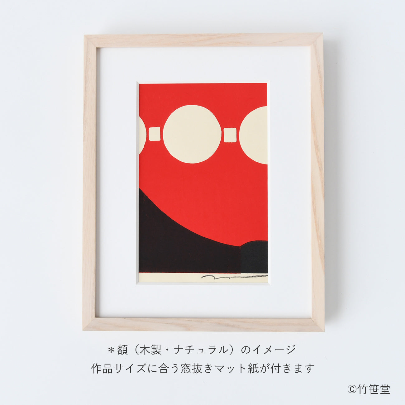 すっかり暗くなった街にほんのりと灯りが点された球形をミニマムに切り取った木版画作品です。