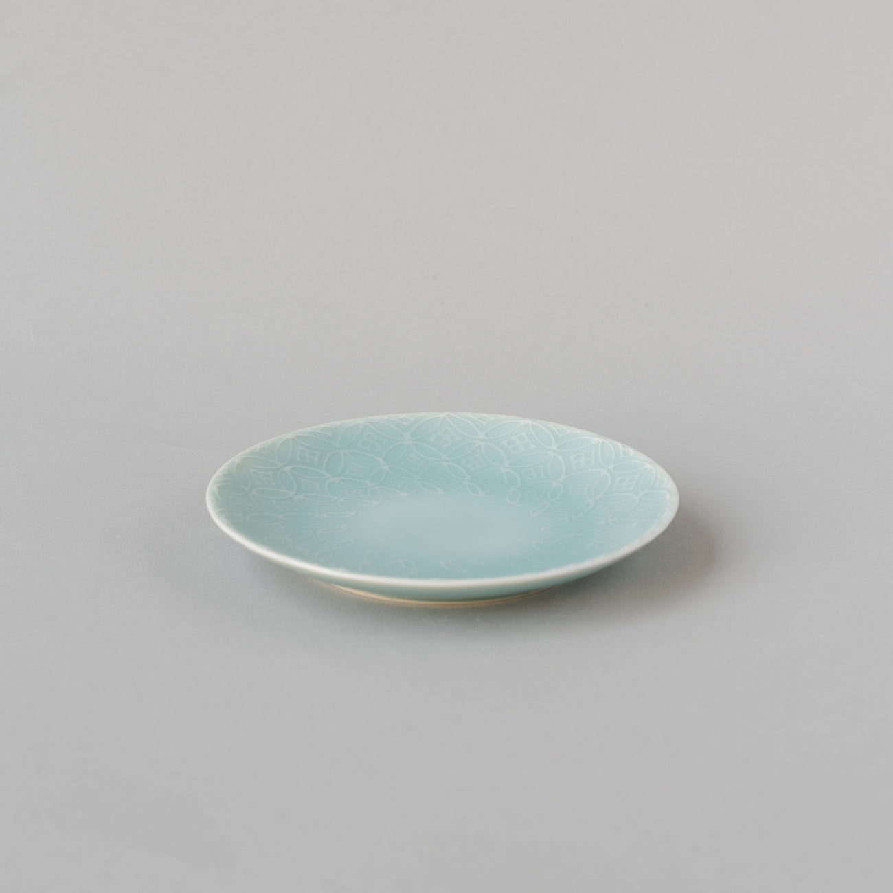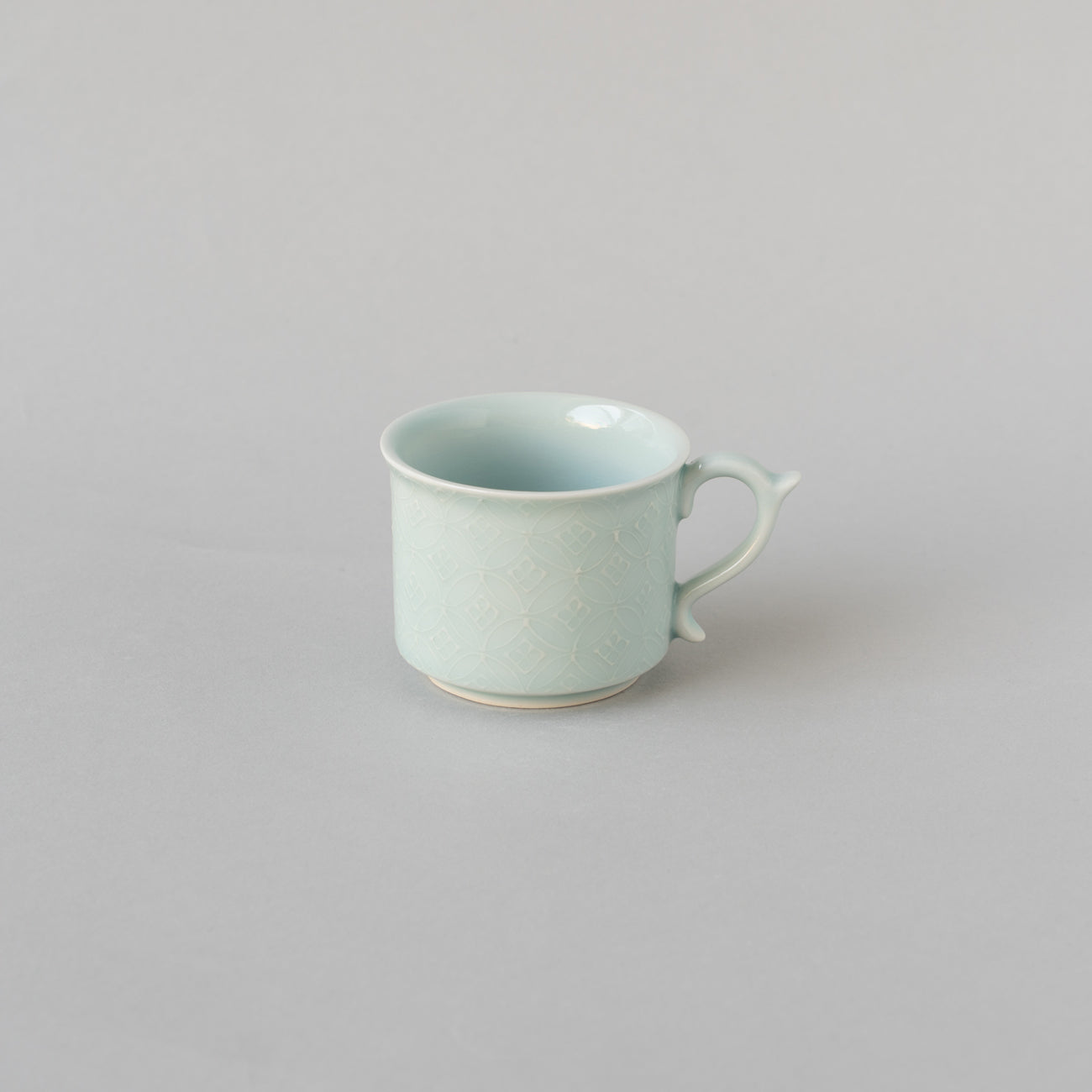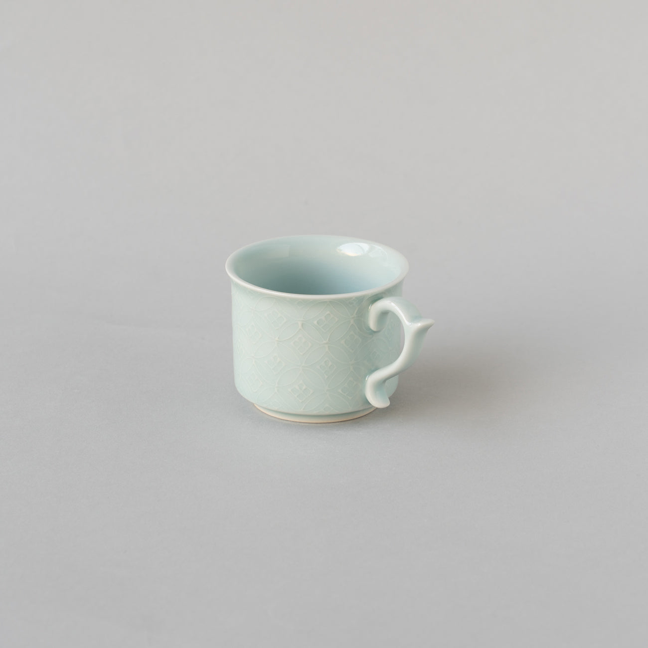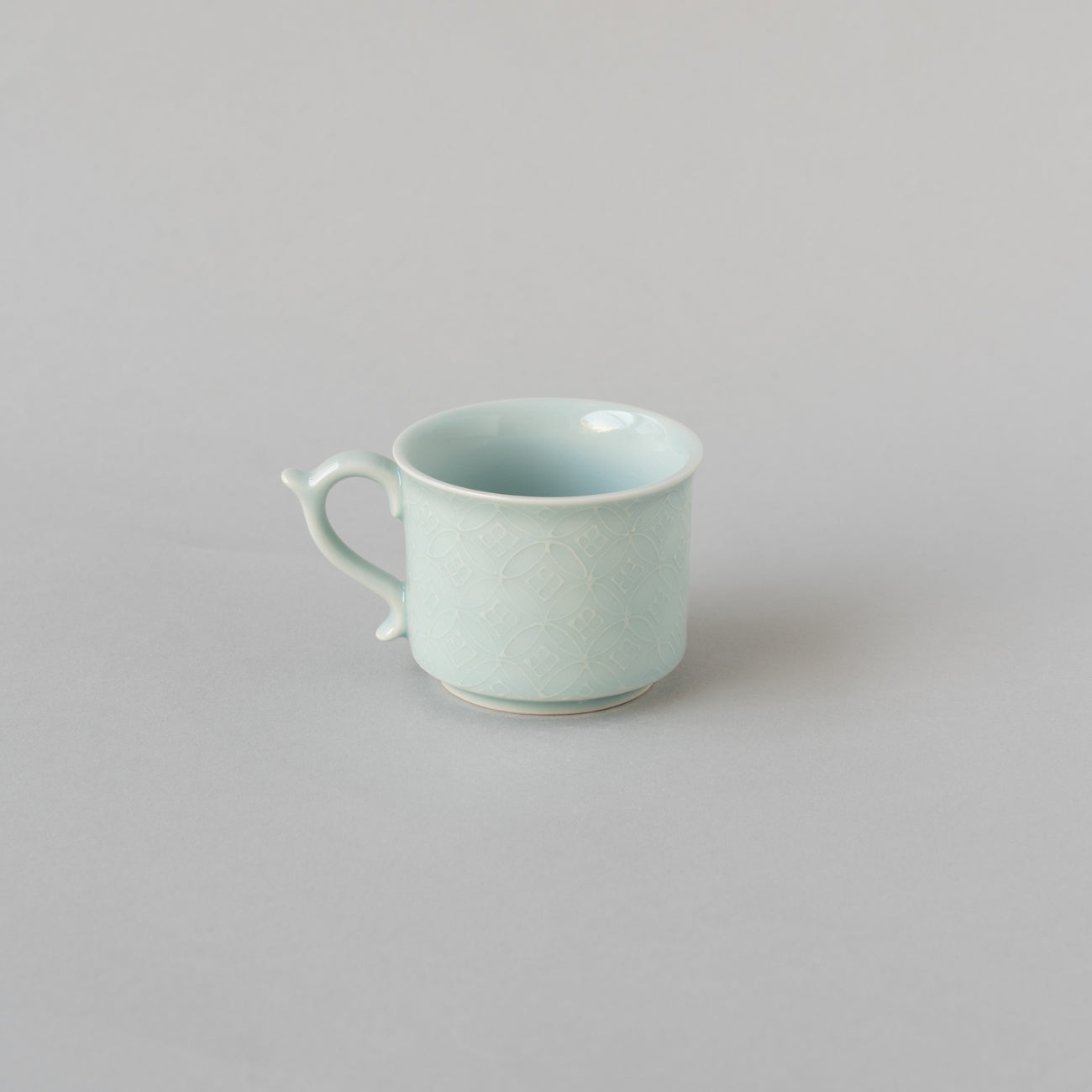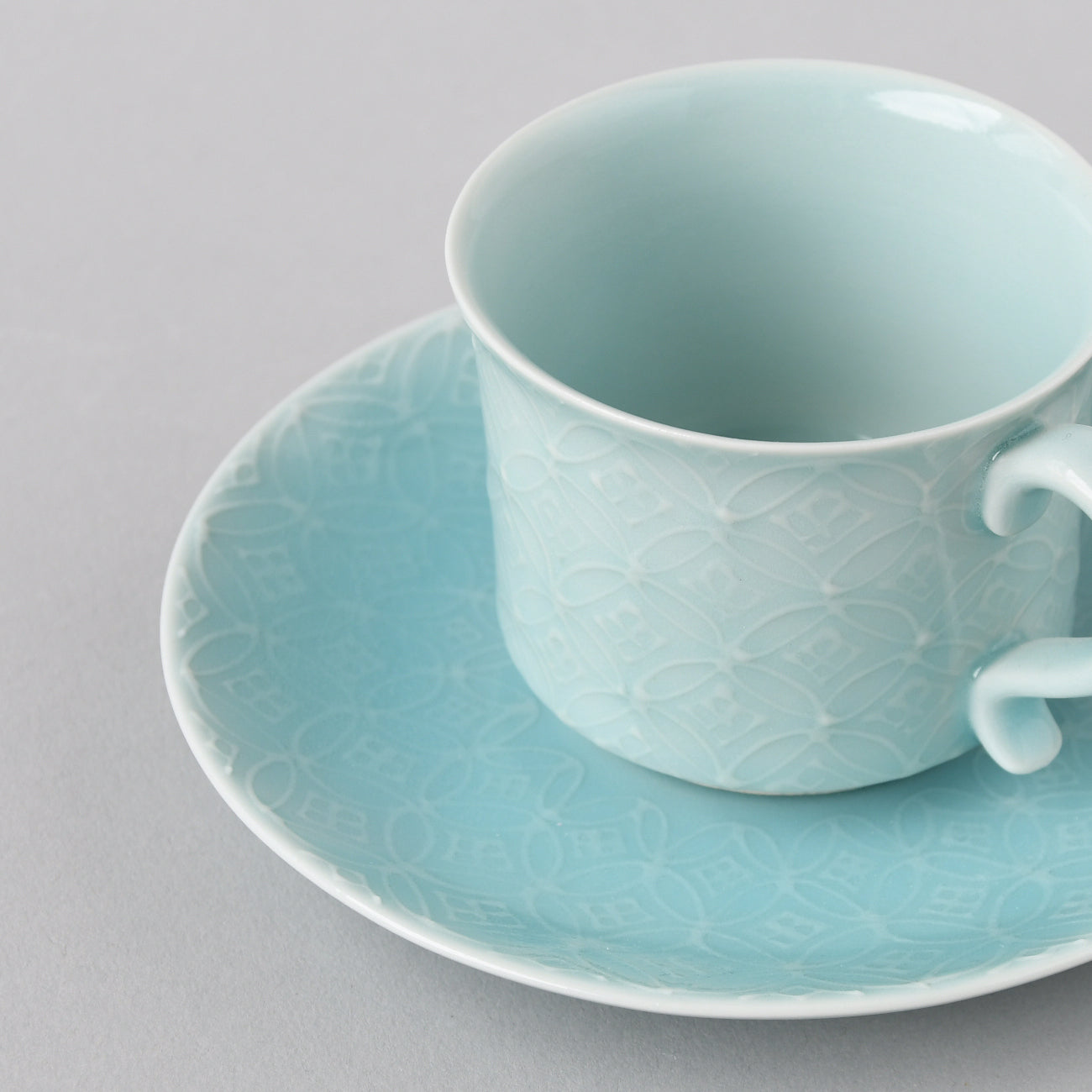 洸春窯の代名詞の「いっちん」の技法を用いて、青磁に七宝文様がうっすらと浮かぶように描かれたカップ&ソーサー。