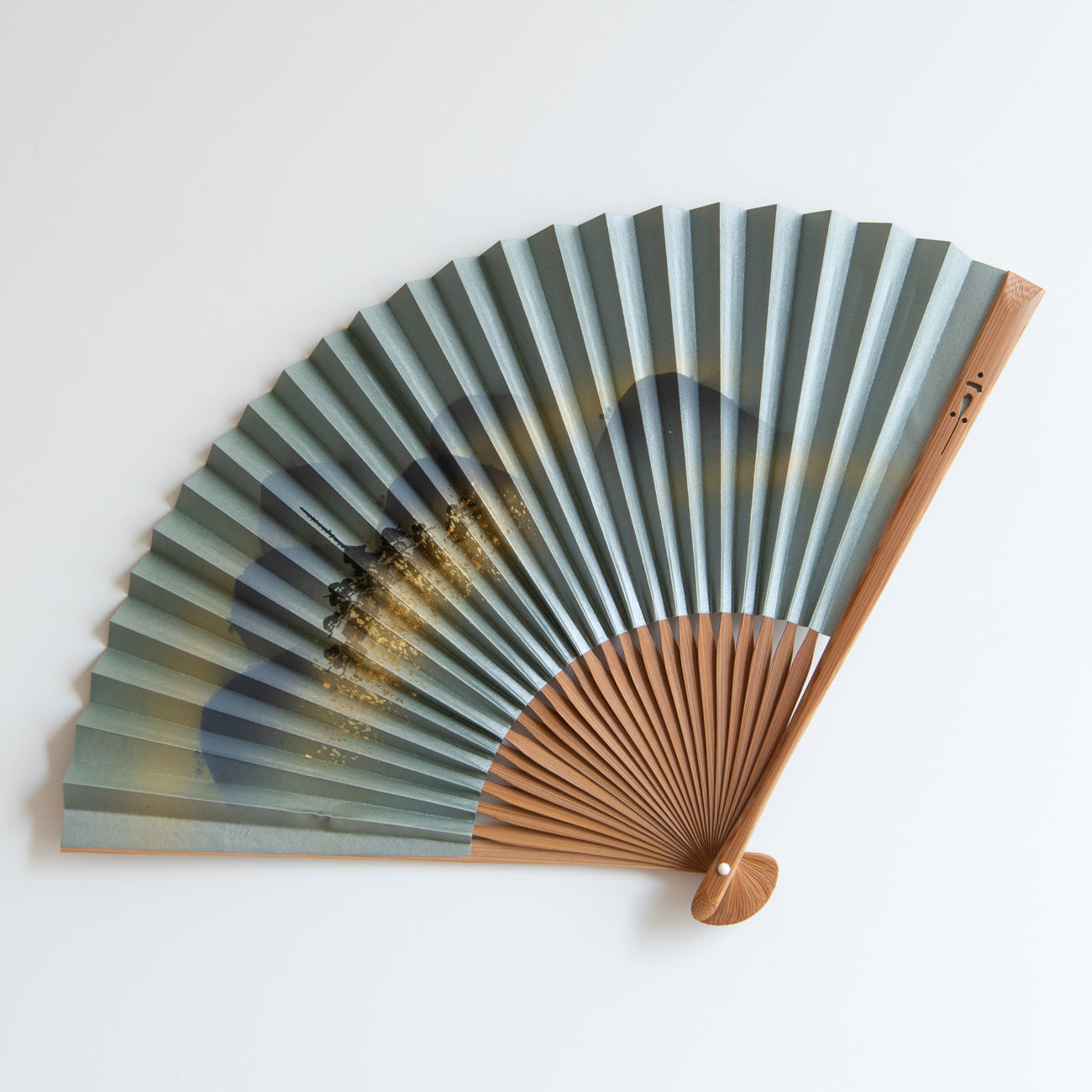 扇骨の親骨には「京」の文字の透かし彫りと扇面の端を縁取った金彩が施され、品と清涼感をより一層強めています。