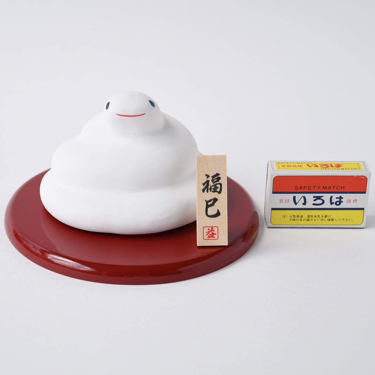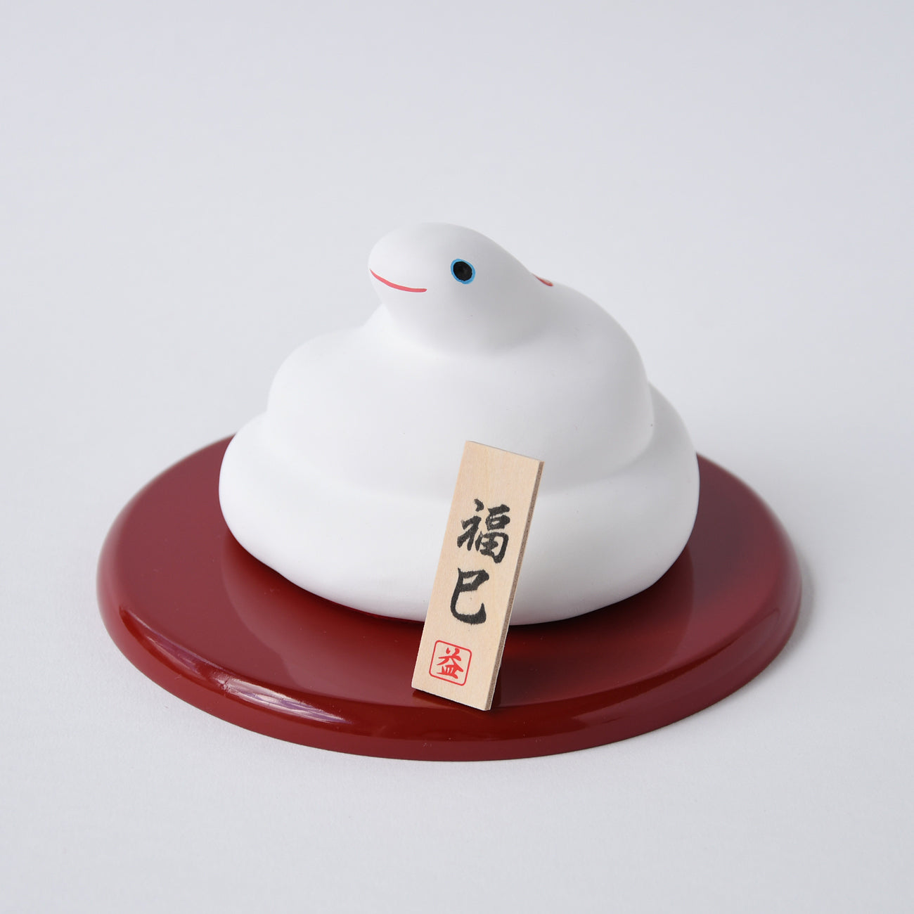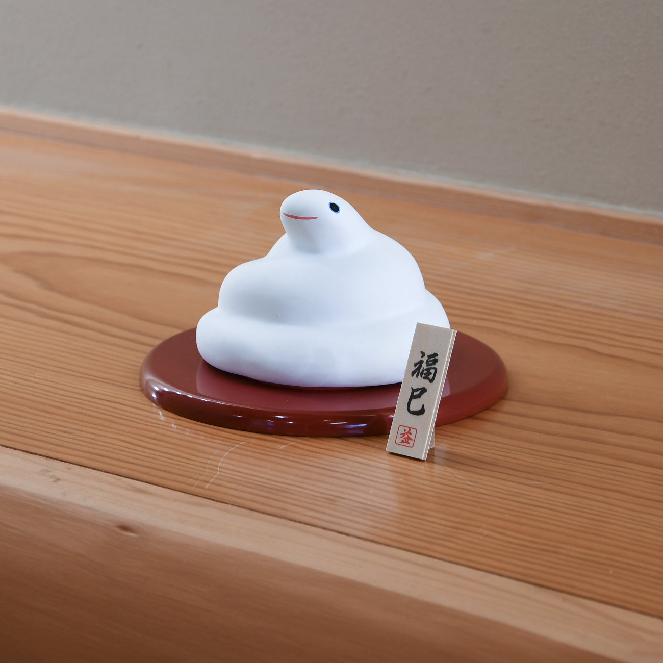 小田益の干支の人形は粘土の鋳込み技法で素焼き焼成。神の使いと云われる真っ白な蛇。お鏡さんのようでもありますね。