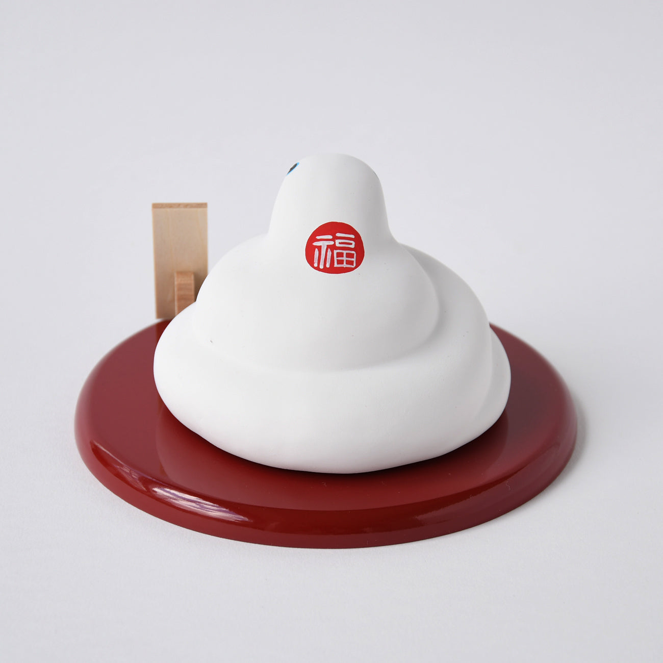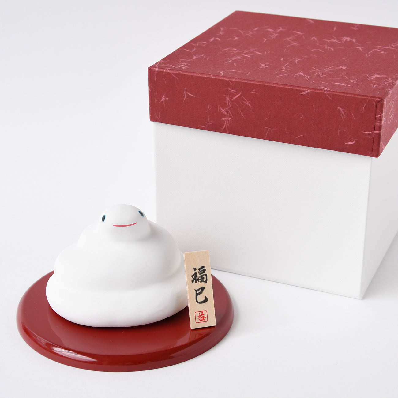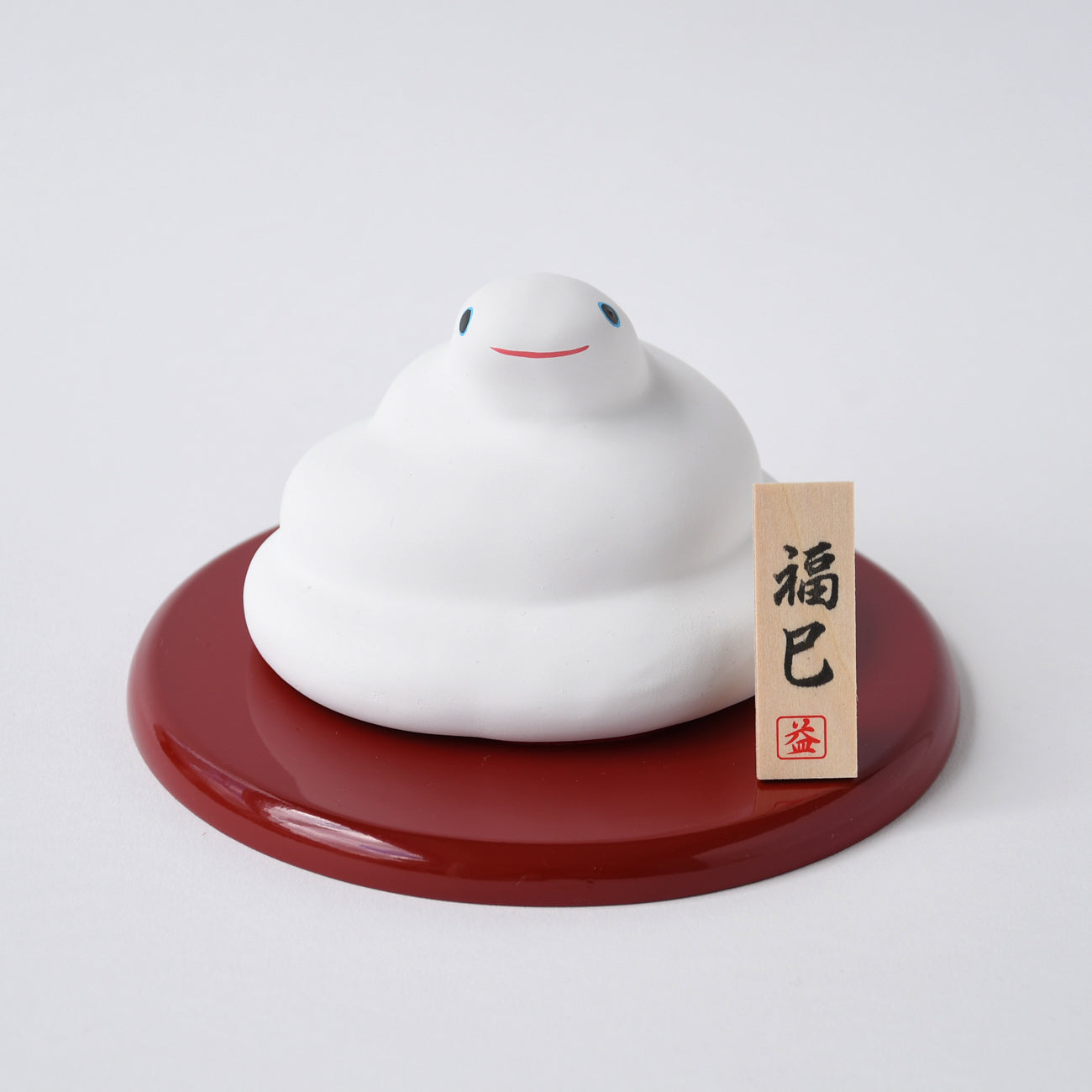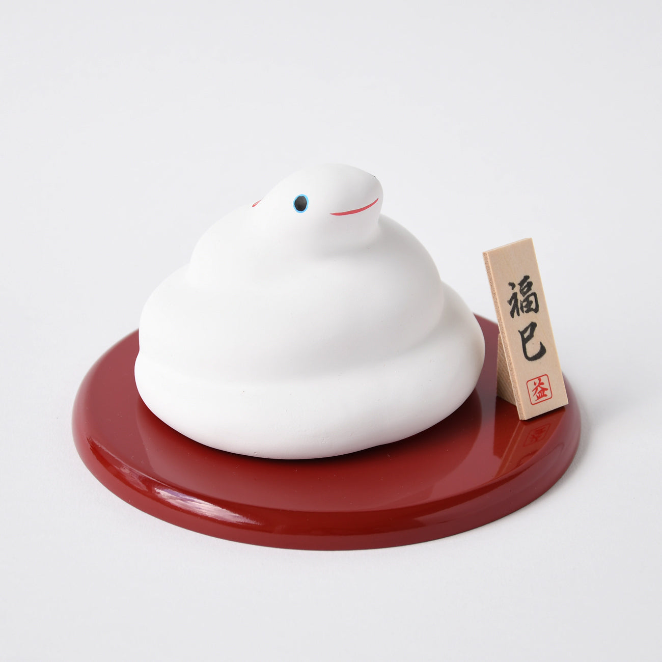 小田益の干支の人形は粘土の鋳込み技法で素焼き焼成。神の使いと云われる真っ白な蛇。お鏡さんのようでもありますね。