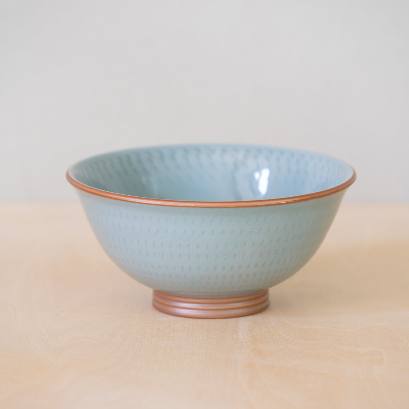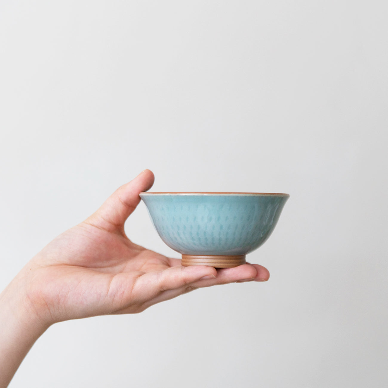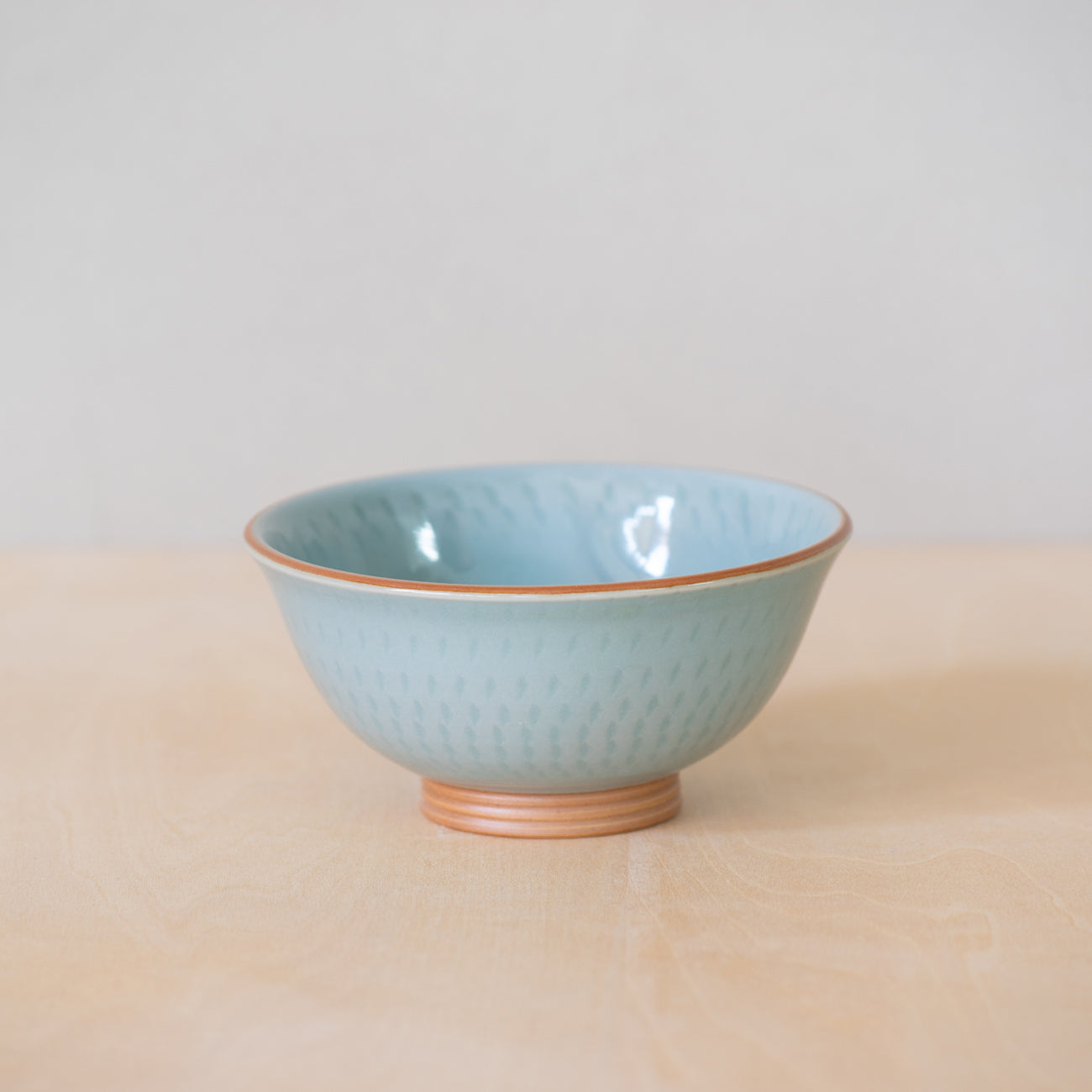 練り込み青磁の生地に古時計のゼンマイを加工した工具を用い”飛鉋”を入れたお茶碗です。