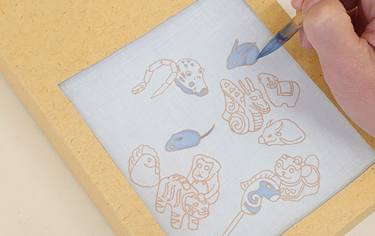柄には、彩色がしやすいように、あらかじめ柄の輪郭に糯米を主とした糊が置いて(付着させて)ありますので、その糊が堤防の役割をして彩色した色が滲み出るのを防いでくれます。